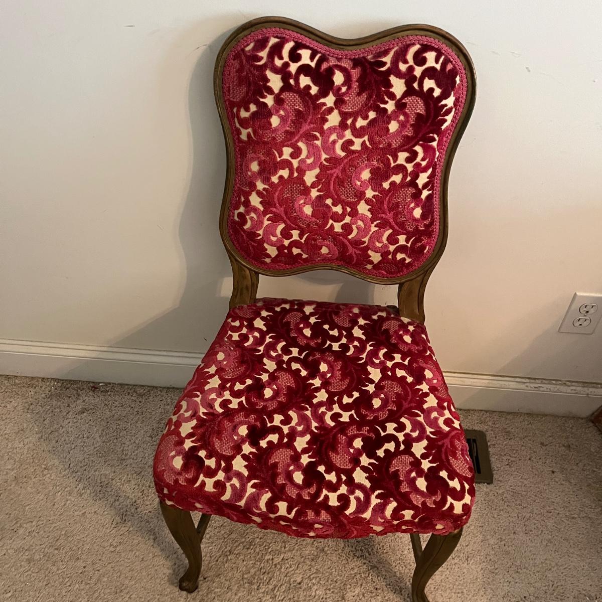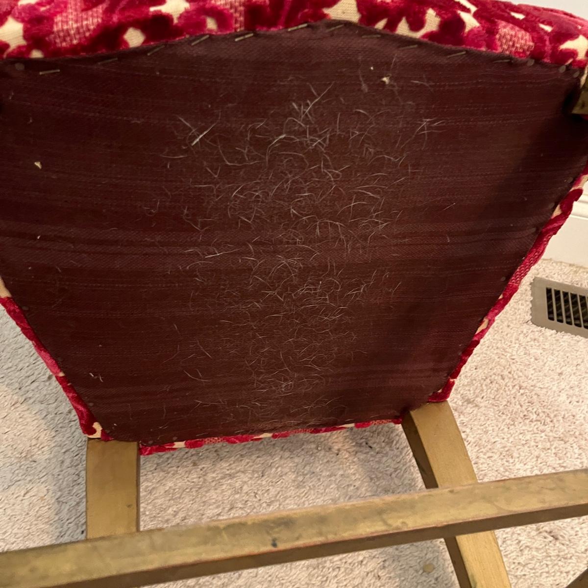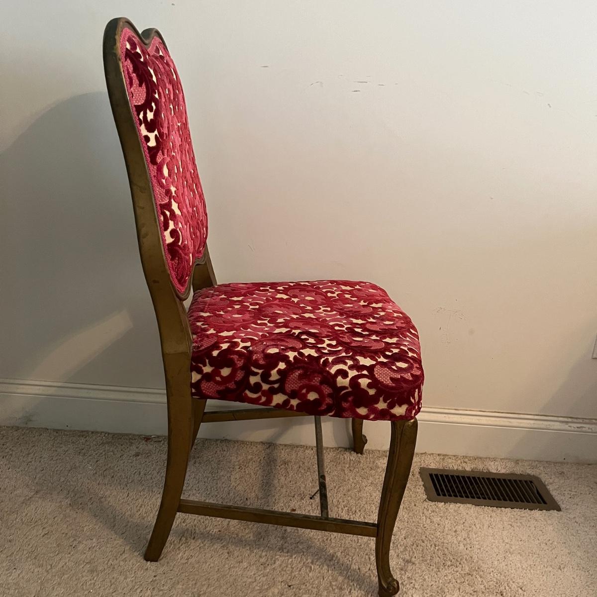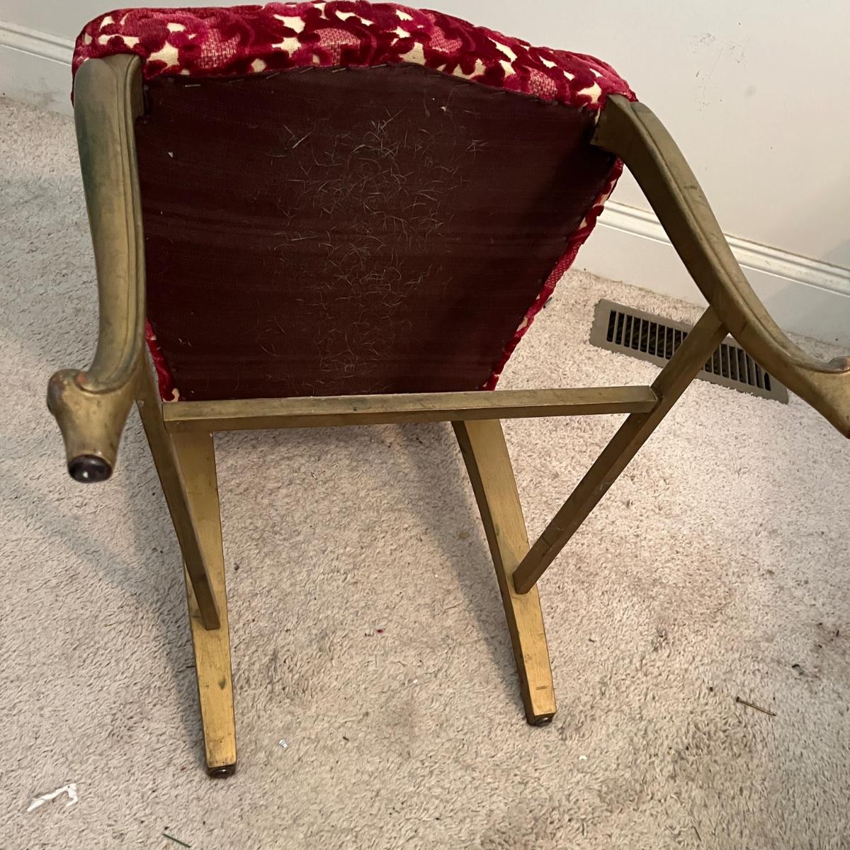 Lot includes a painted gold wooden framed chair with an upholstered and padded seat and back. Chair measures 19” x 18” x 34”H with a 17.5”seat height. Underneath seat has pet hair, see pictures.