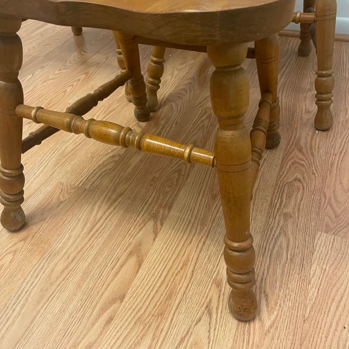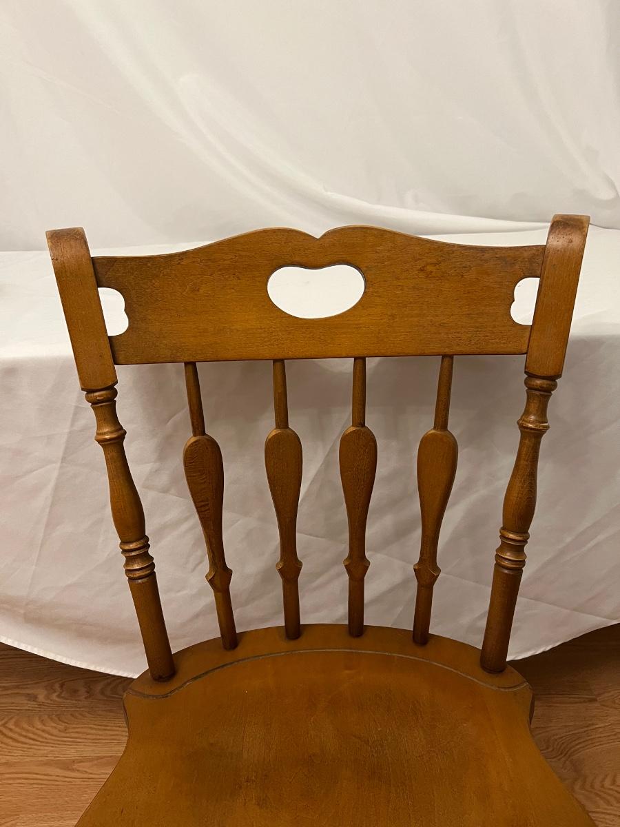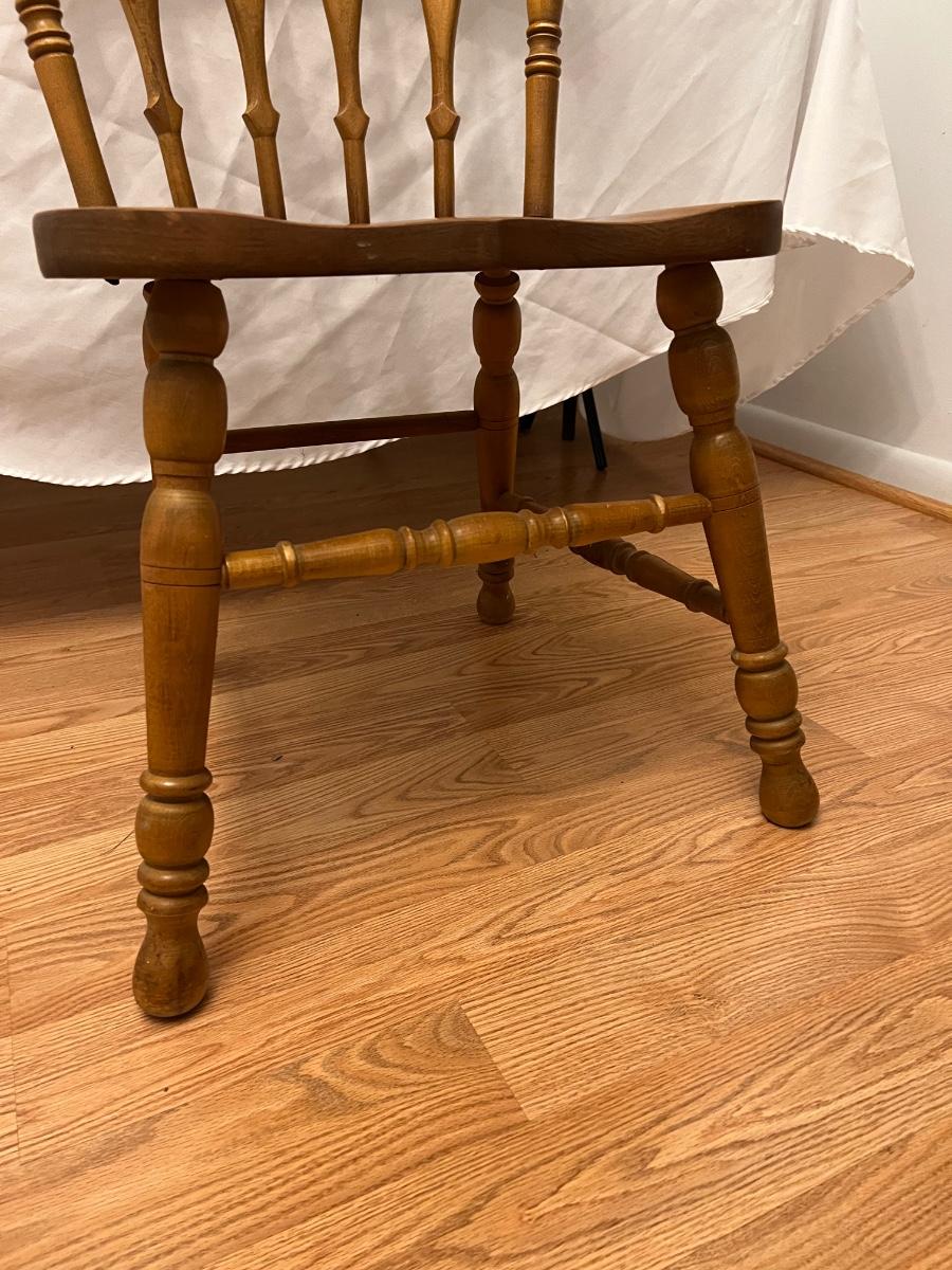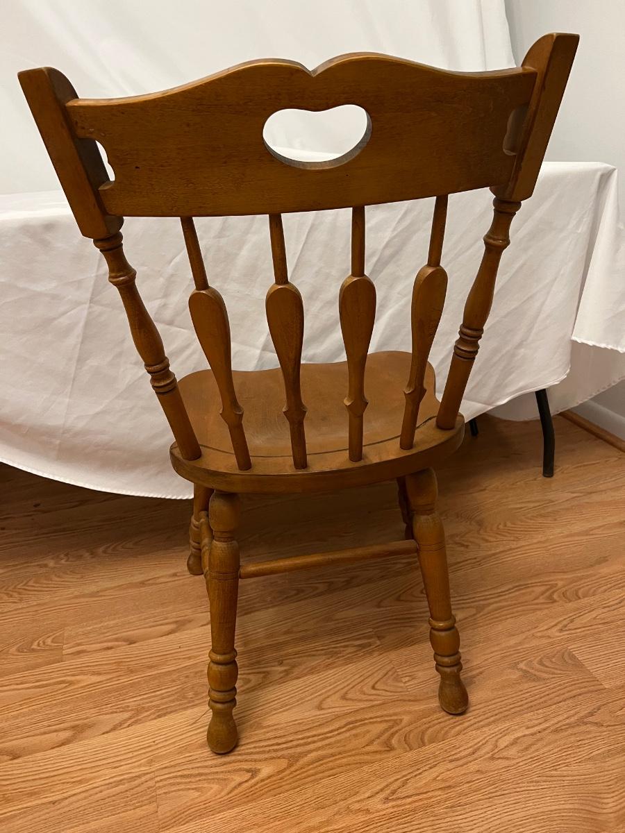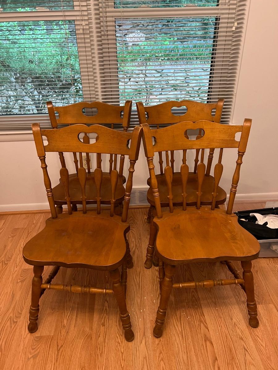 This lot includes four high quality, identical wooden chairs. They’re a little scratched around the feet and the handles on top.