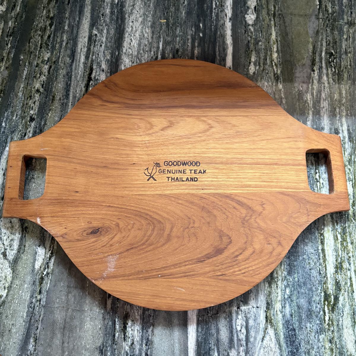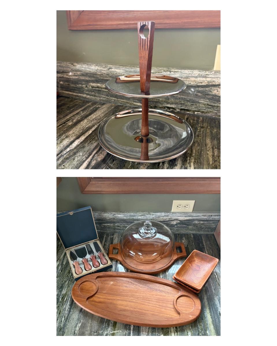 This is a 9piece lot that includes several different wooden charcuterie bowls and platters from Kamani Wood, Crate & Barrel, and Goodwood. There are 4 different cheese knives from Laurel Oak Country Club. For reference, the longest piece is the oval platter with measurements of approximately 22" x 9.5". There are several blemishes. See pictures. This lot also includes an MCM style two-tiered serving tray with a chrome finish and wooden handle.