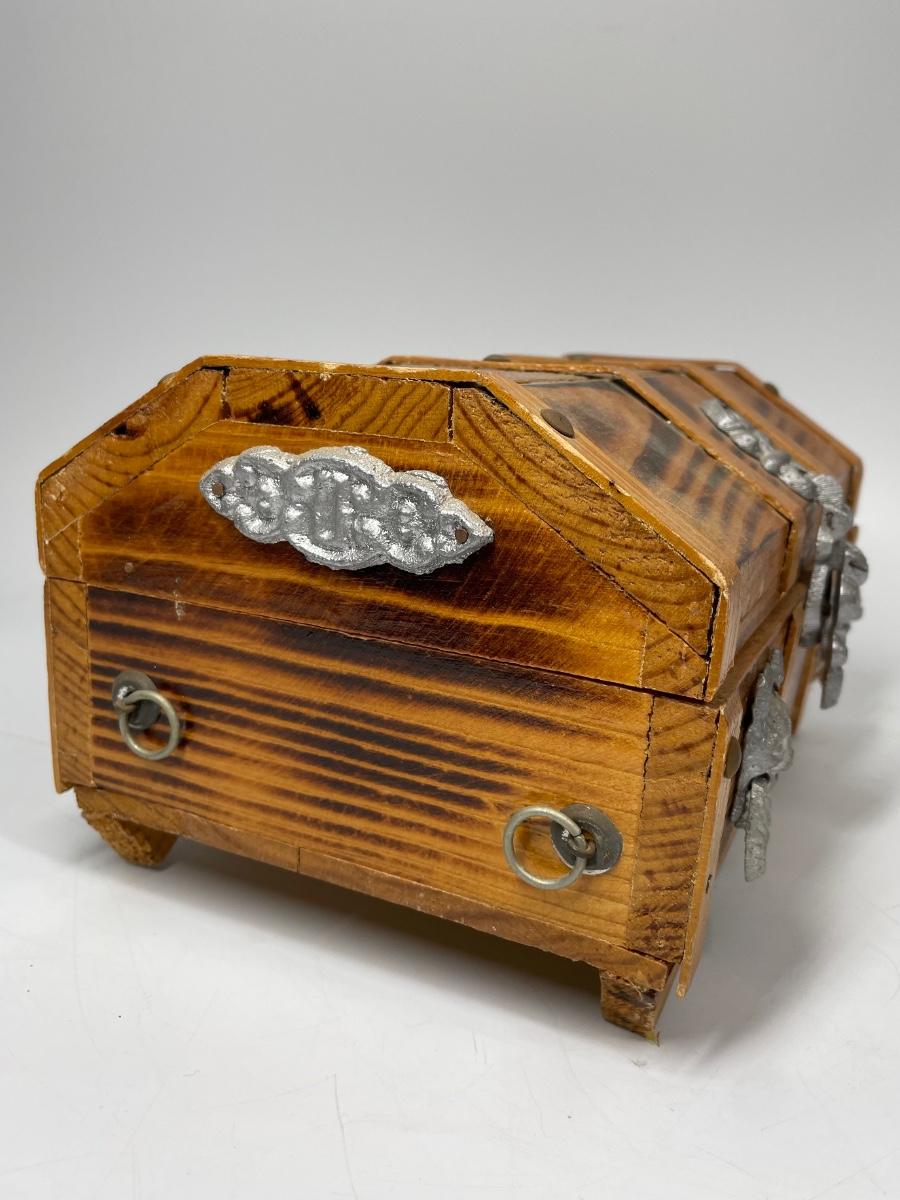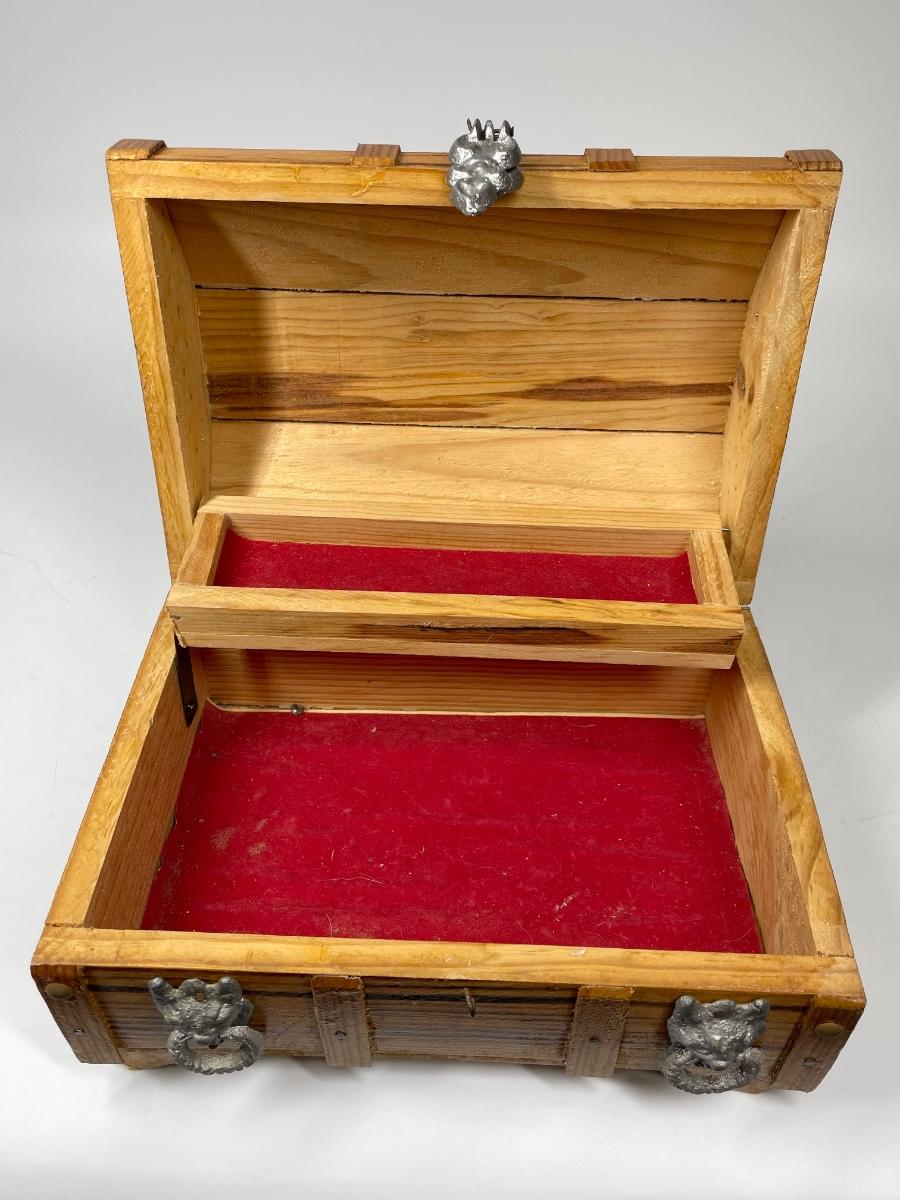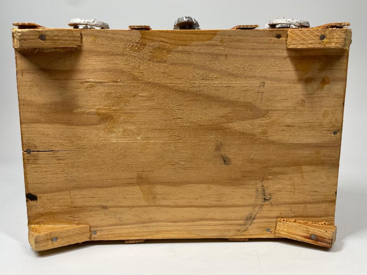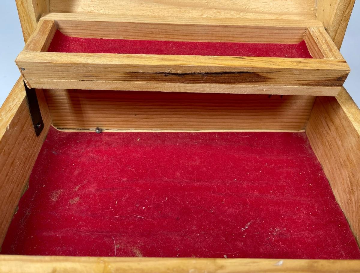 This item is in good condition. The inside lining has small bubbles in it and is a little dusty due to years of ownership. The box has a hard time standing on its own and may tip over when opened up. It is approximately 9” wide.