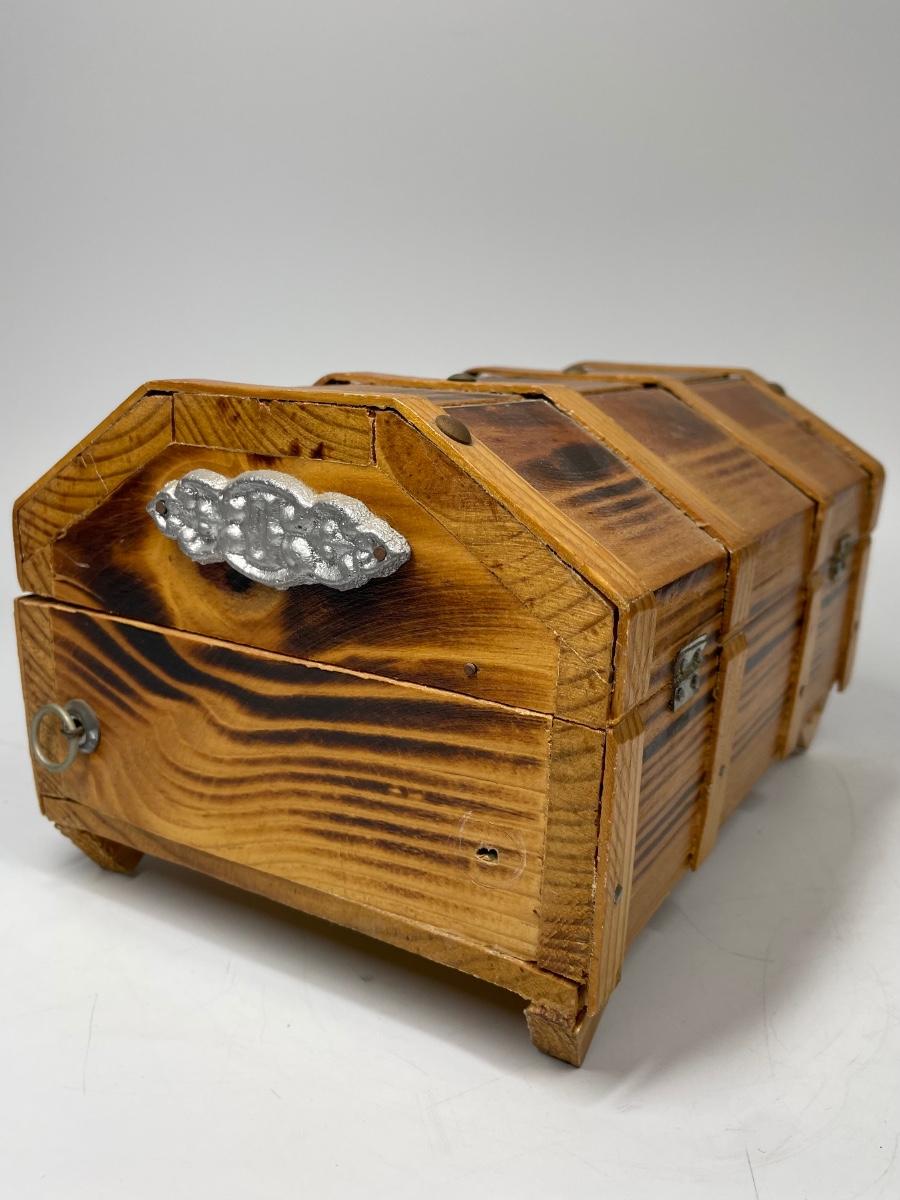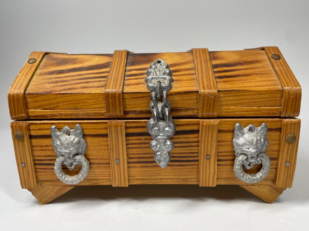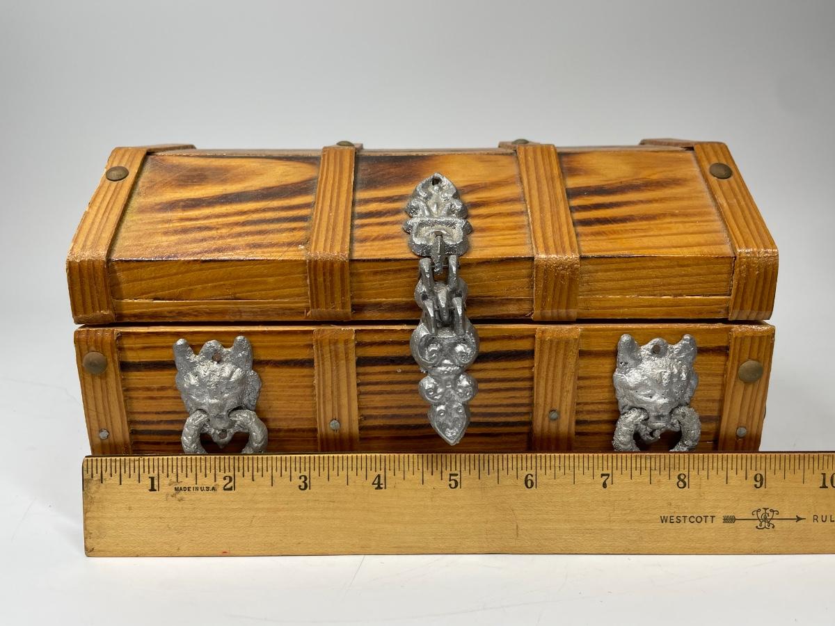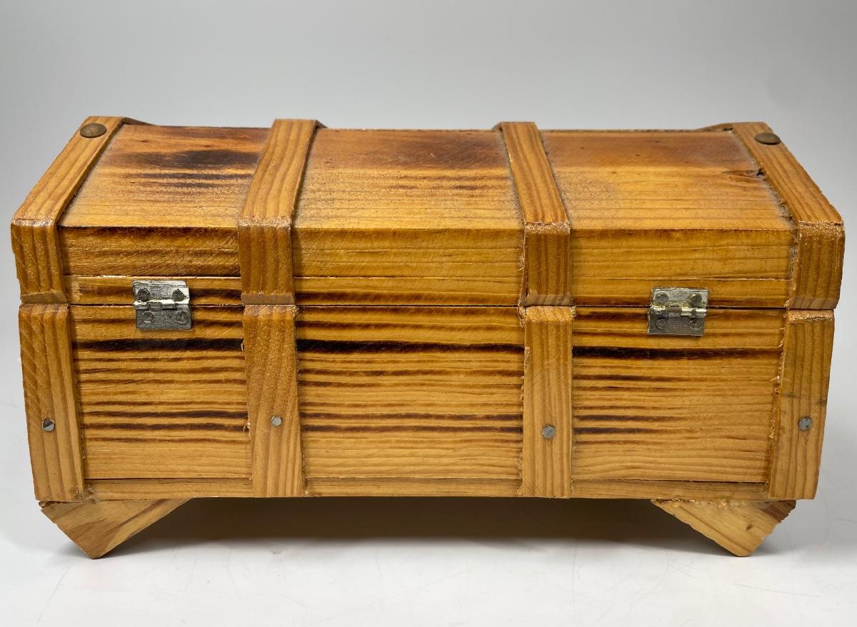 This item is in good condition. The inside lining has small bubbles in it and is a little dusty due to years of ownership. The box has a hard time standing on its own and may tip over when opened up. It is approximately 9” wide.