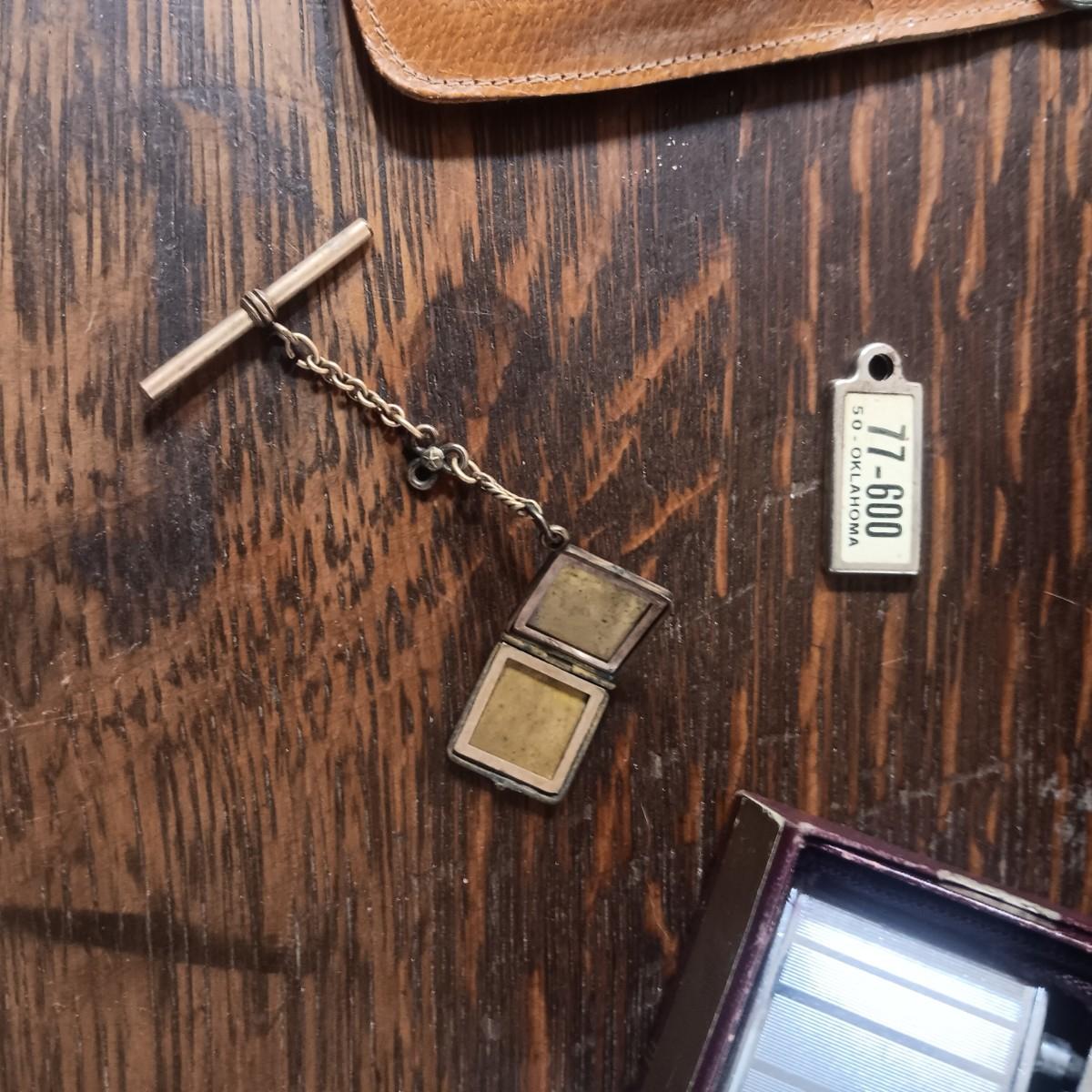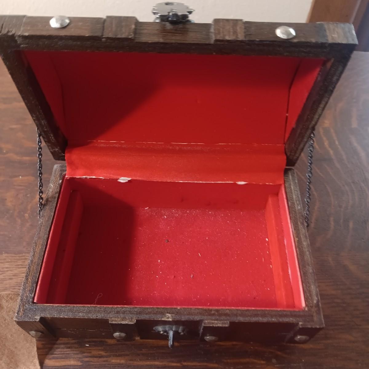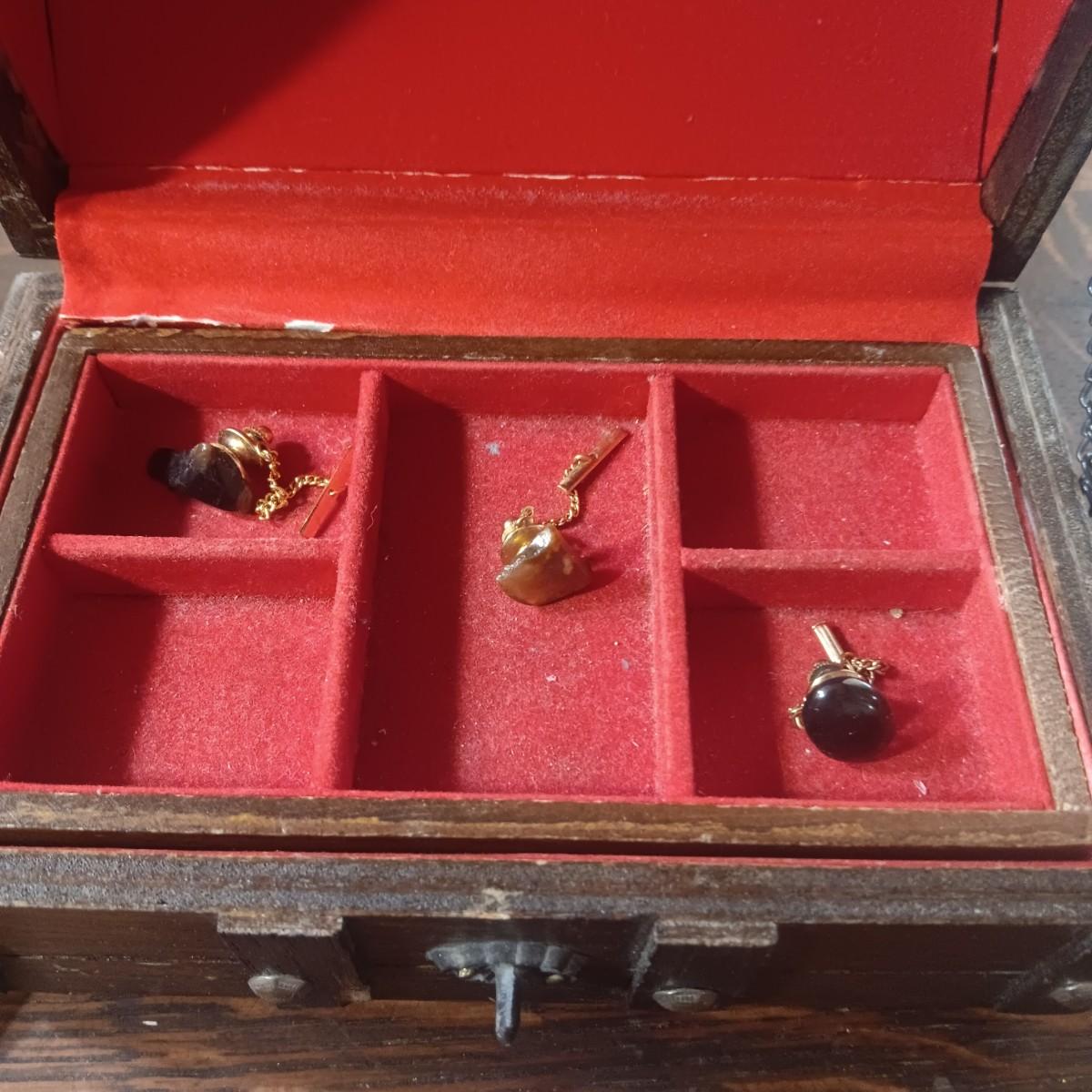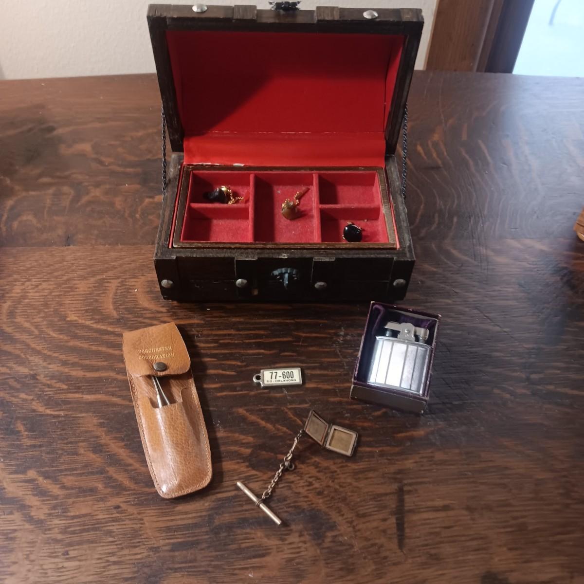 WOODEN CHEST JEWELRY BOX, RONSON LIGHTER, TIE TACKS, LOCKET AND NAIL GROOMING KIT