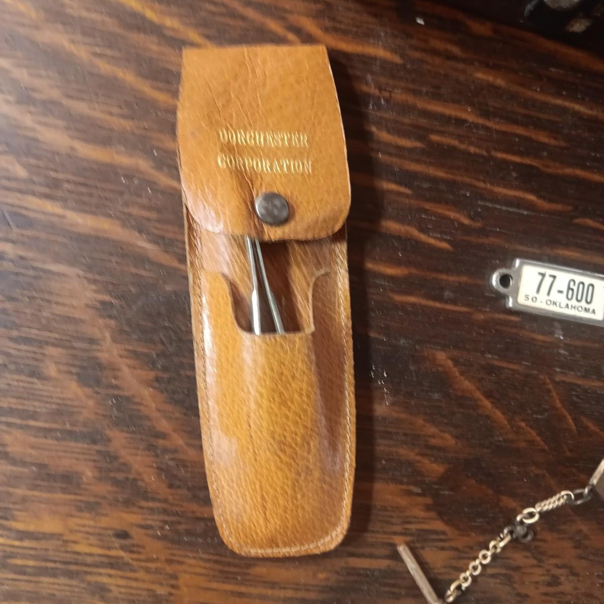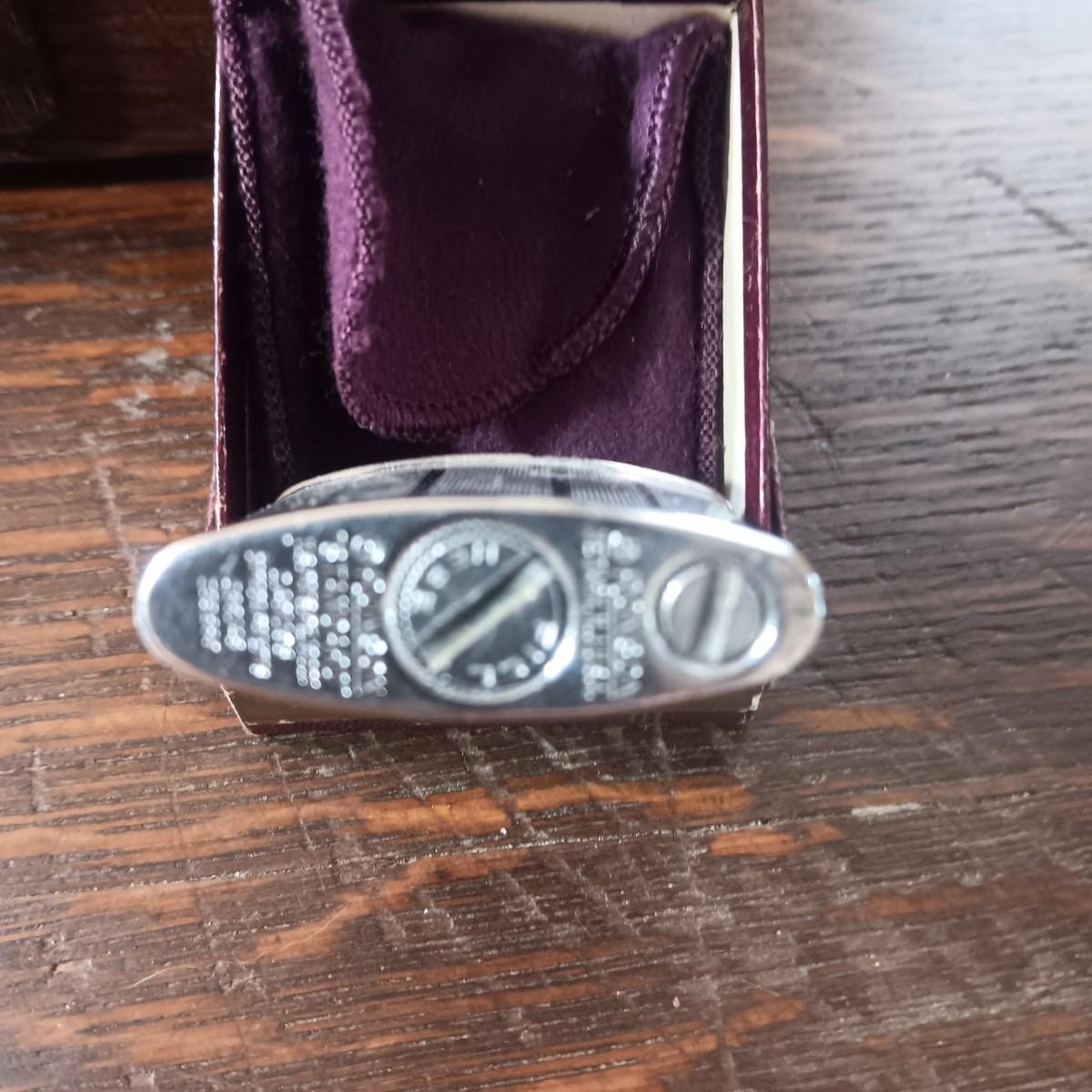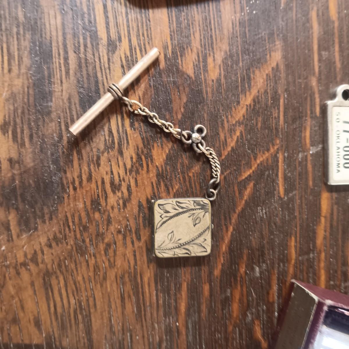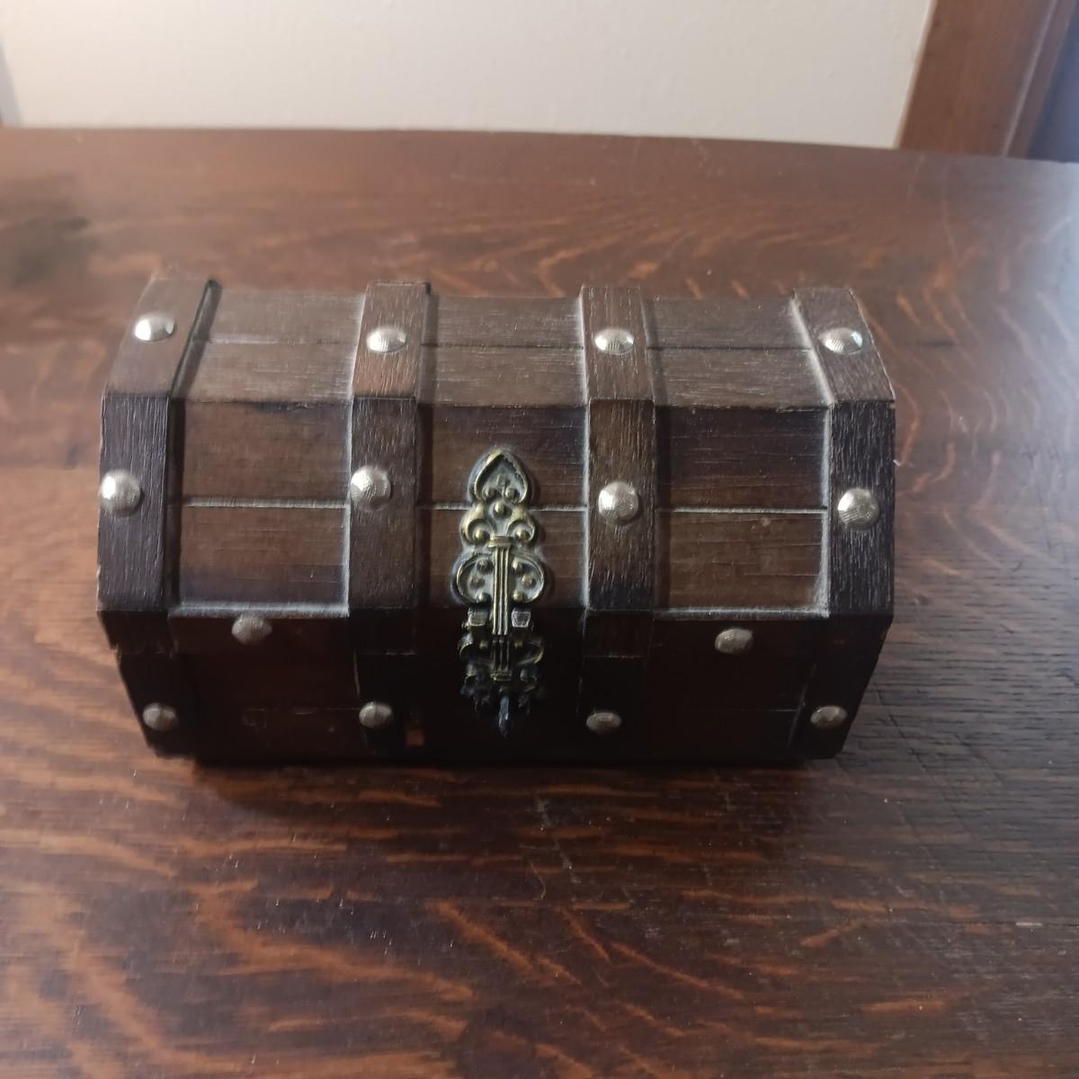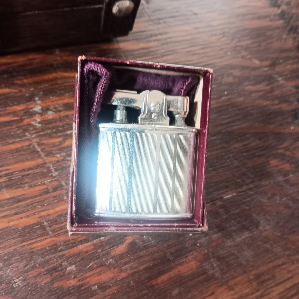 WOODEN CHEST JEWELRY BOX, RONSON LIGHTER, TIE TACKS, LOCKET AND NAIL GROOMING KIT