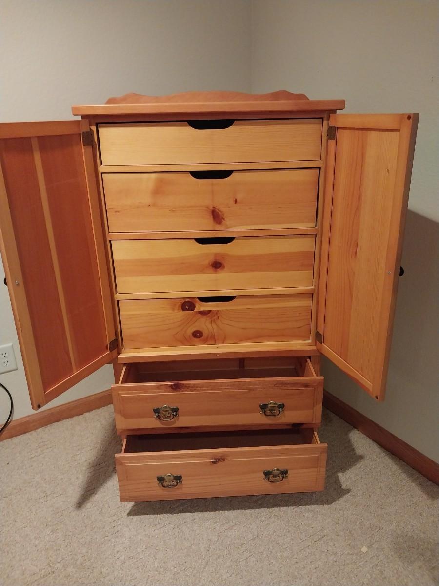 31X16X64 5 DRAWERS, 3 BEHIND DOUBLE DOORS, STURDY BUT NOT HEAVY