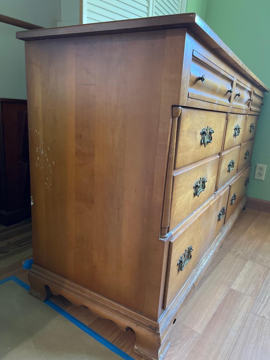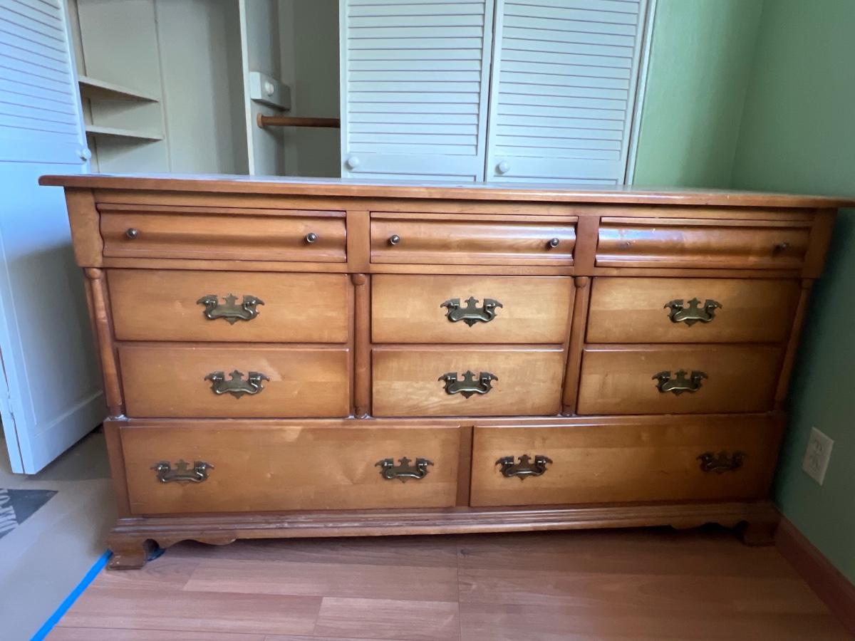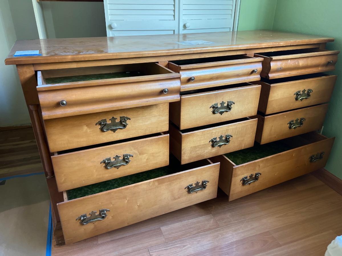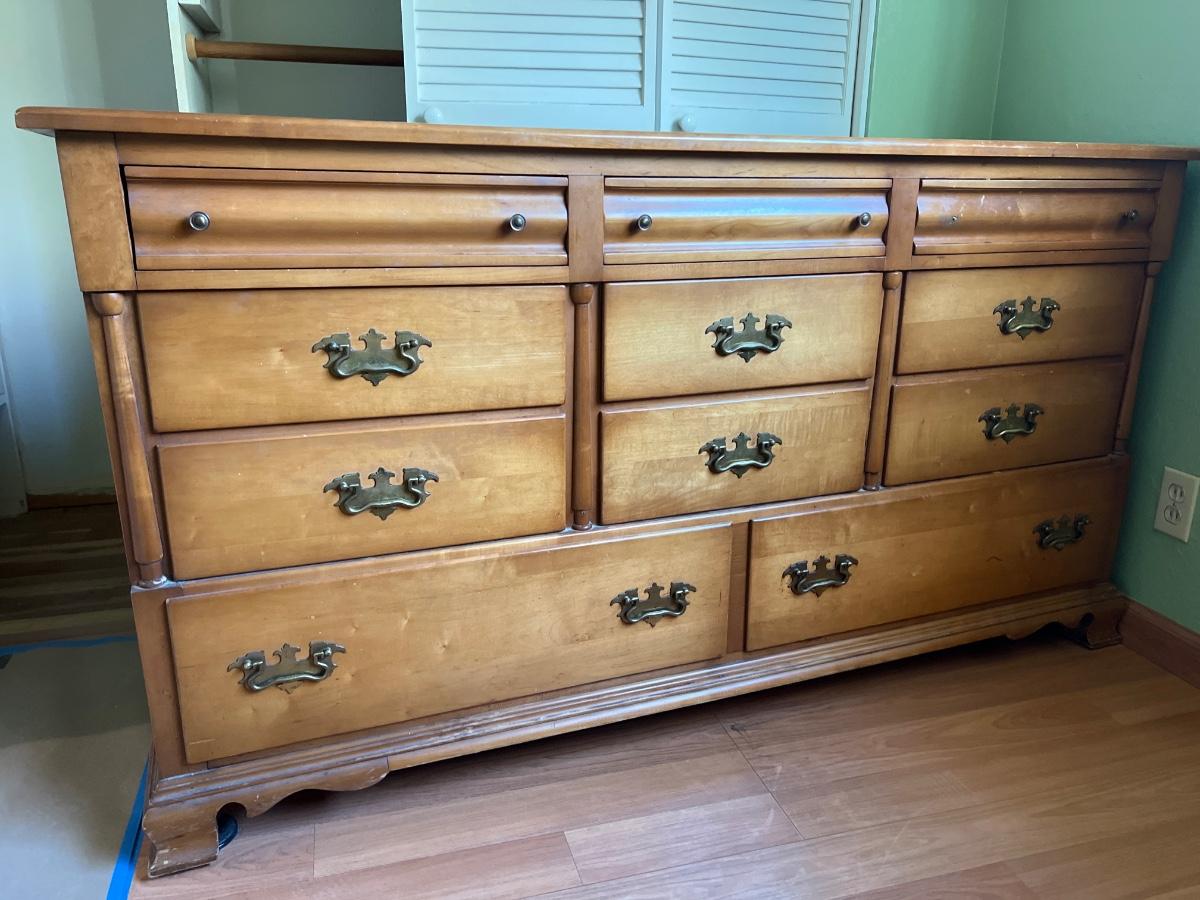 Vintage Dresser Measures 62x20x33” and has damage to top and missing one knob for the top right drawer.Original hardware.