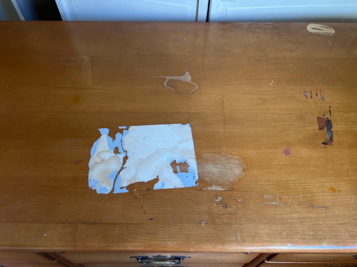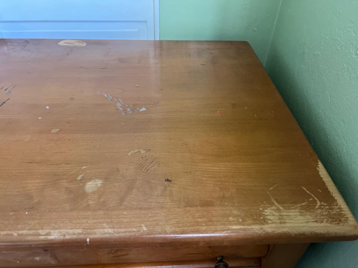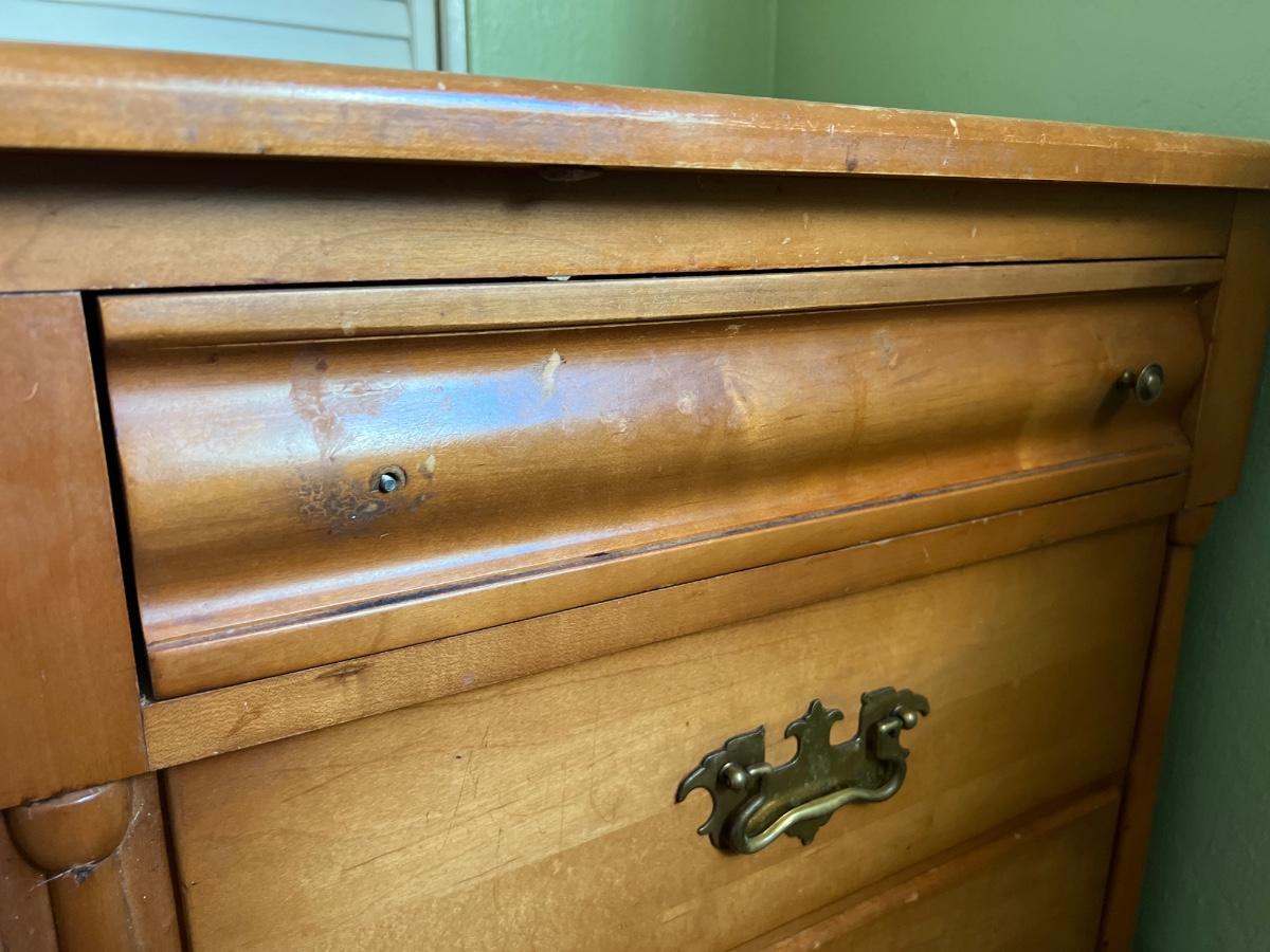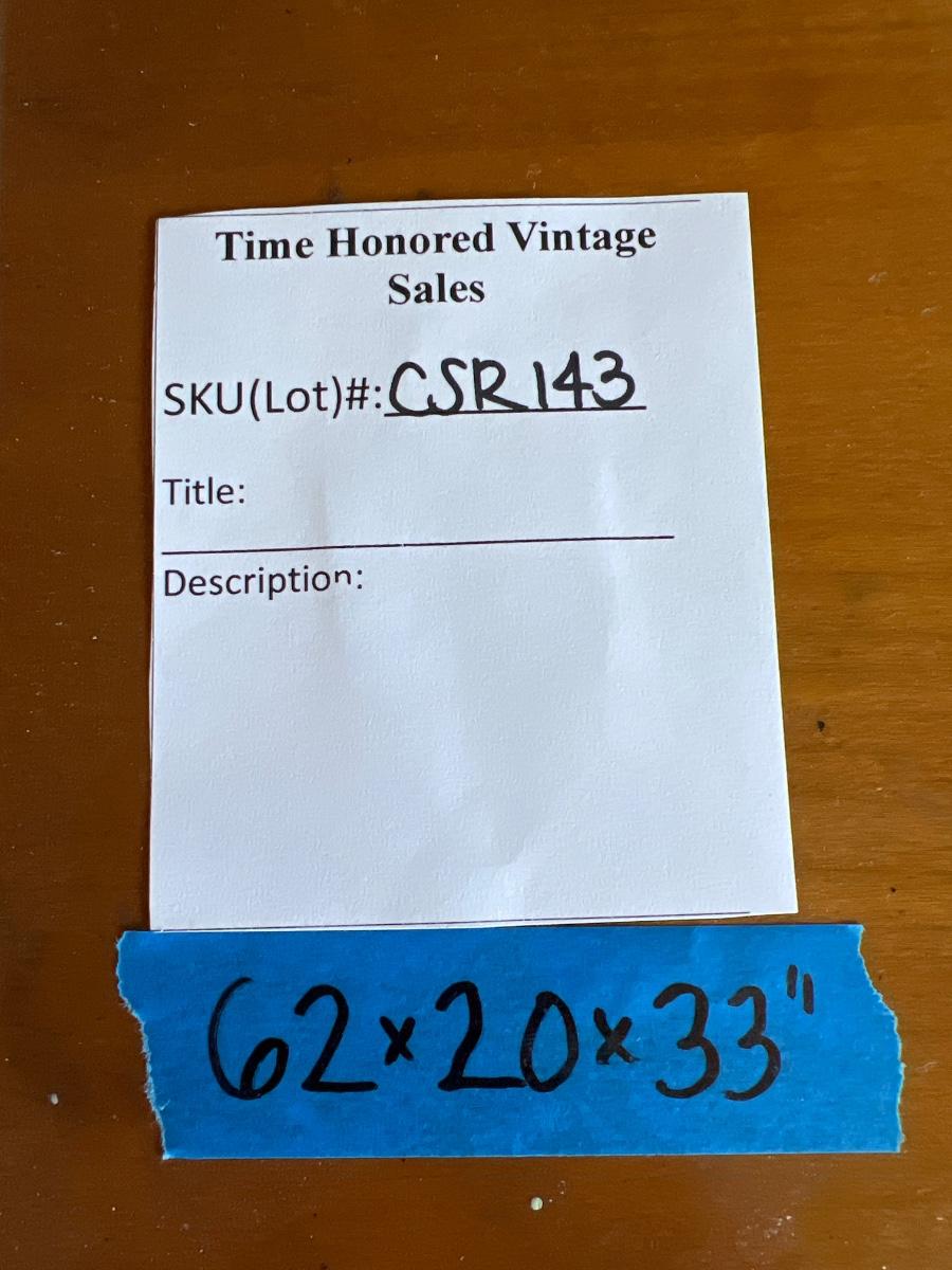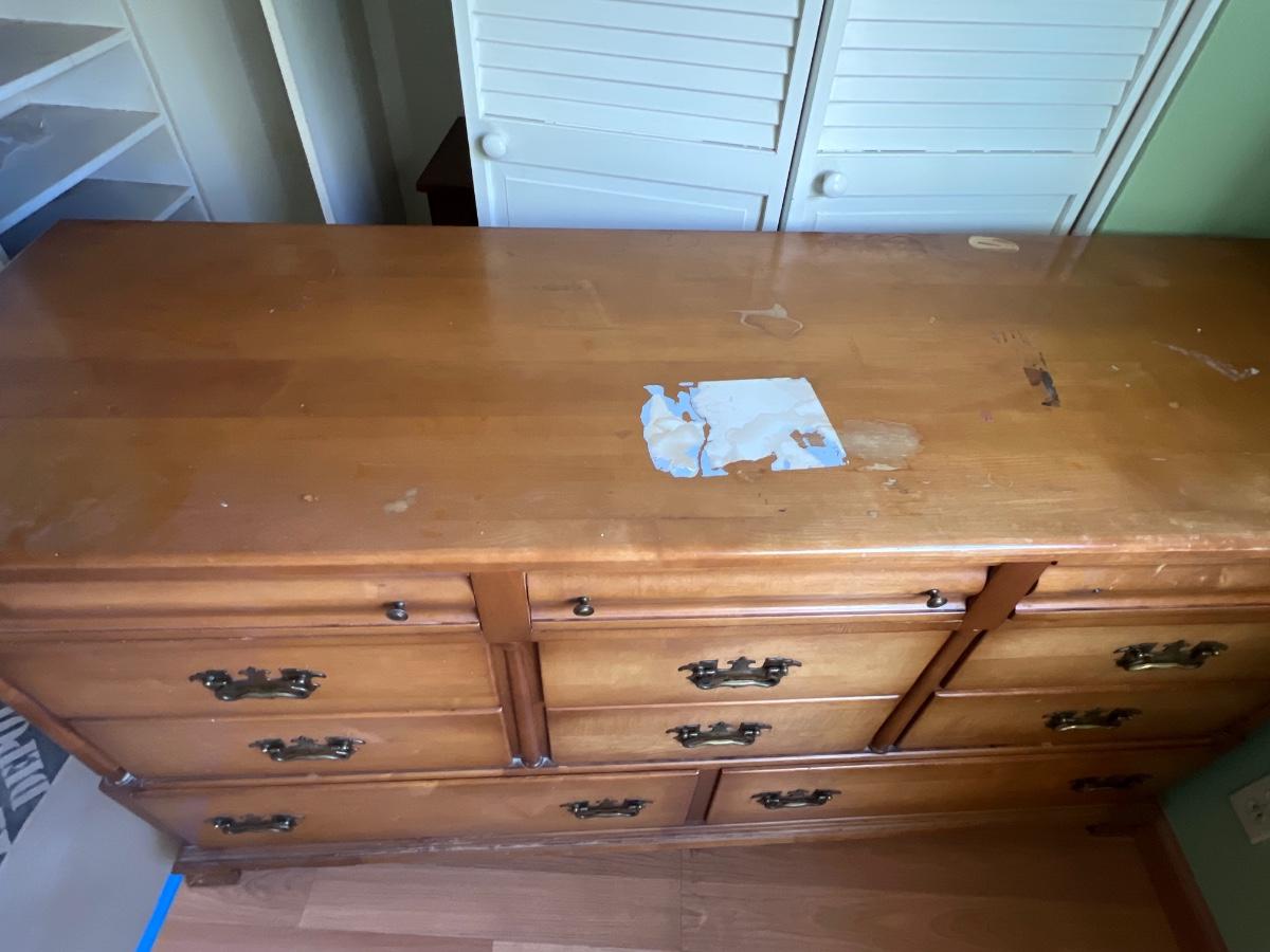 Vintage Dresser Measures 62x20x33” and has damage to top and missing one knob for the top right drawer.Original hardware.