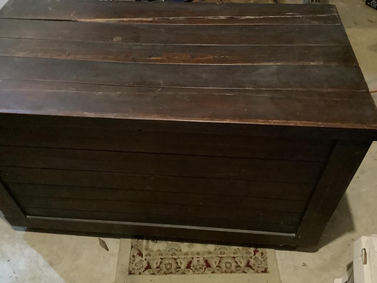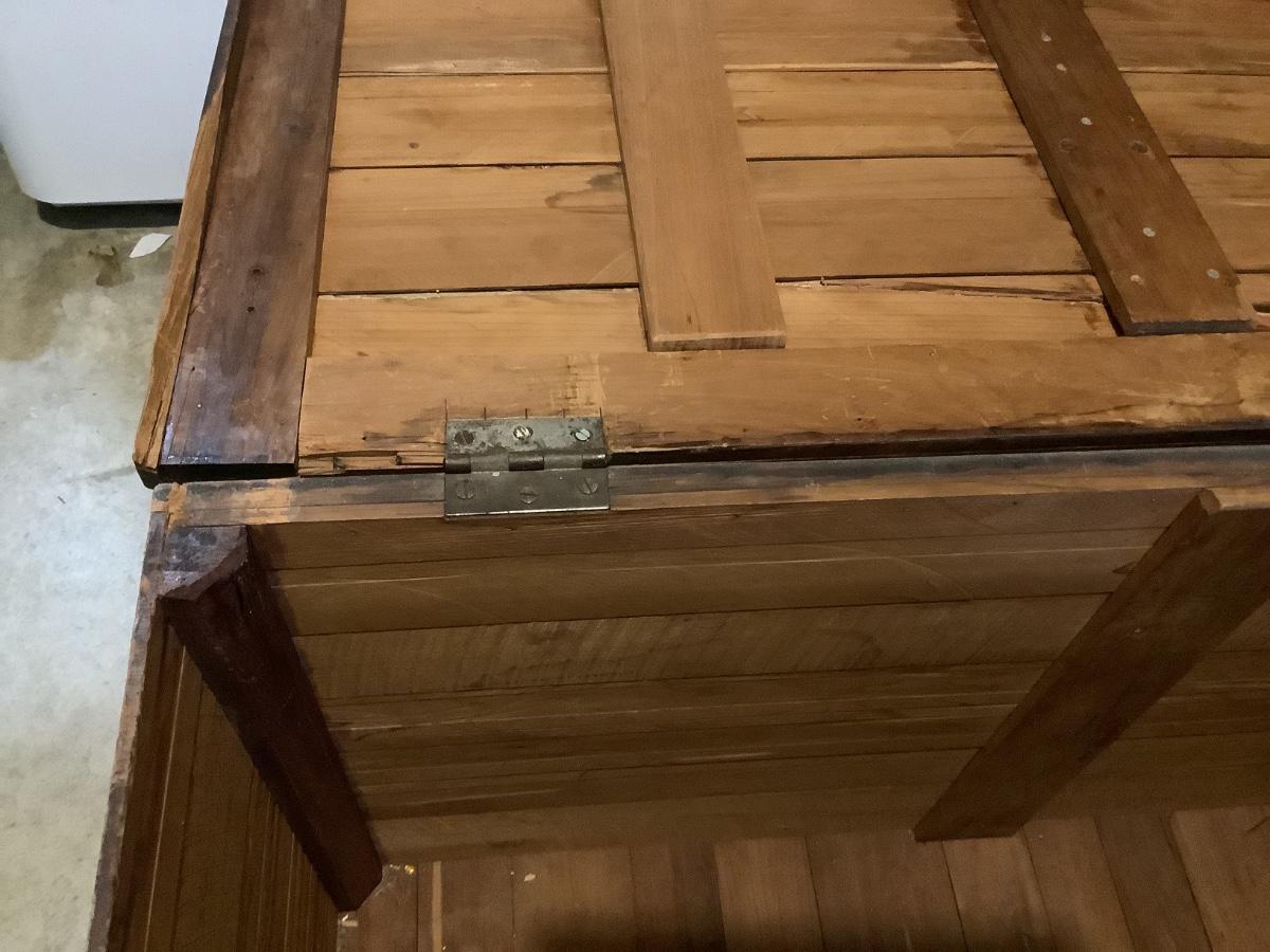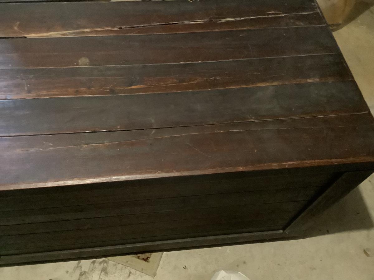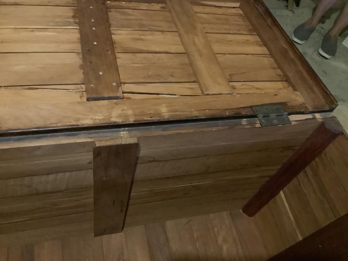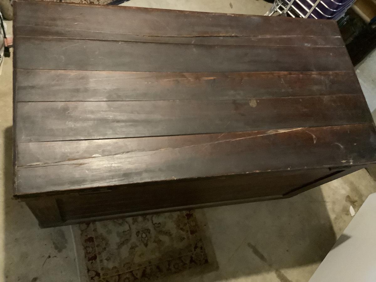 Wooden chest on casters, light weight wood, one split board on top that still holds together, 4 casters