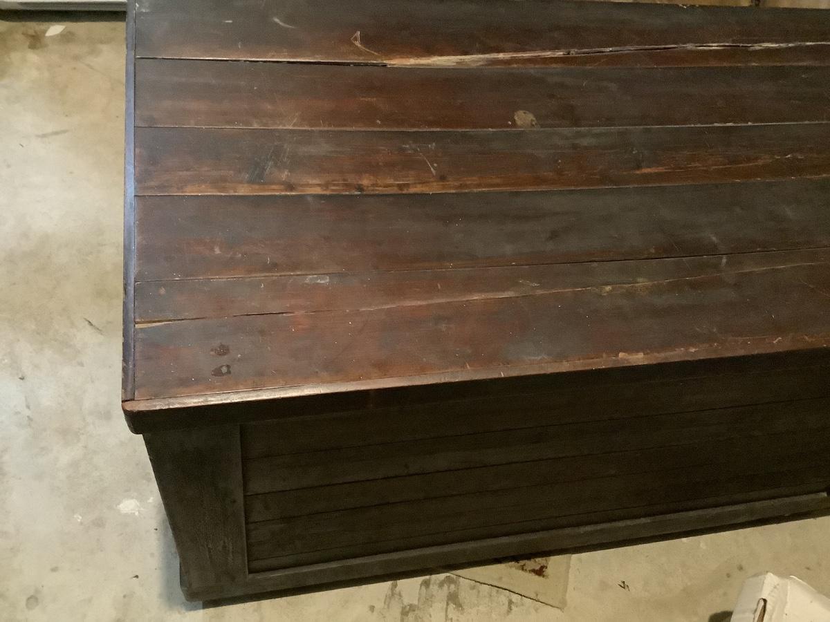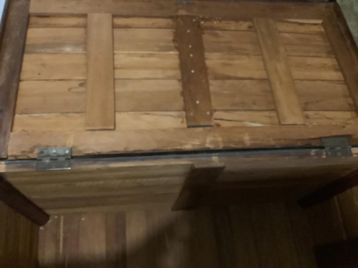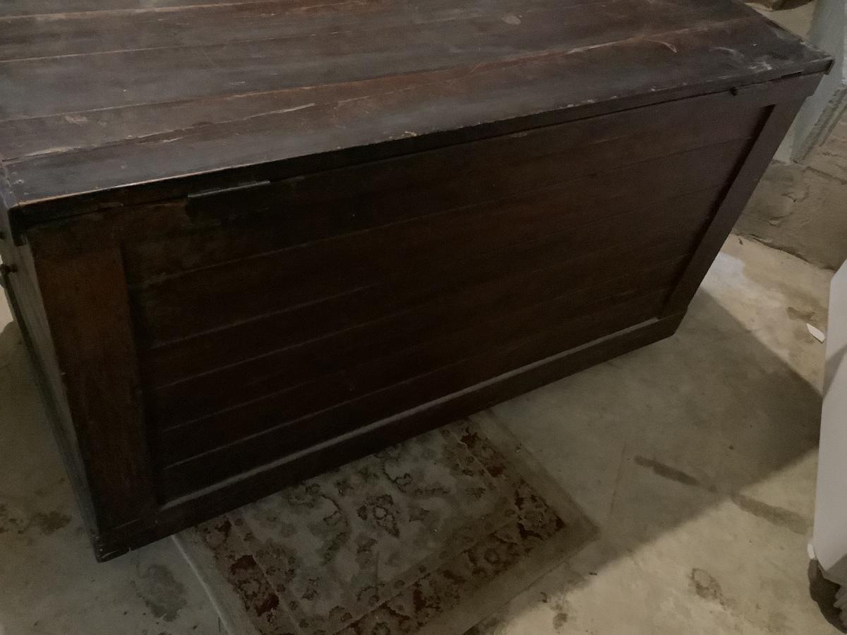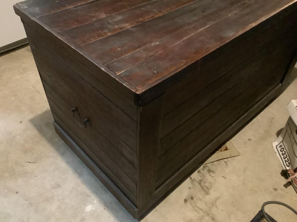 Wooden chest on casters, light weight wood, one split board on top that still holds together, 4 casters