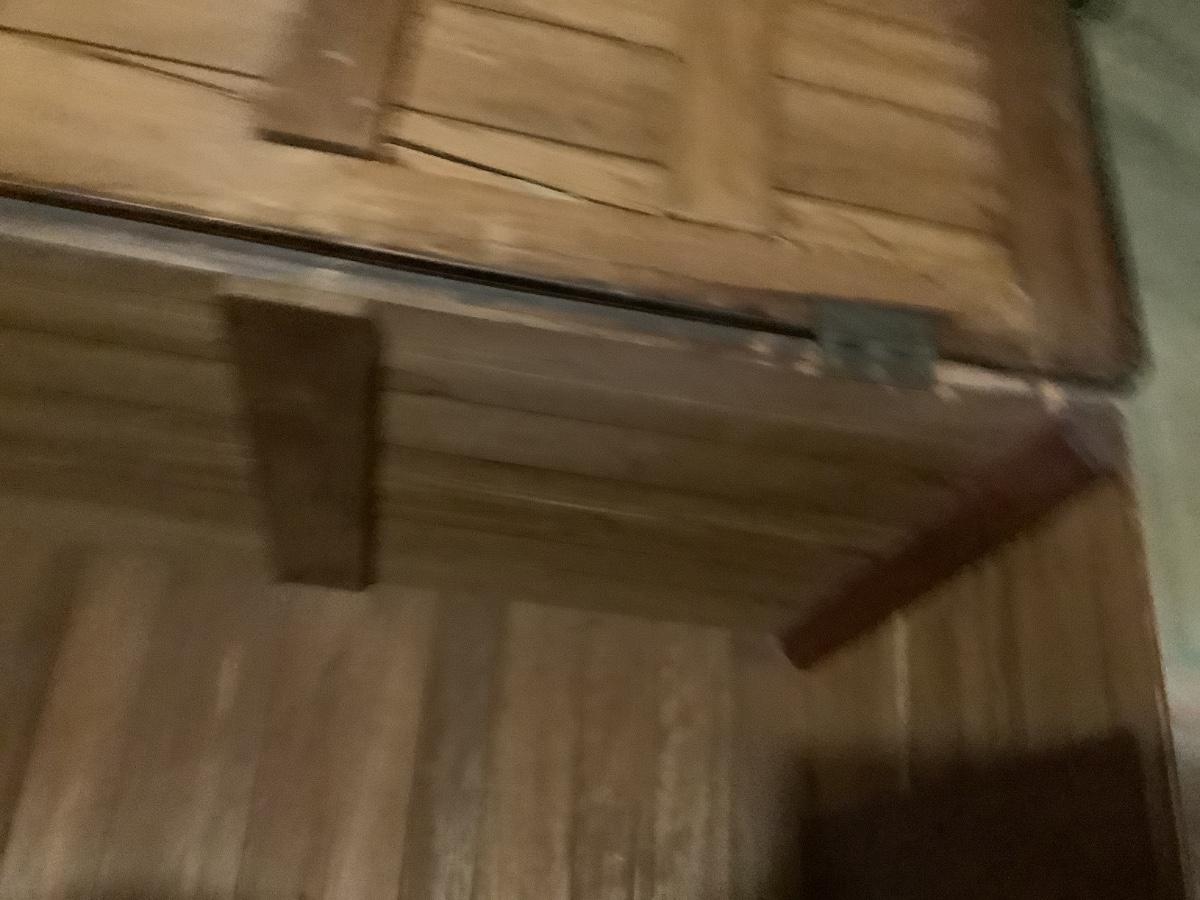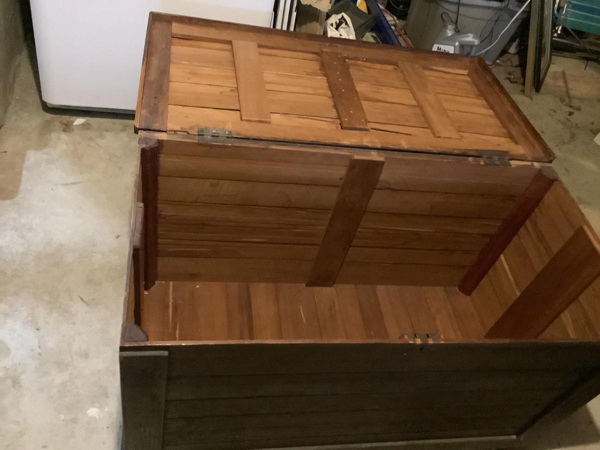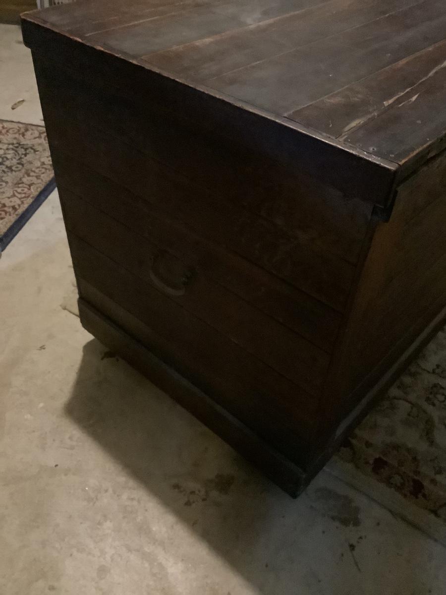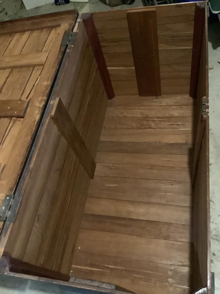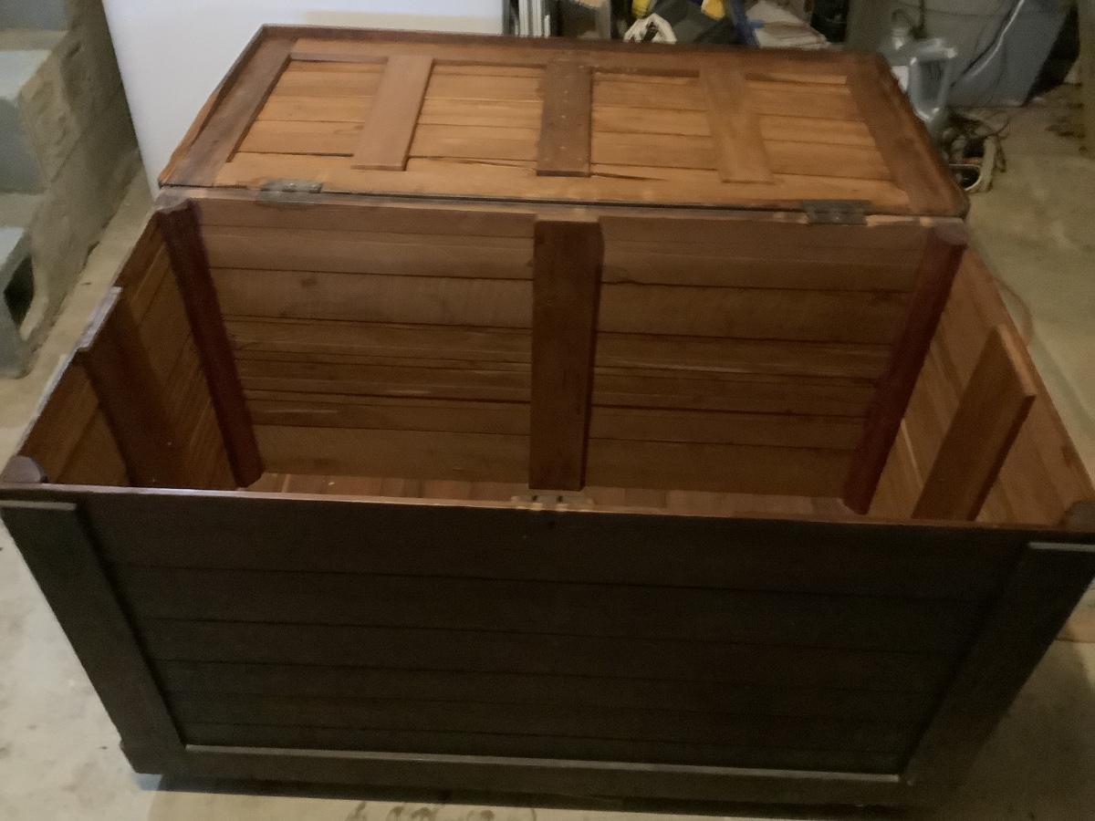 Wooden chest on casters, light weight wood, one split board on top that still holds together, 4 casters