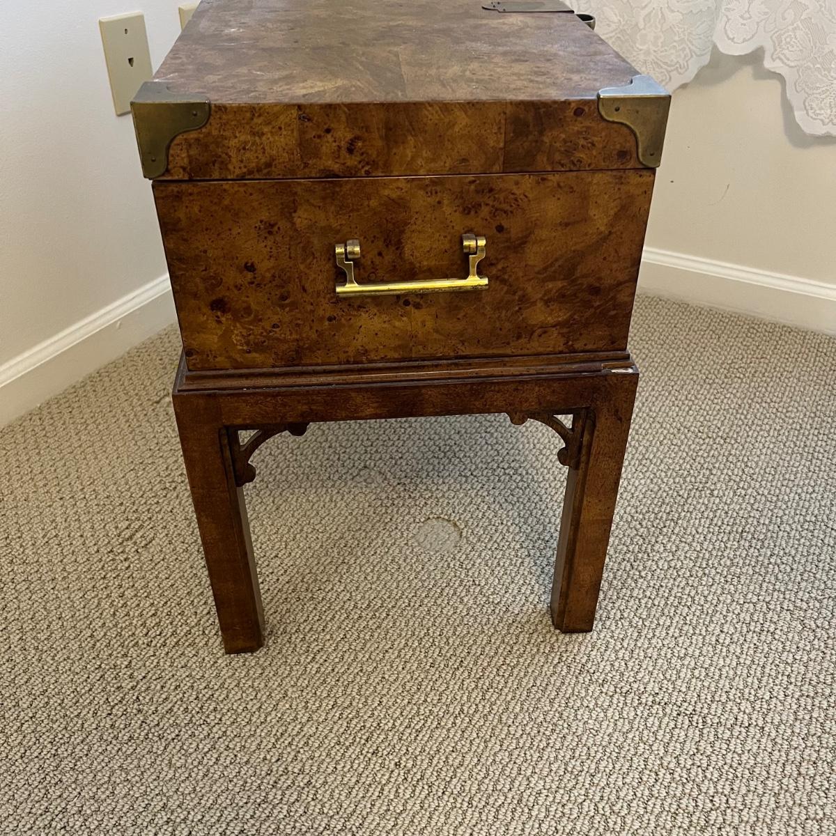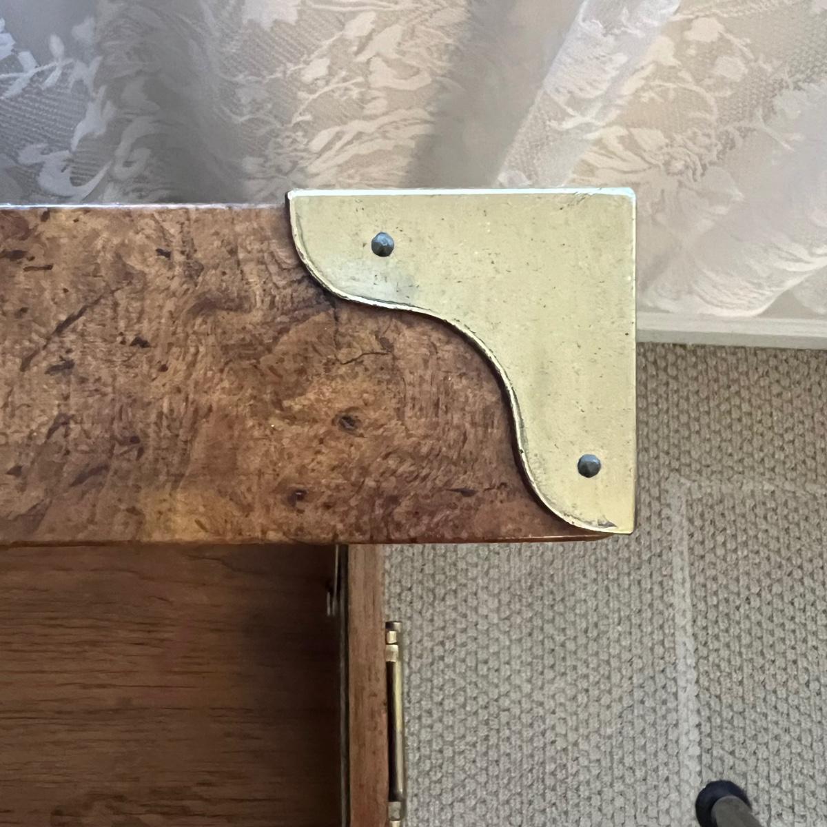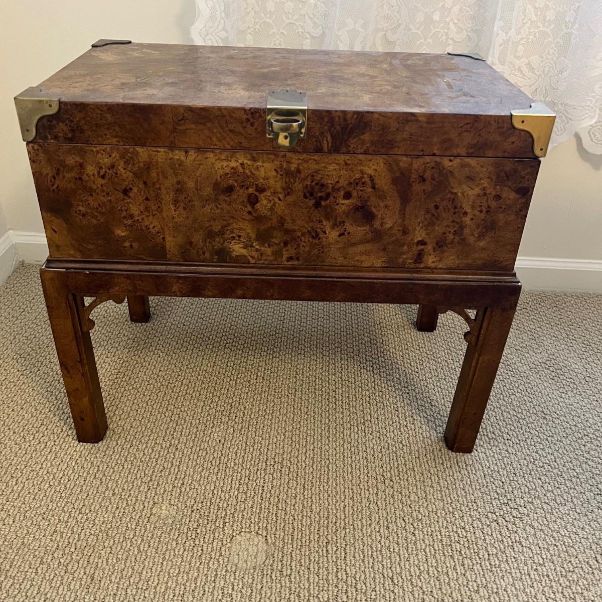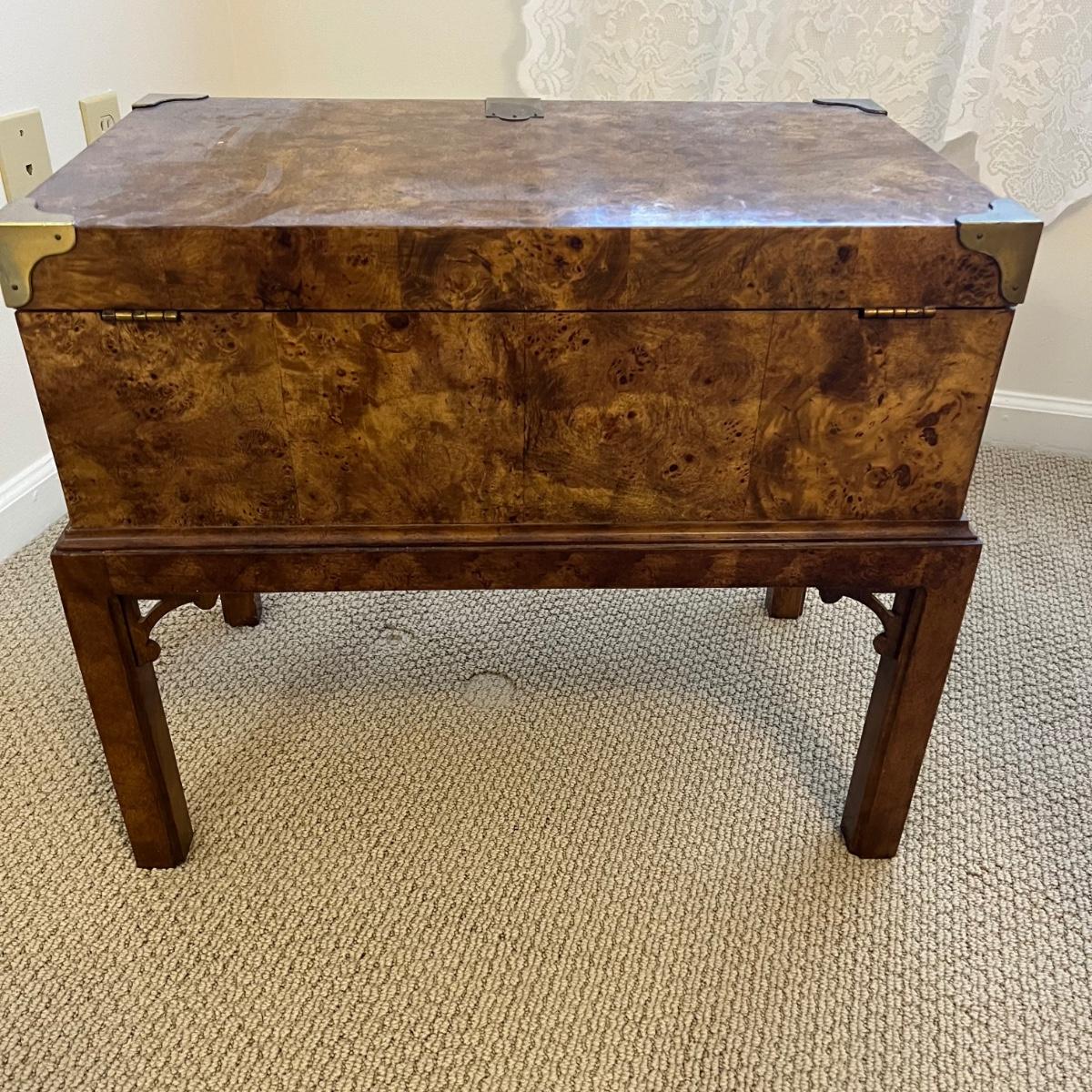 Burlwood chest with brass hardware appears to be an antique-style portable lap desk. It measures 24.25” x 14” x 21”H. The chest opens for additional storage. This items is one unit; the top chest does not separate from the stand.