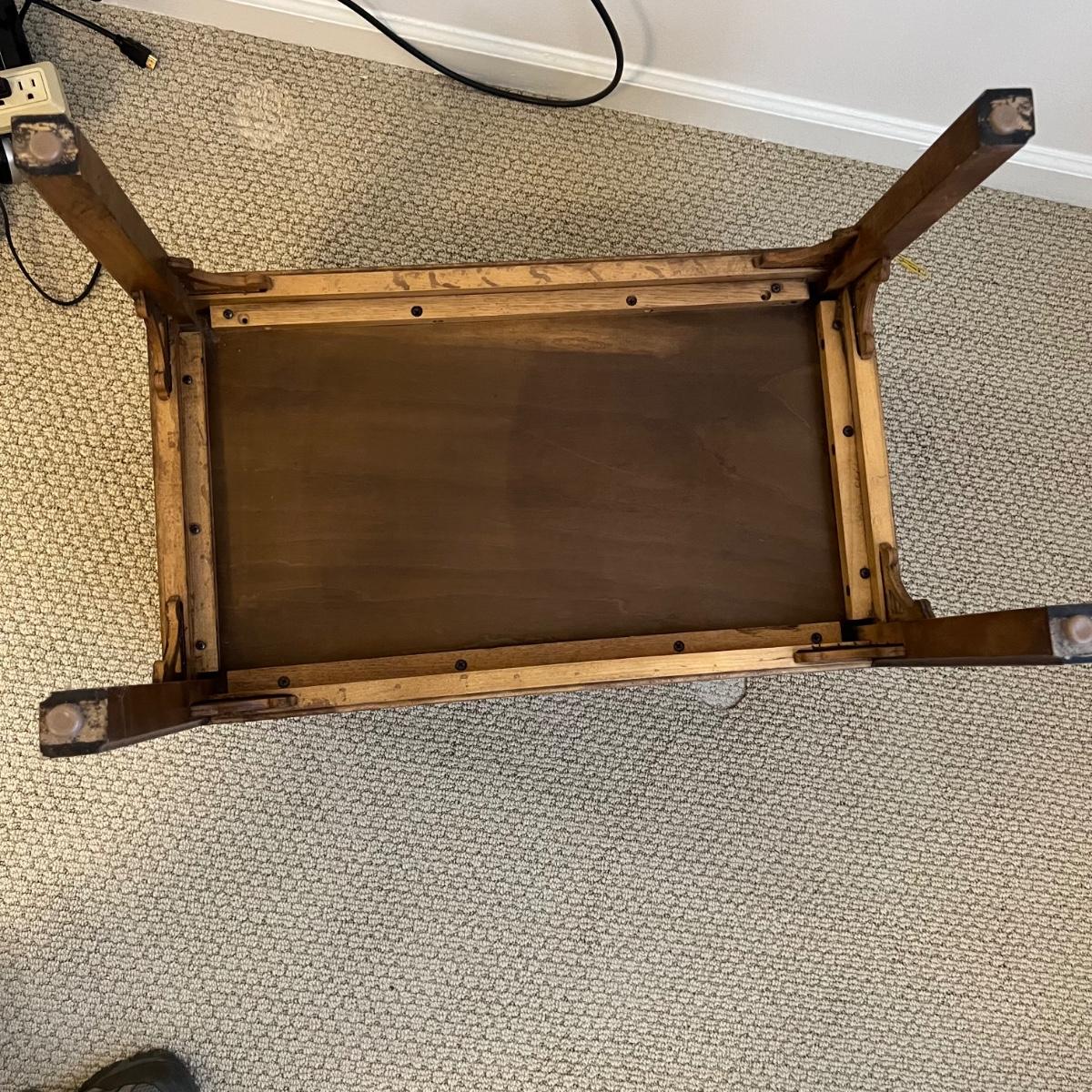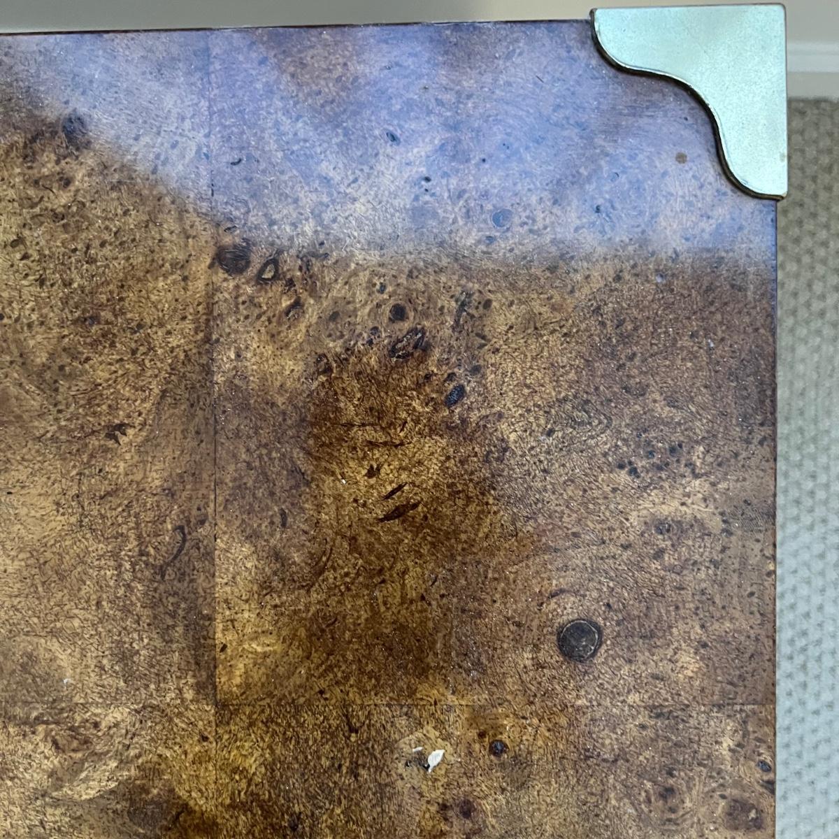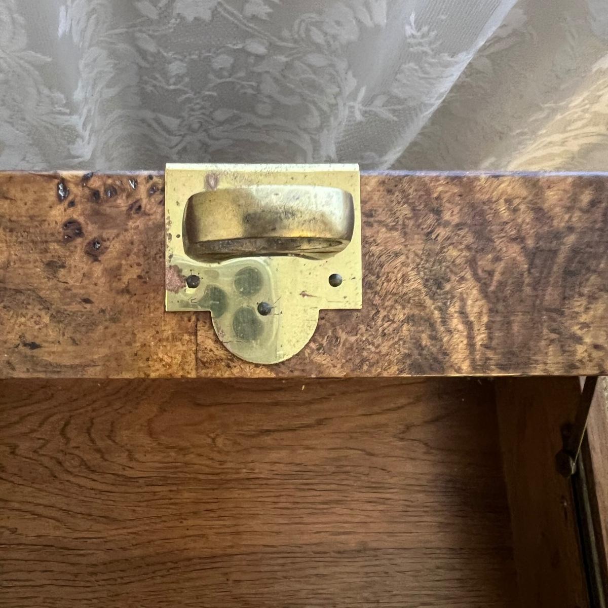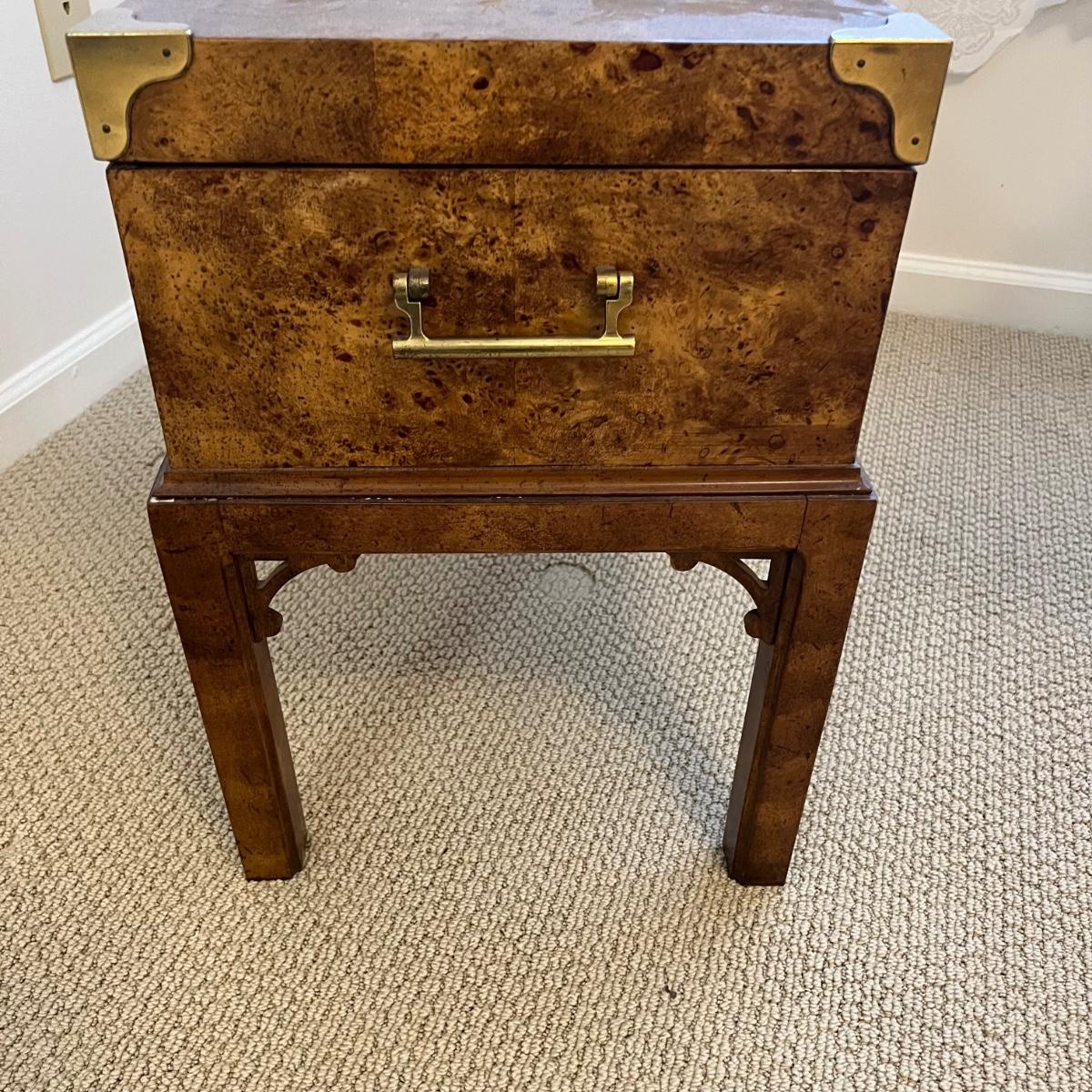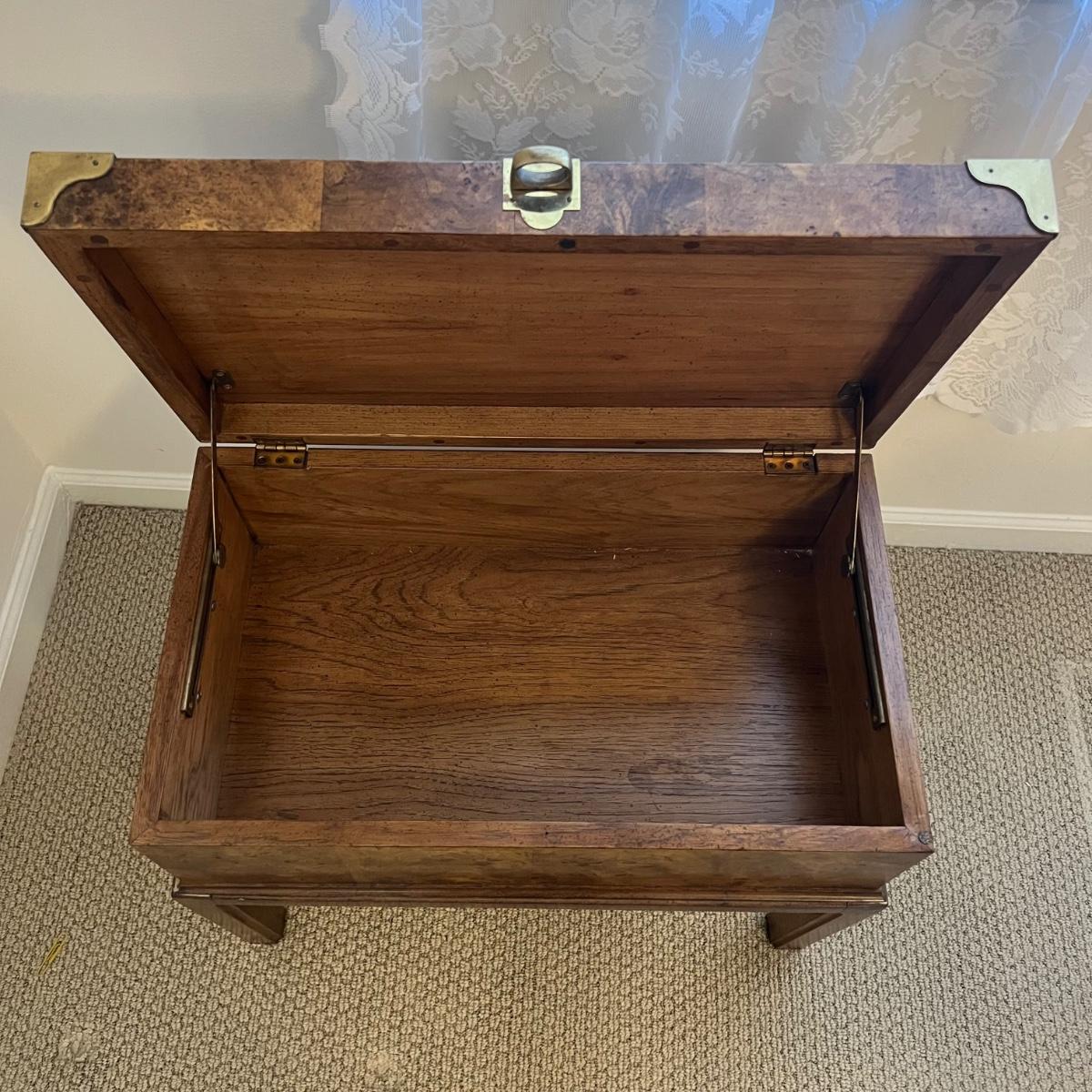 Burlwood chest with brass hardware appears to be an antique-style portable lap desk. It measures 24.25” x 14” x 21”H. The chest opens for additional storage. This items is one unit; the top chest does not separate from the stand.