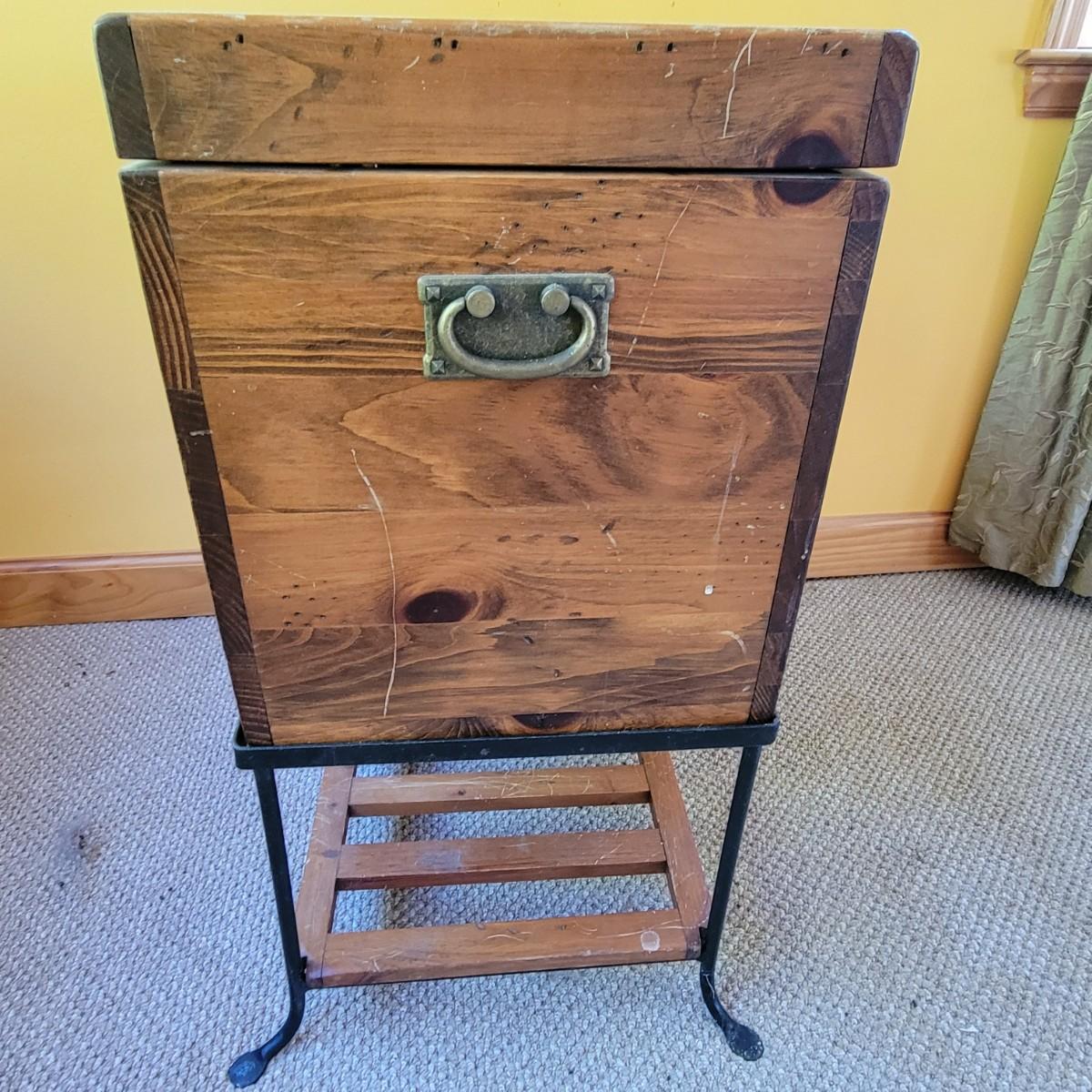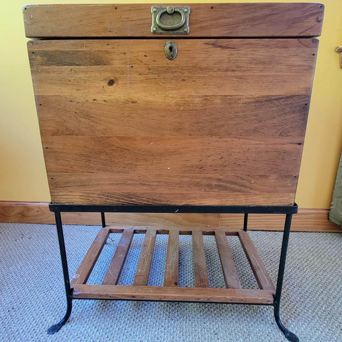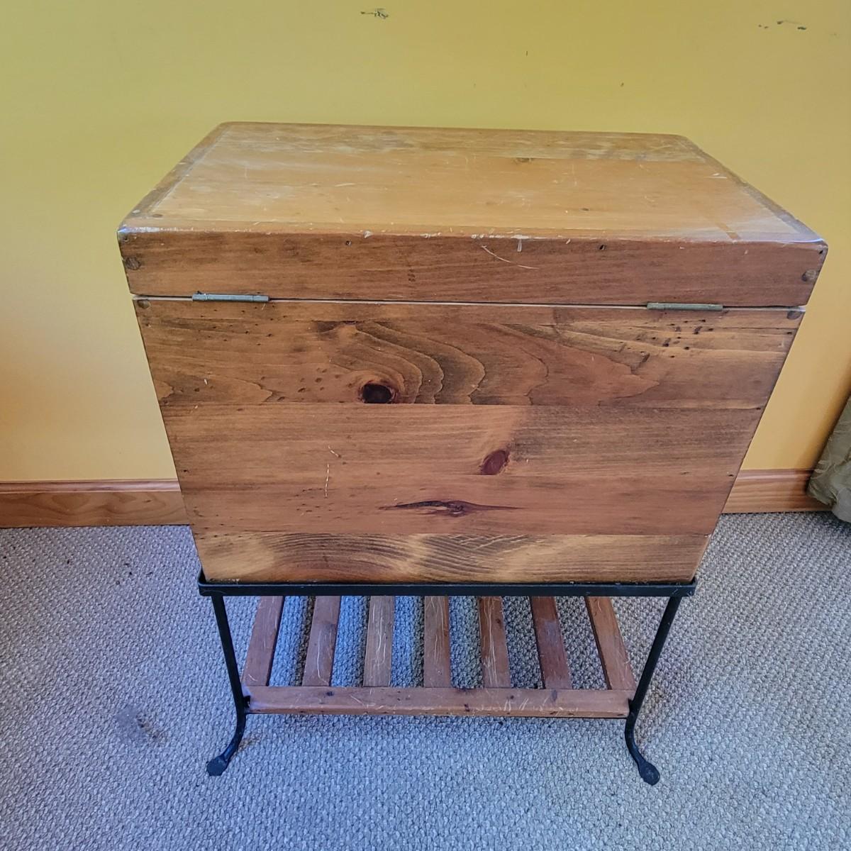 Small wooden chest with wrought iron stand and wooden shelf. Chest has some scratches and wear. It measures 22" x 14" x 12". Wrought iron stand is approximately 26" x 18.5" x 14"