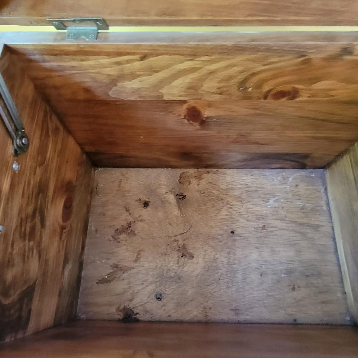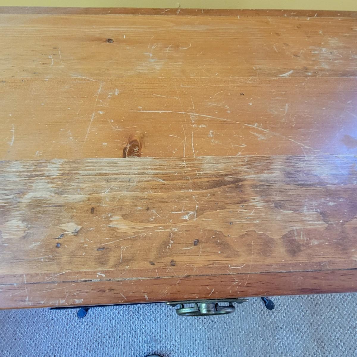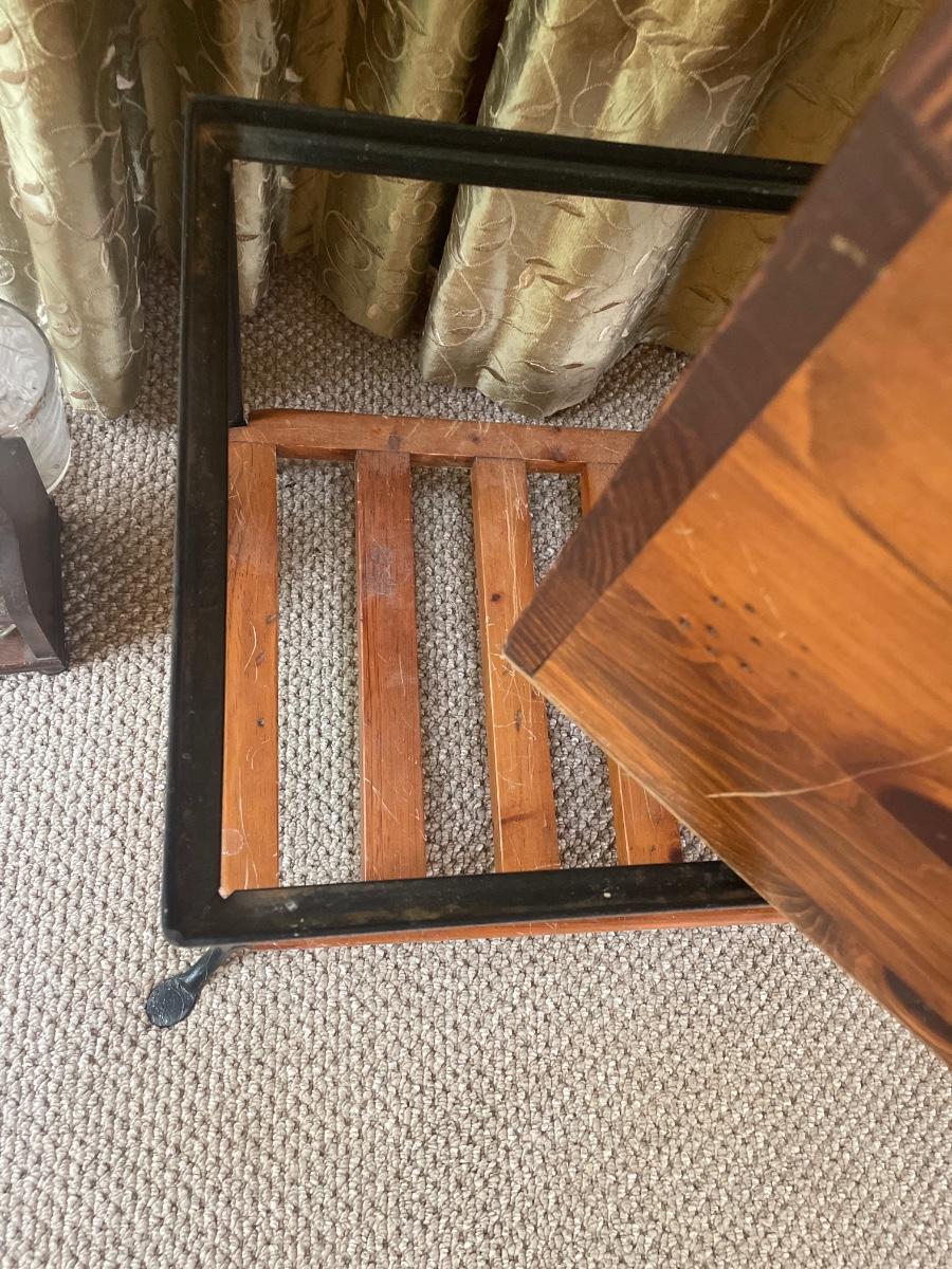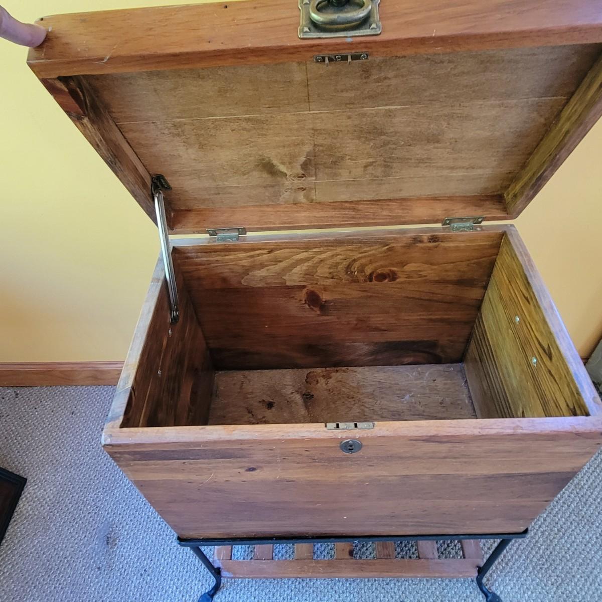 Small wooden chest with wrought iron stand and wooden shelf. Chest has some scratches and wear. It measures 22" x 14" x 12". Wrought iron stand is approximately 26" x 18.5" x 14"