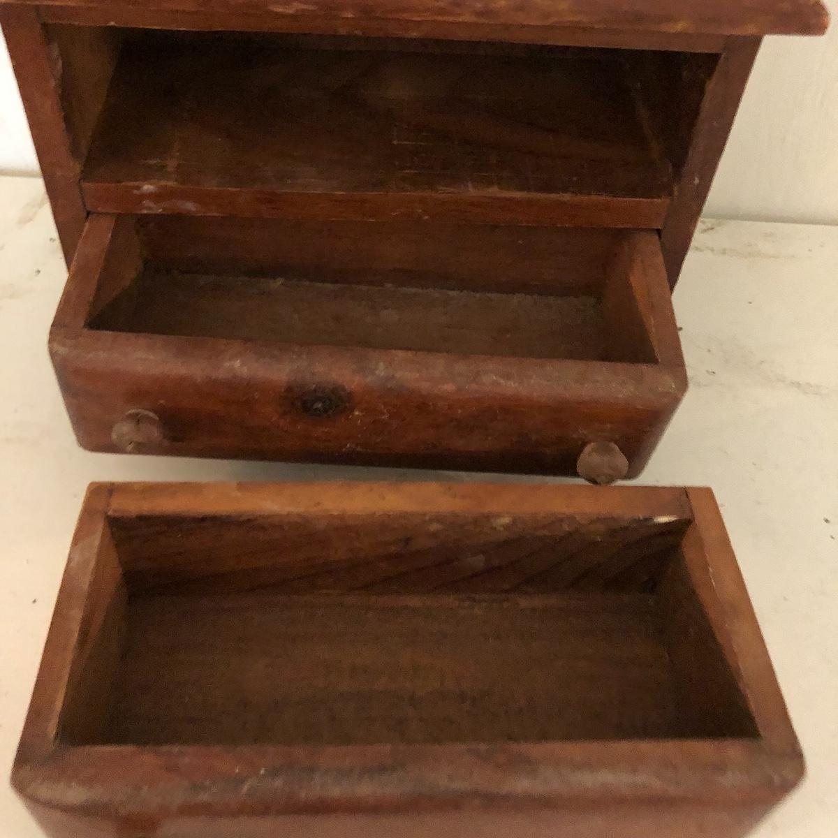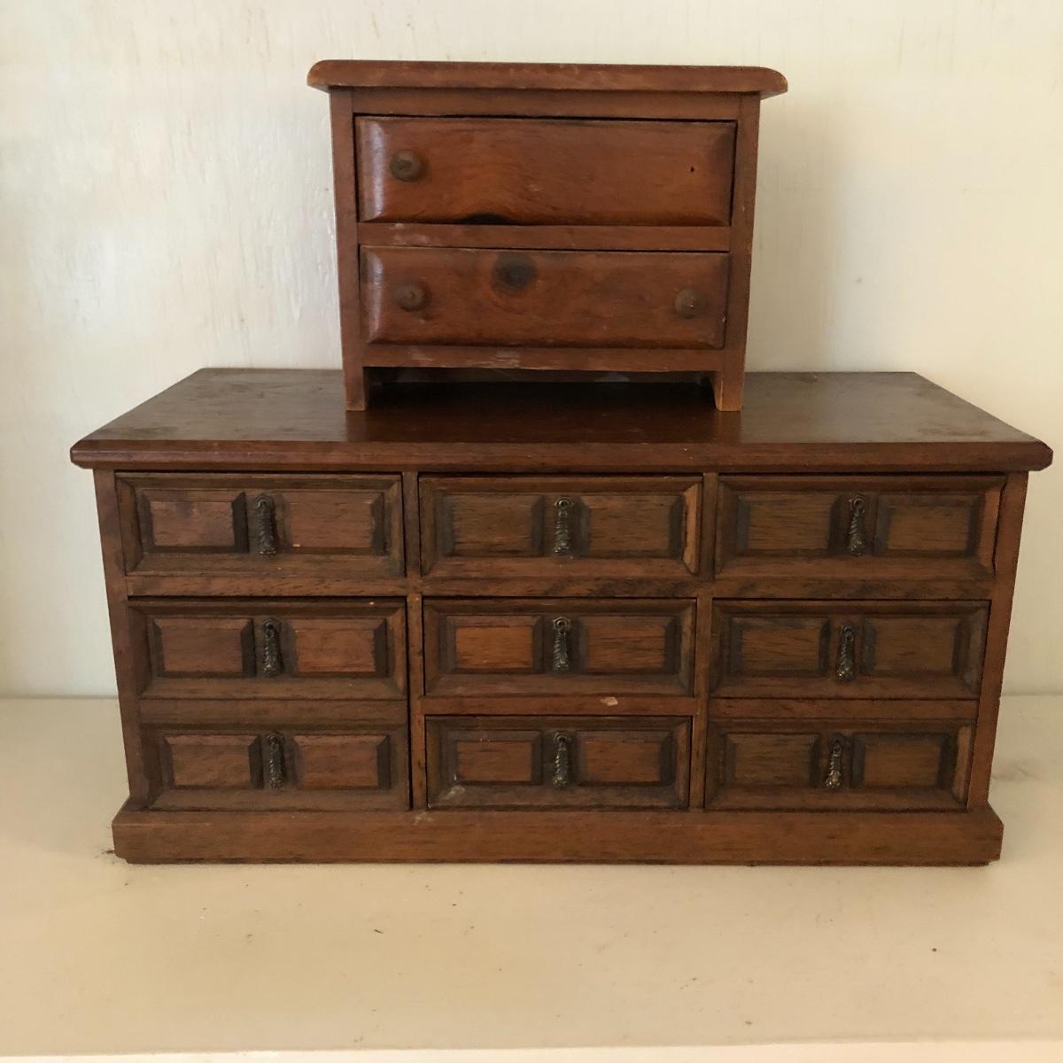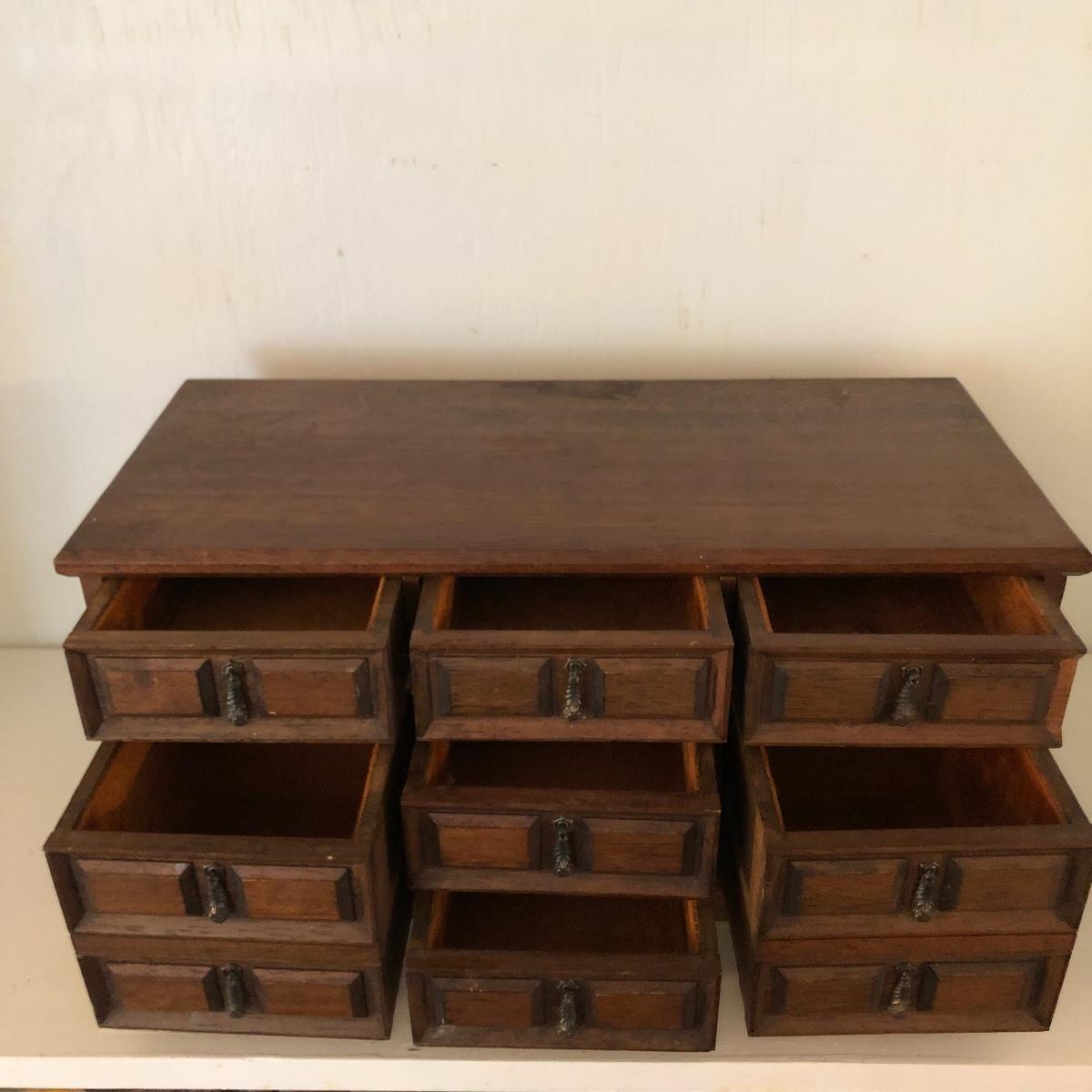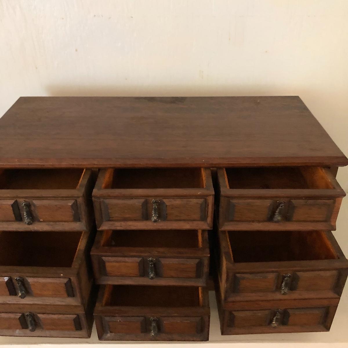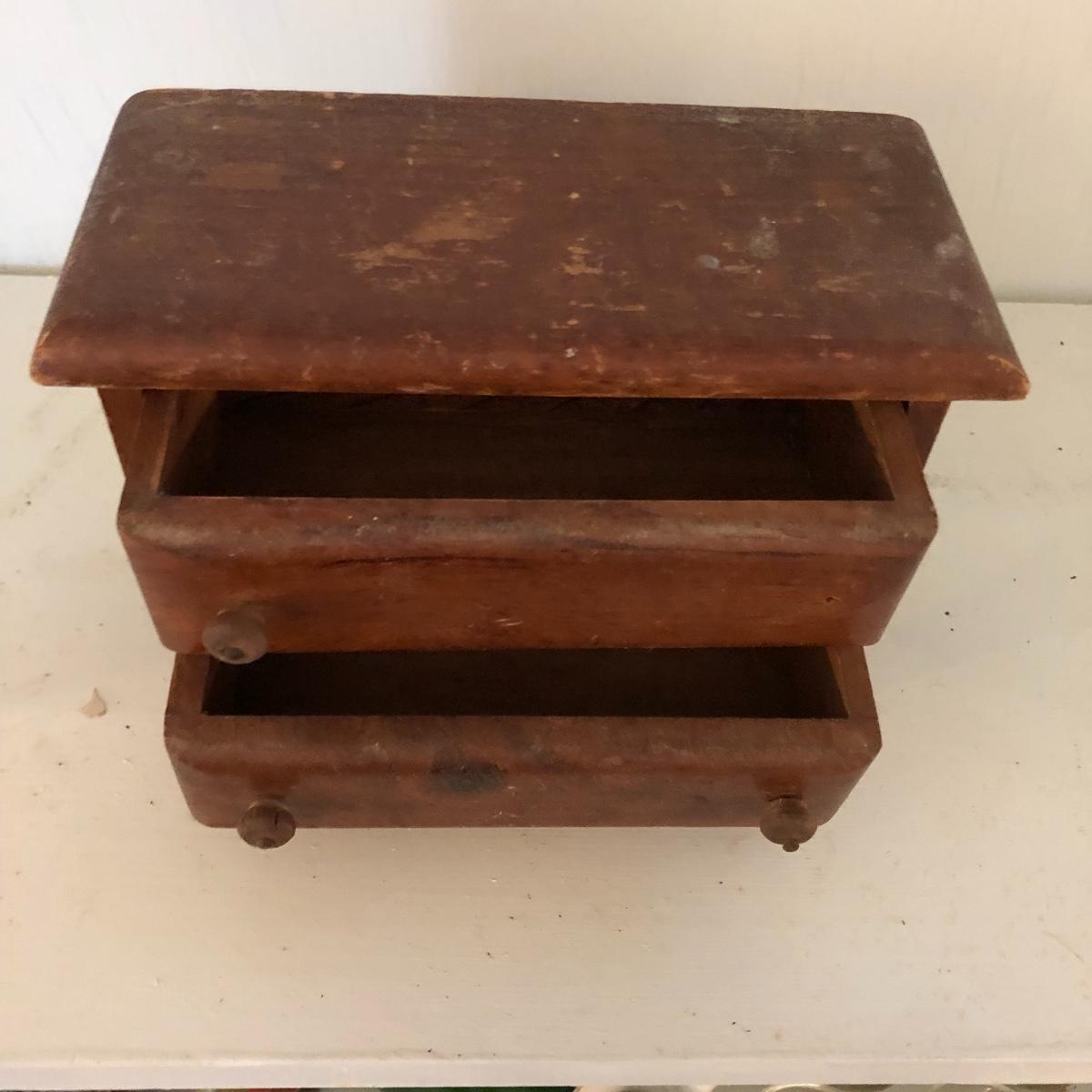 Lot includes one small wooden seven drawer chest with fabric lined drawers with metal pulls and a small two drawer wooden chest that is missing one drawer pull, see pictures. Largest chest measures 7” x 15” x 7.5”.