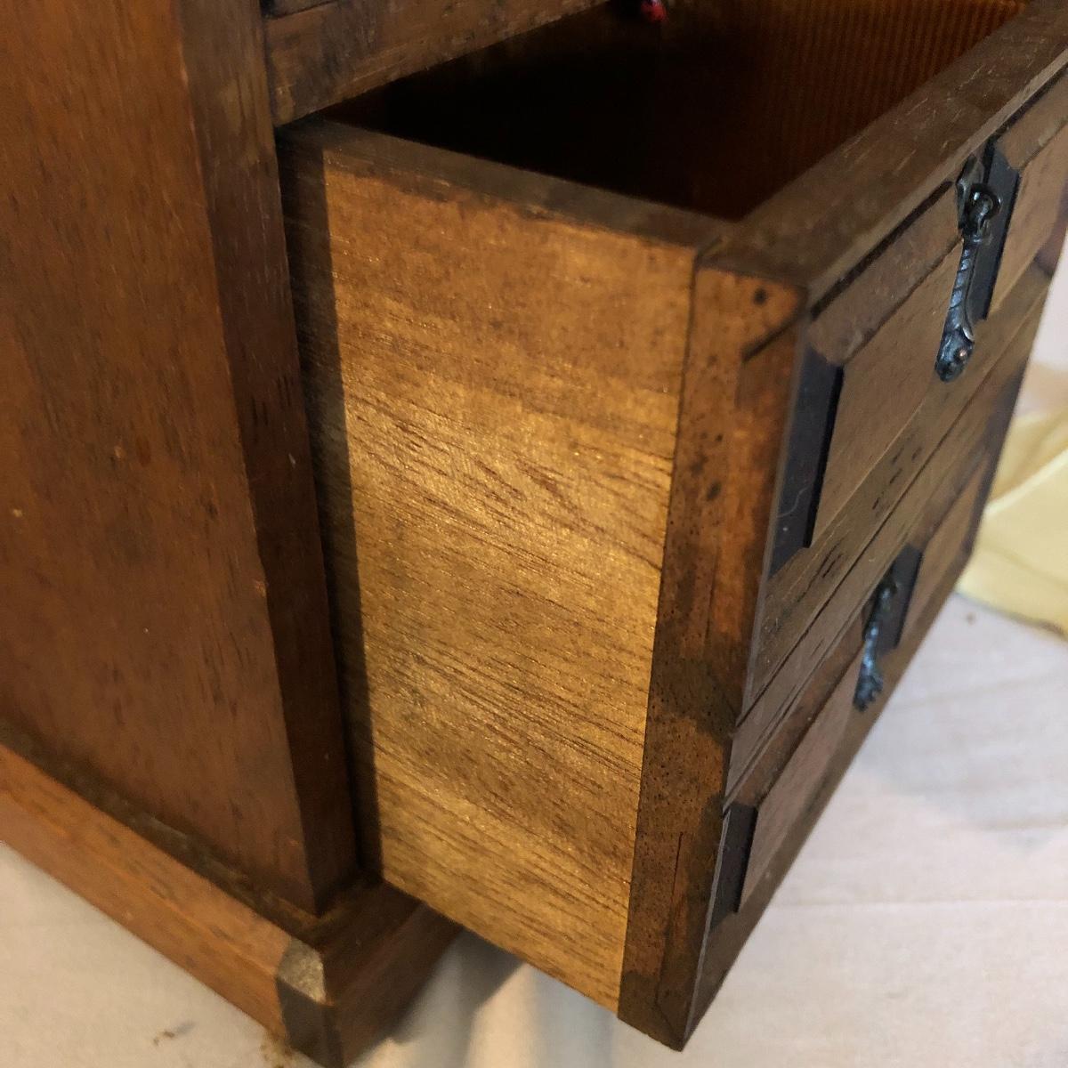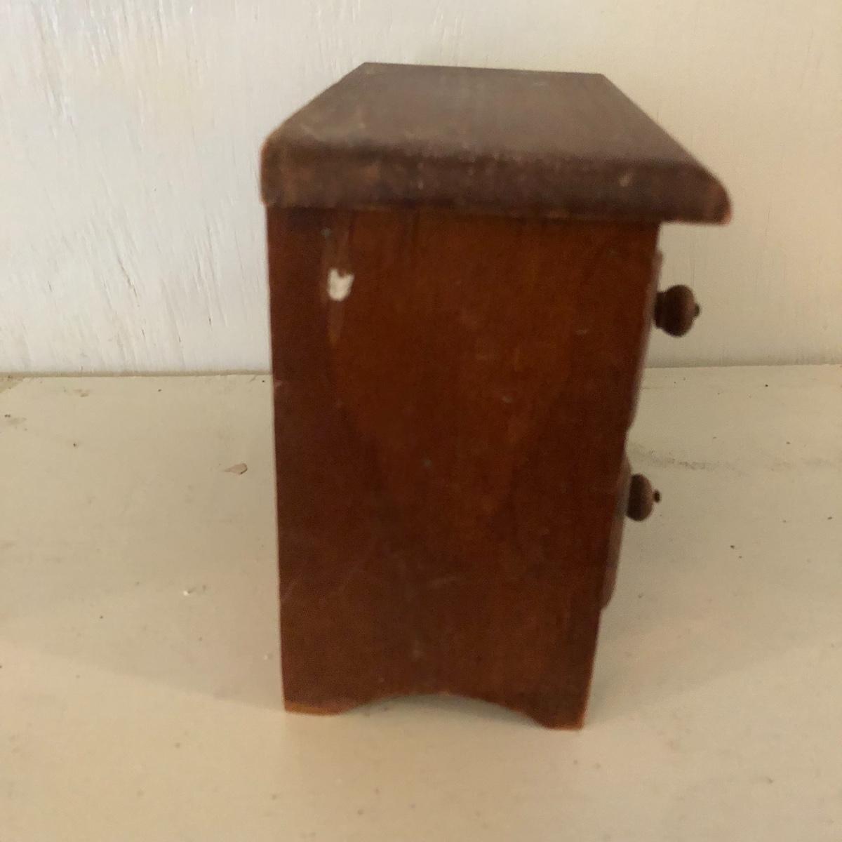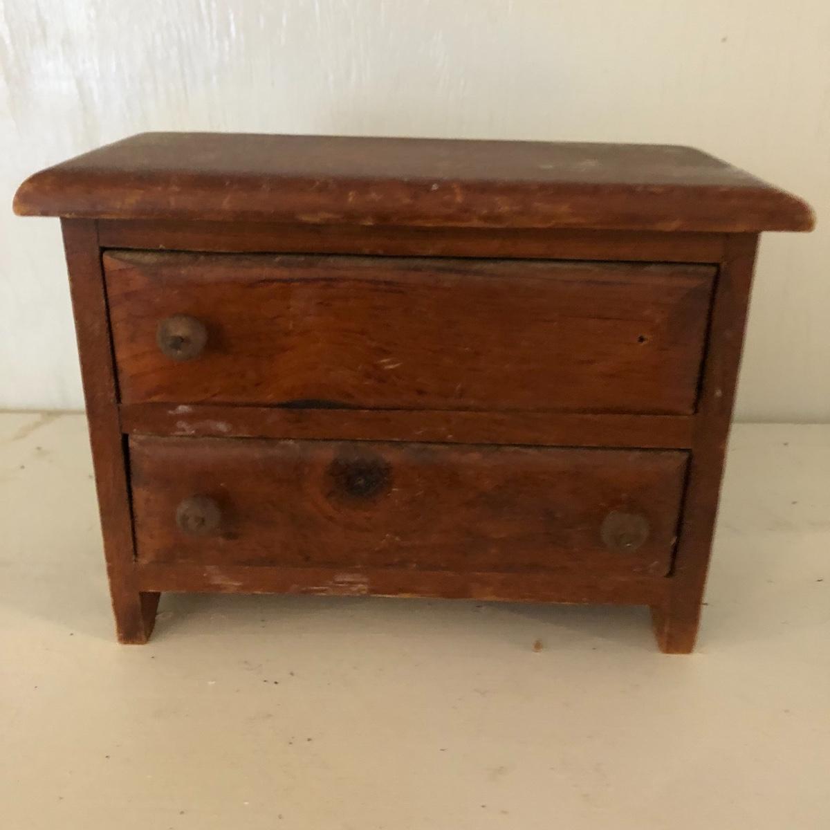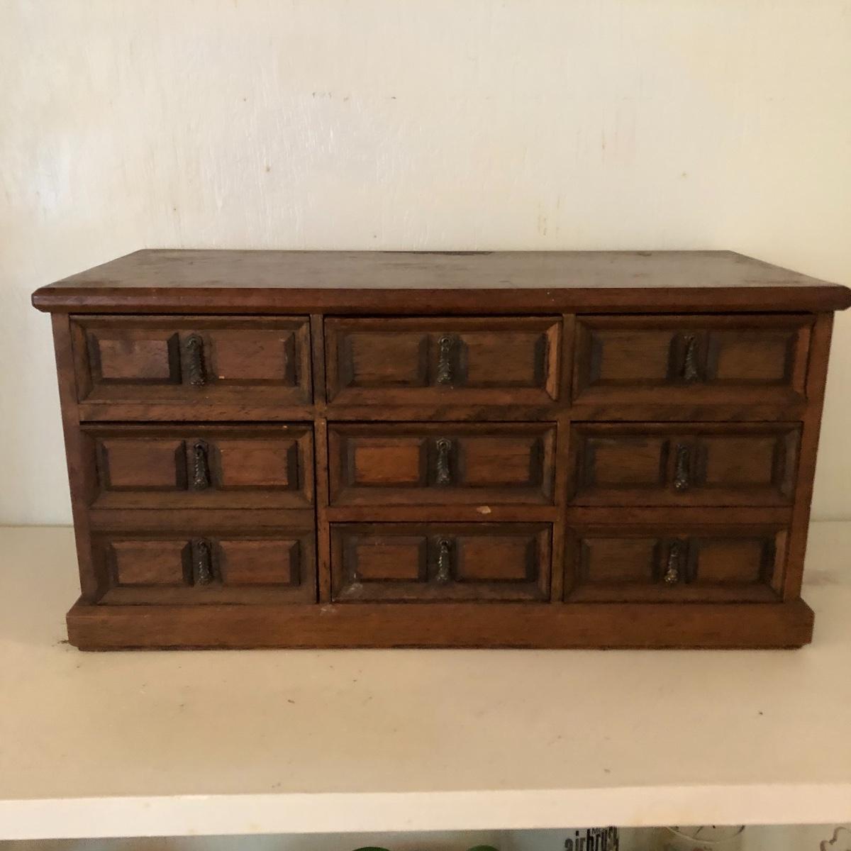 Lot includes one small wooden seven drawer chest with fabric lined drawers with metal pulls and a small two drawer wooden chest that is missing one drawer pull, see pictures. Largest chest measures 7” x 15” x 7.5”.