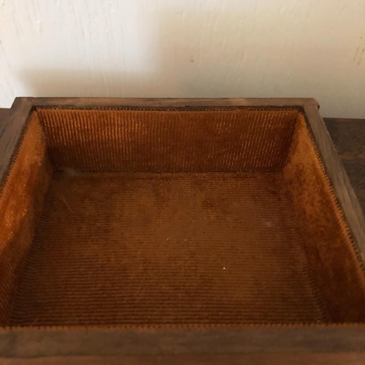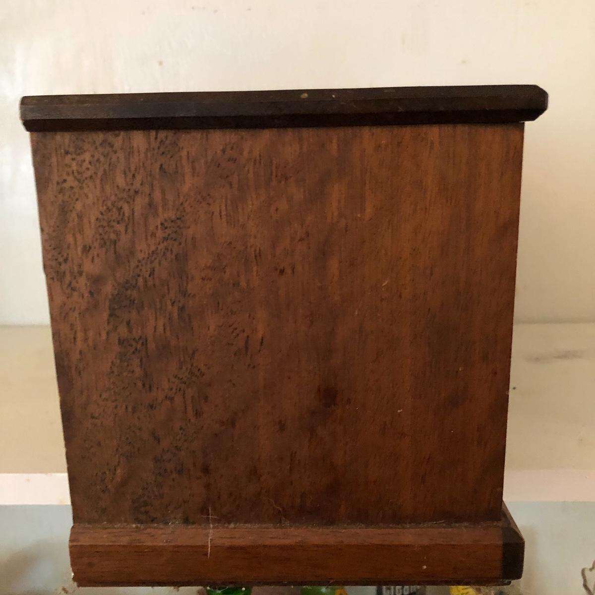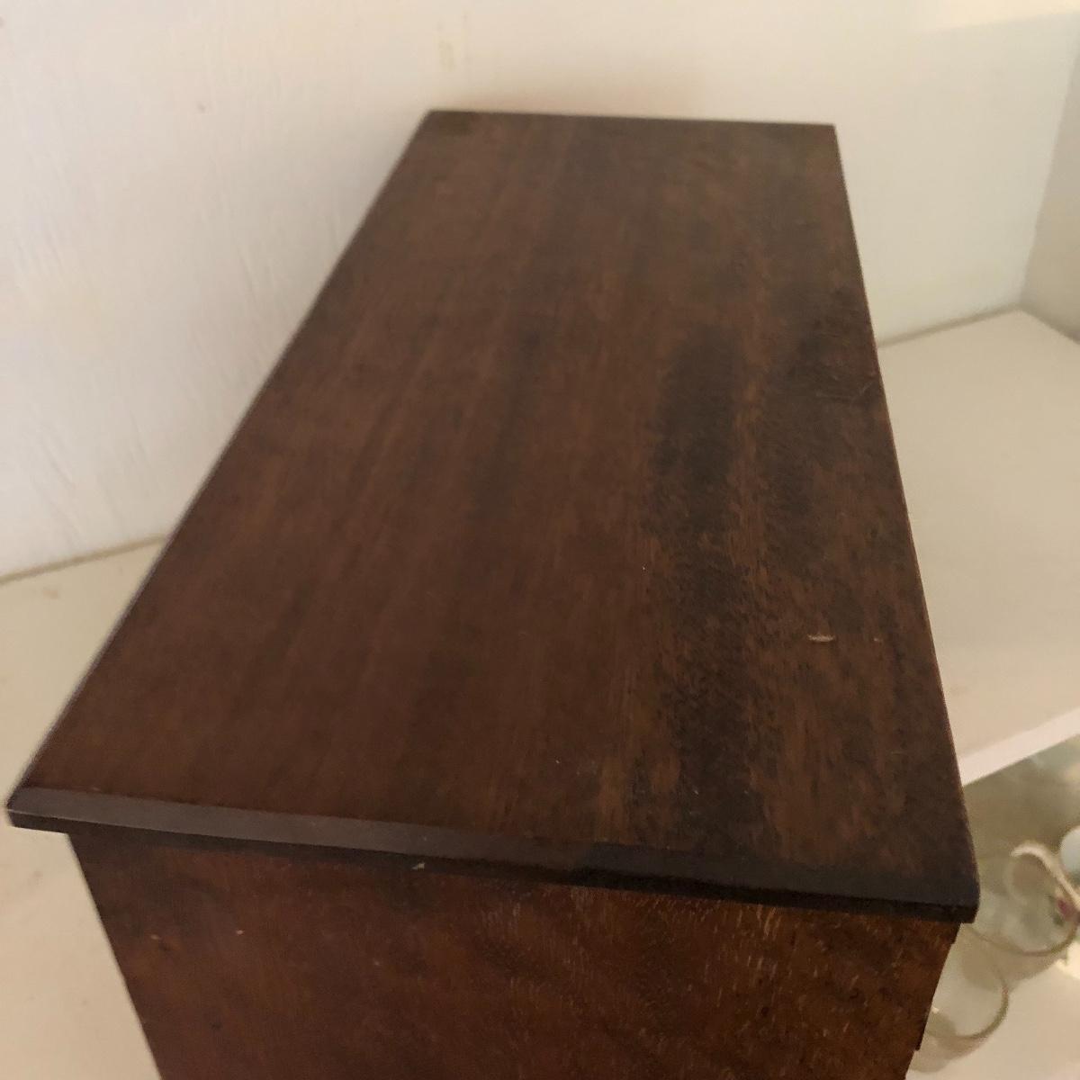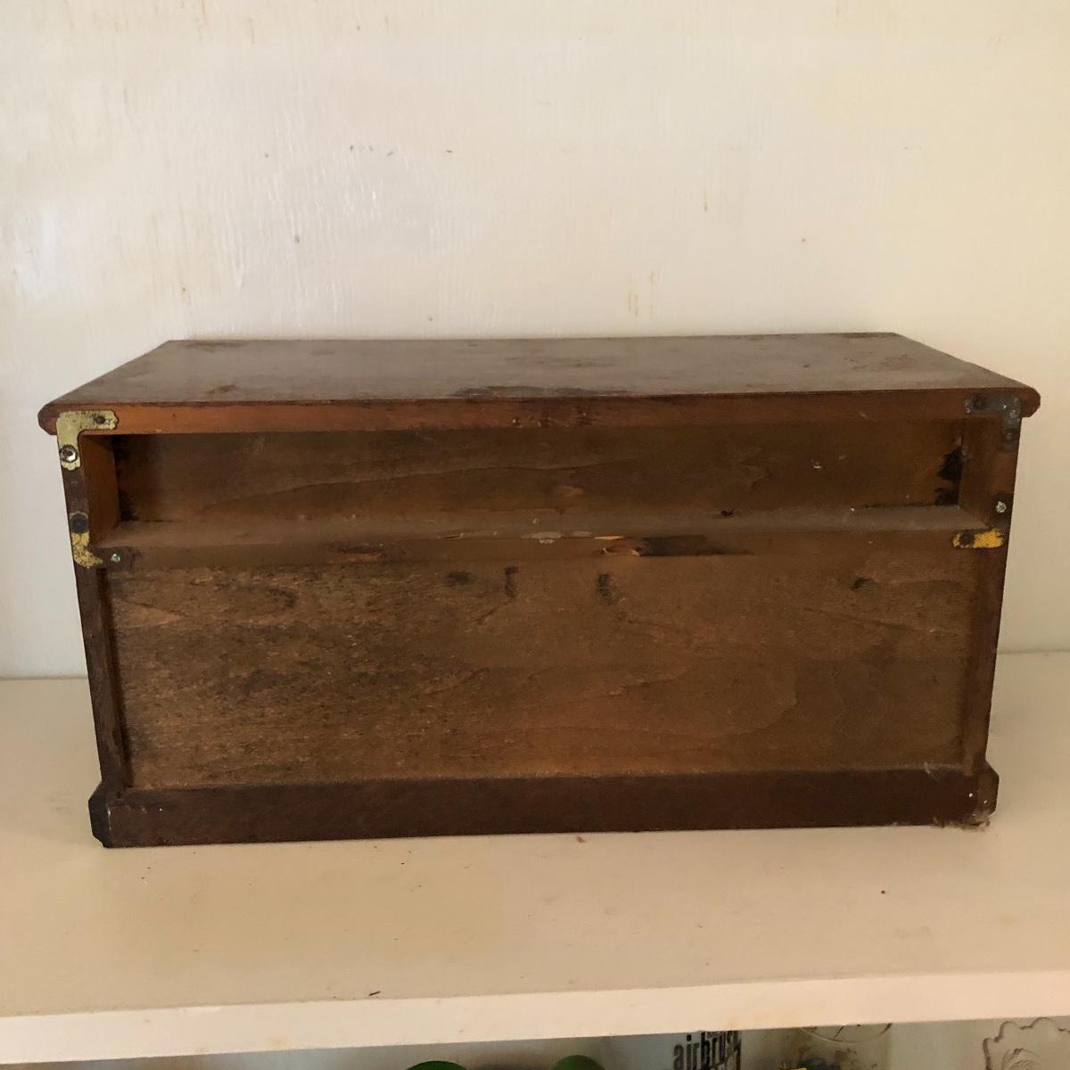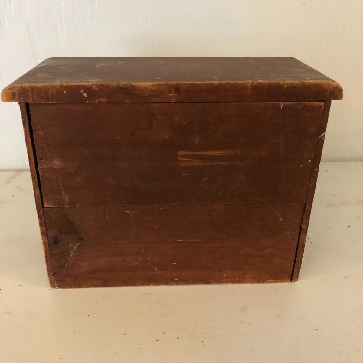 Lot includes one small wooden seven drawer chest with fabric lined drawers with metal pulls and a small two drawer wooden chest that is missing one drawer pull, see pictures. Largest chest measures 7” x 15” x 7.5”.