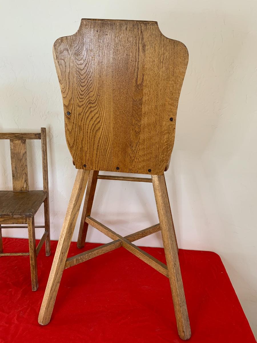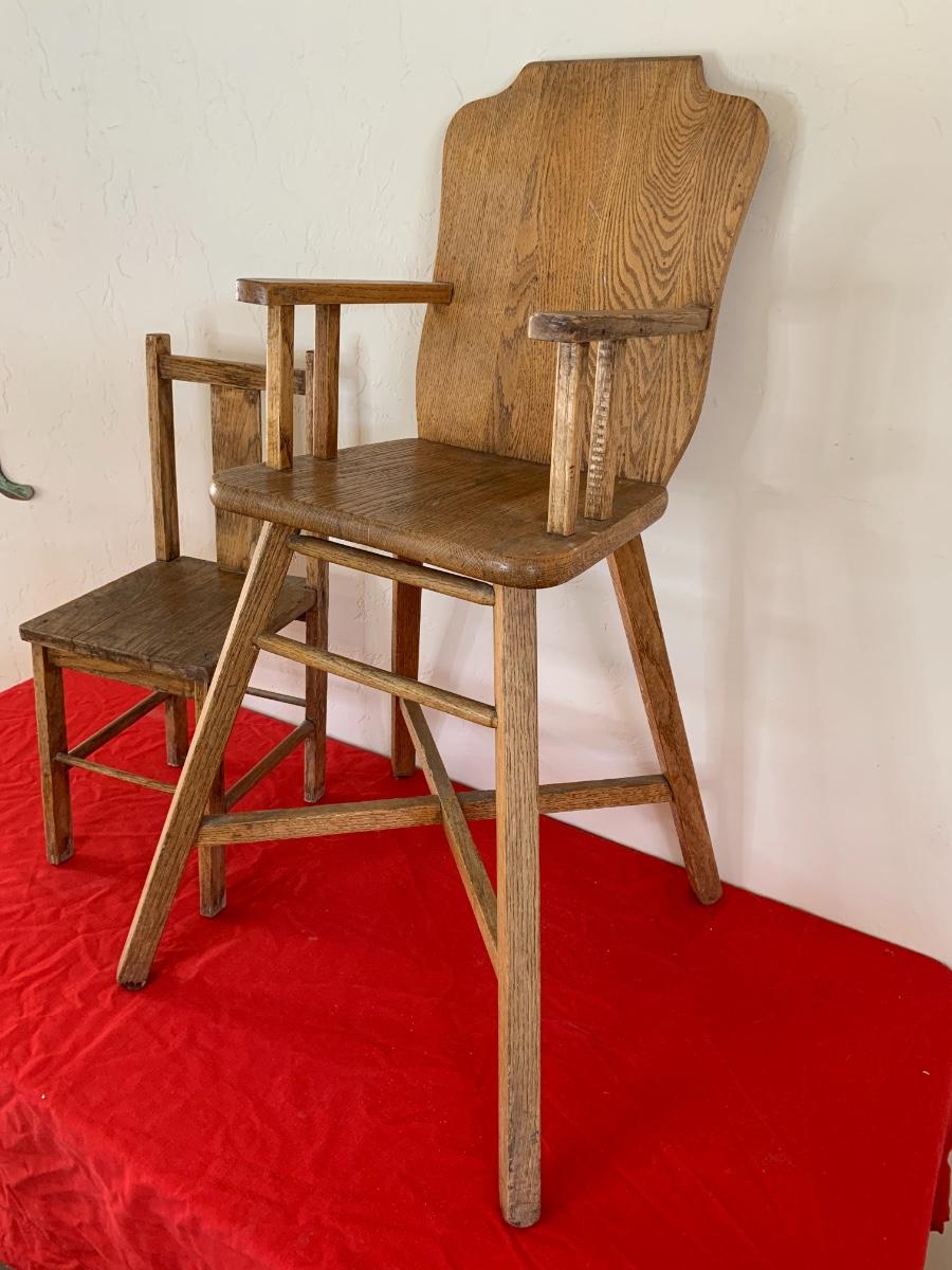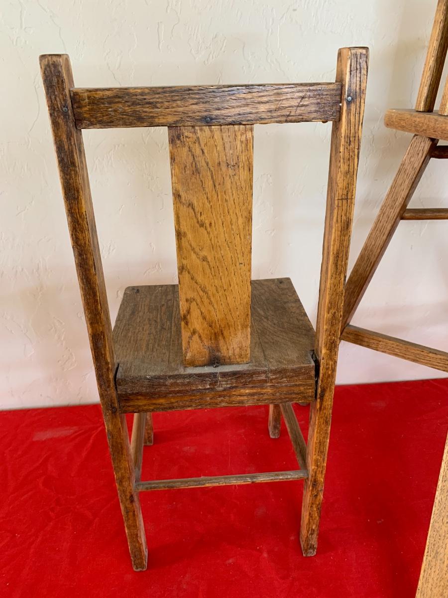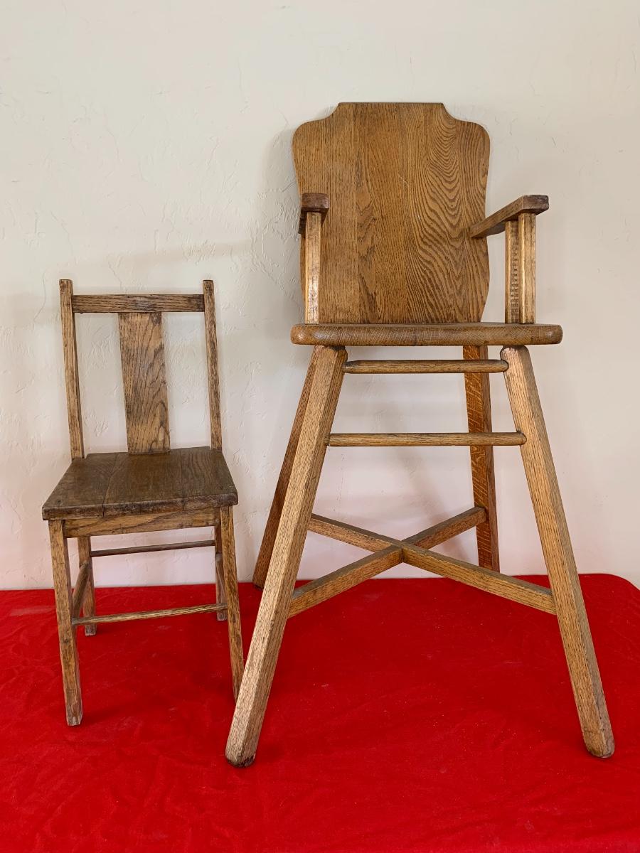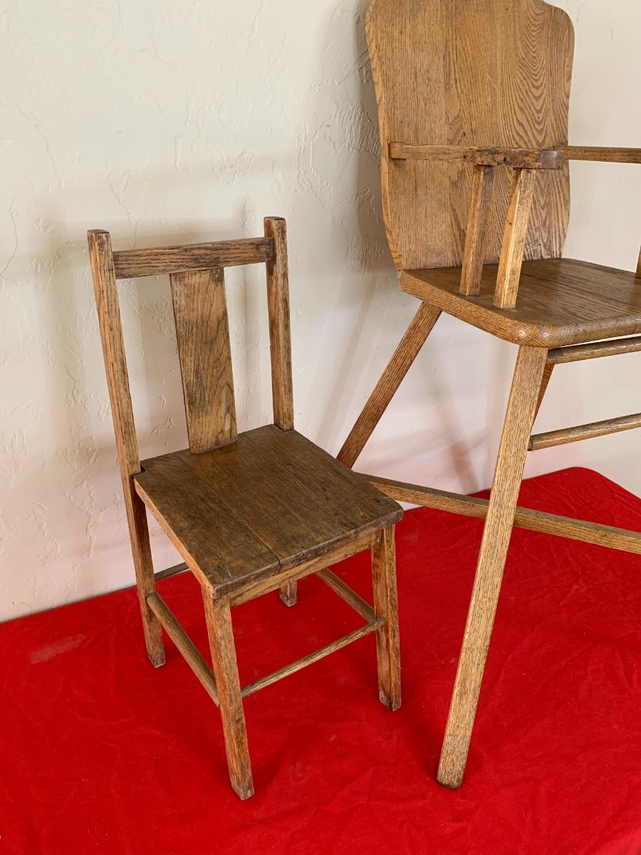 Vintage children chairs including one oak high chair with left arm needing to be re-glued (no tray) and one small wood chair. Both in good vintage condition. (Small chair back is 2 feet in height, the seat is 13 inches in height and the seat depth is 11 inches) (large chair back height is 38 inches, seat height is 23 inches, seat depth is 12 inches).