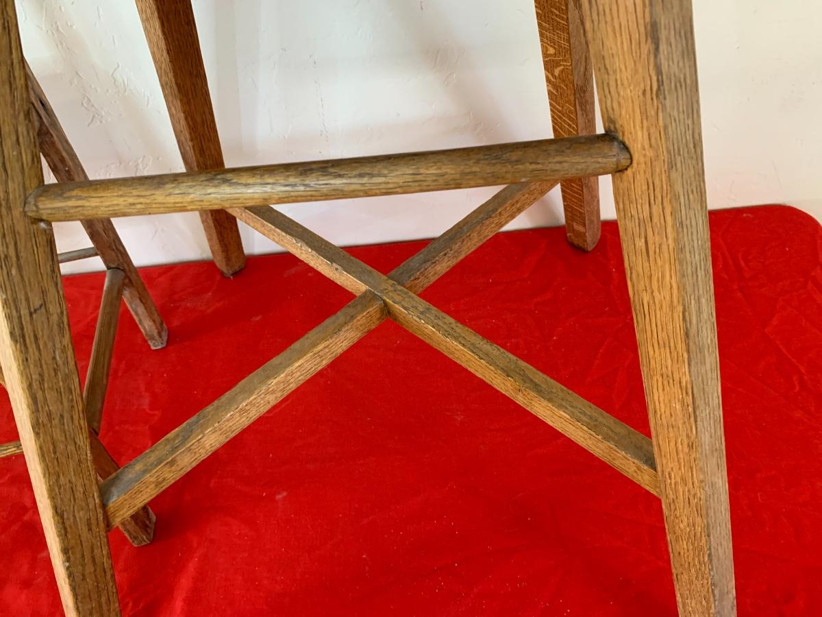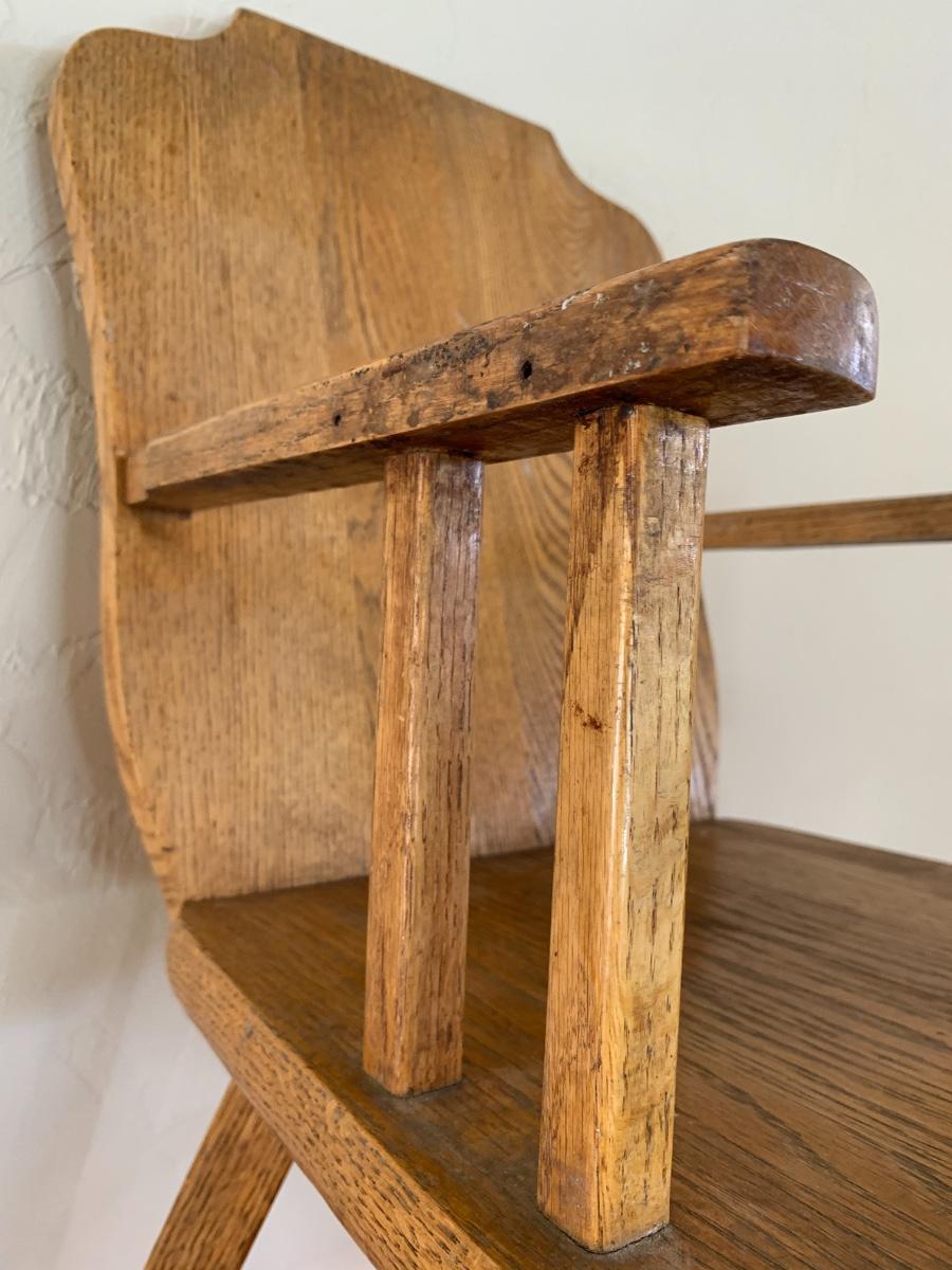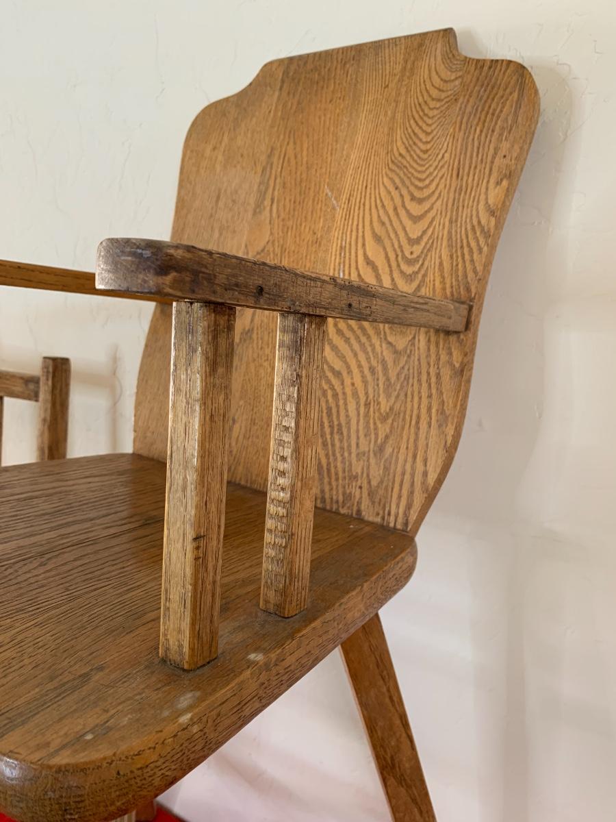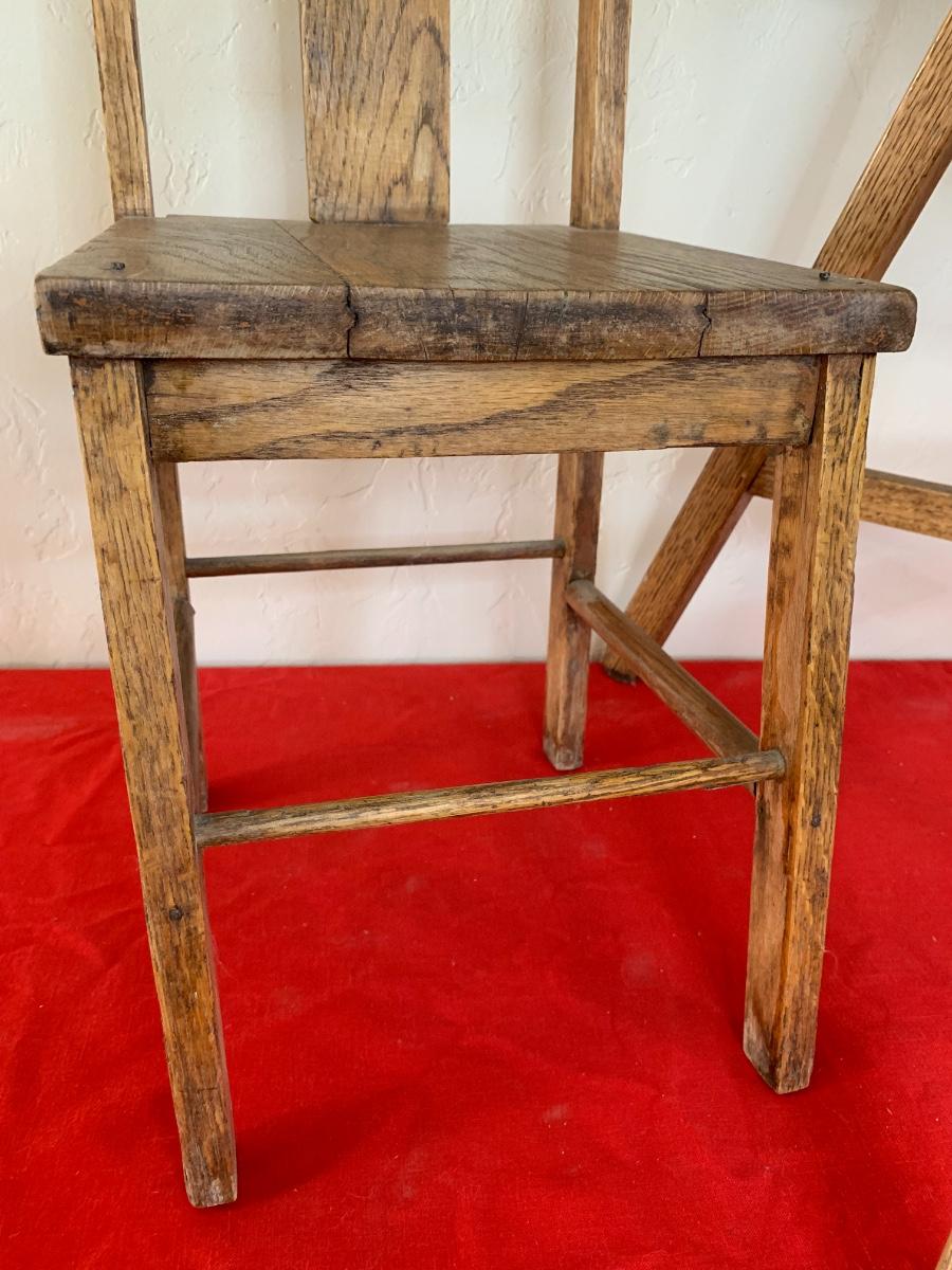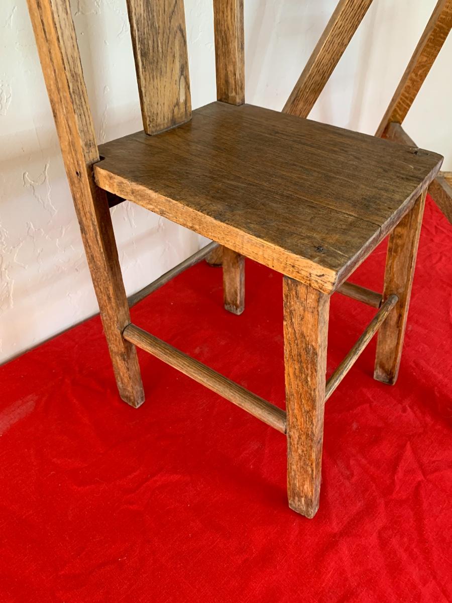 Vintage children chairs including one oak high chair with left arm needing to be re-glued (no tray) and one small wood chair. Both in good vintage condition. (Small chair back is 2 feet in height, the seat is 13 inches in height and the seat depth is 11 inches) (large chair back height is 38 inches, seat height is 23 inches, seat depth is 12 inches).