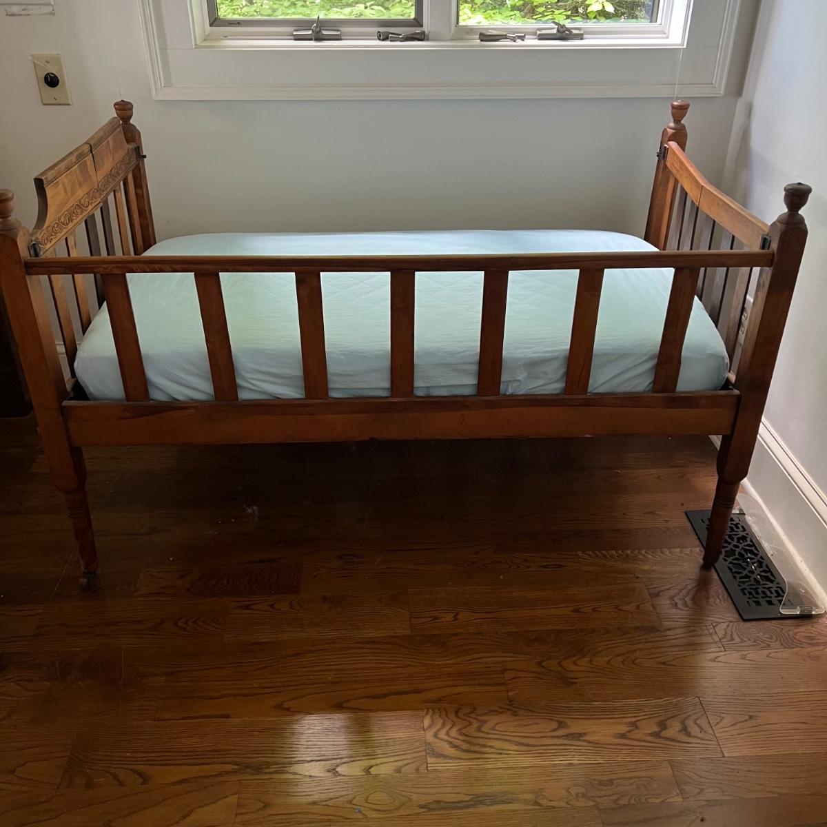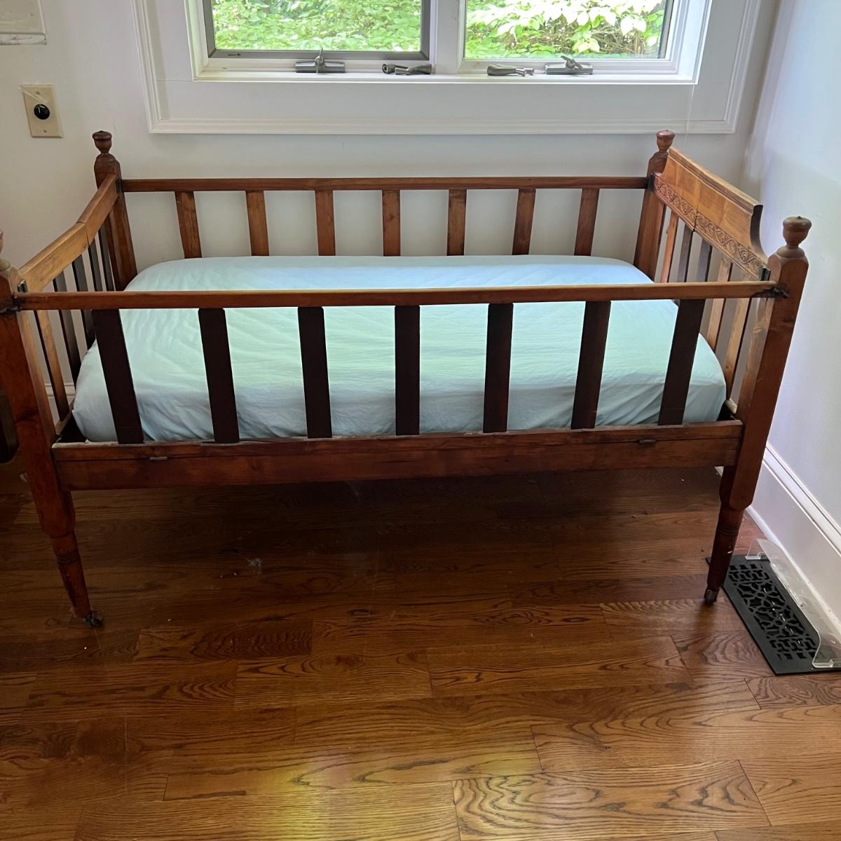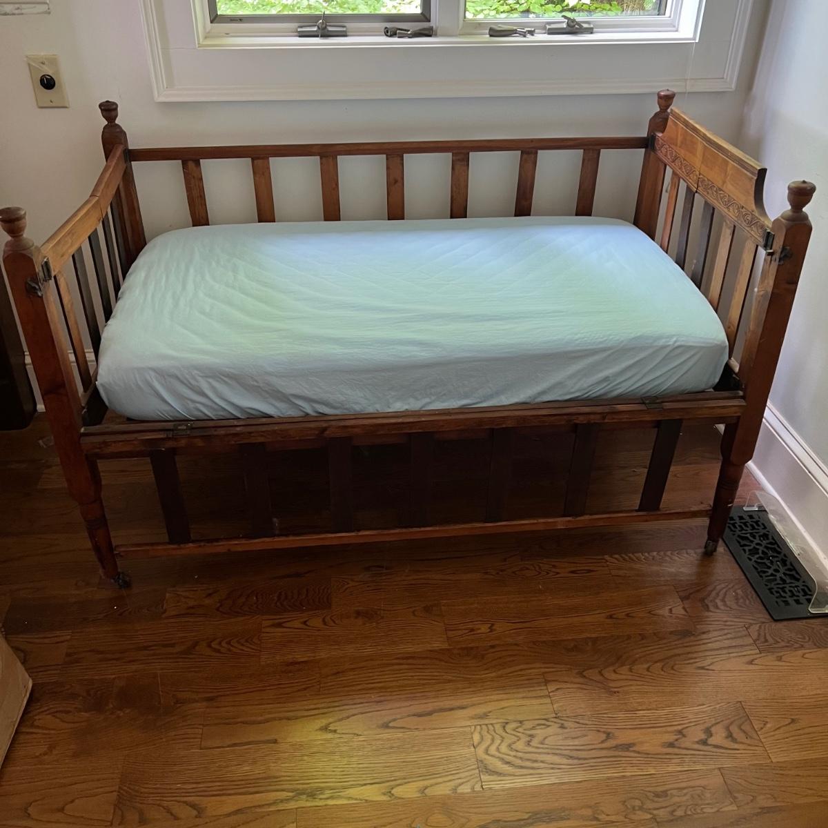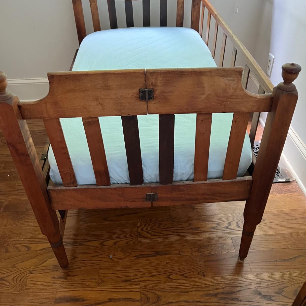Wooden children’s bed with drop side. The bed seems to be collapsible and measures 52” x 30” x 33”H. The mattress is included with purchase, if desired.