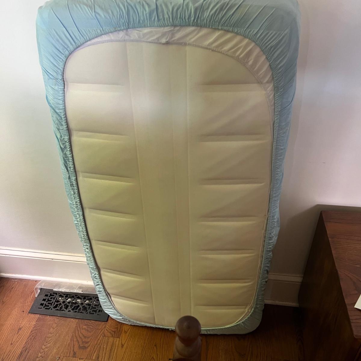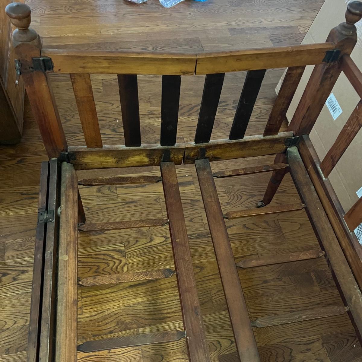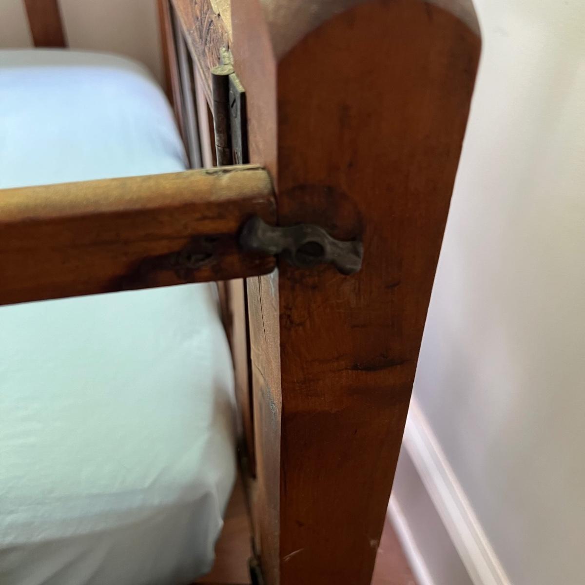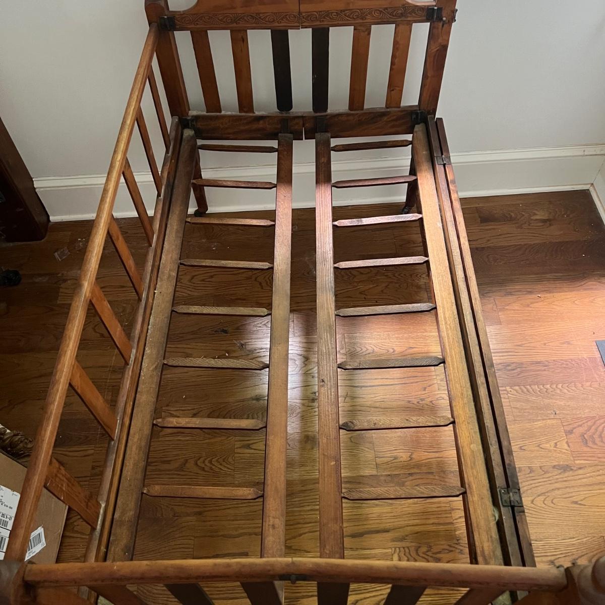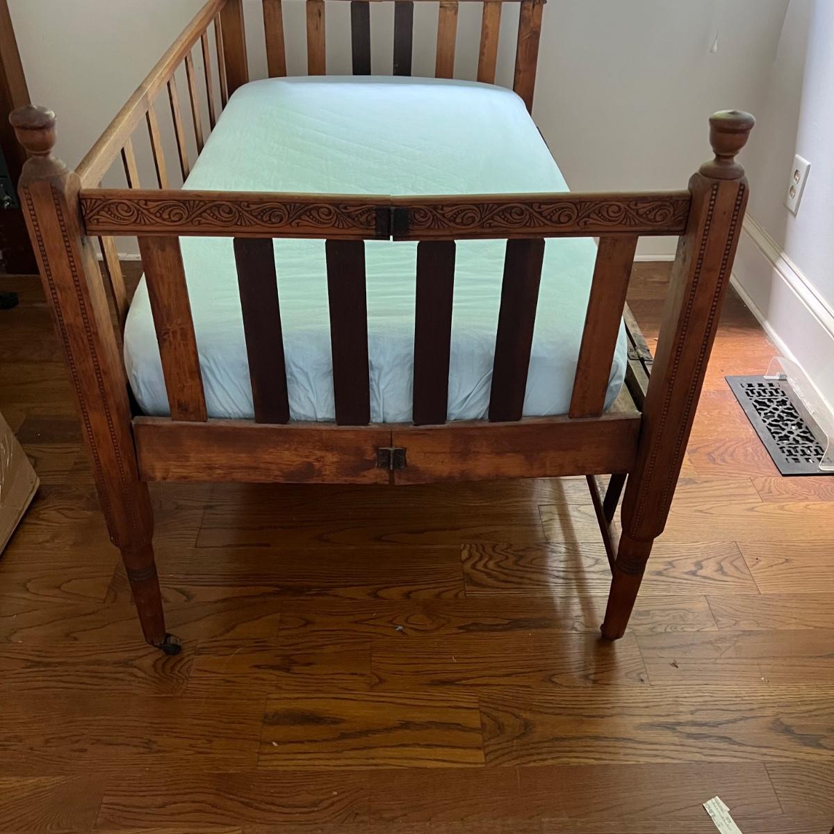 Wooden children’s bed with drop side. The bed seems to be collapsible and measures 52” x 30” x 33”H. The mattress is included with purchase, if desired.