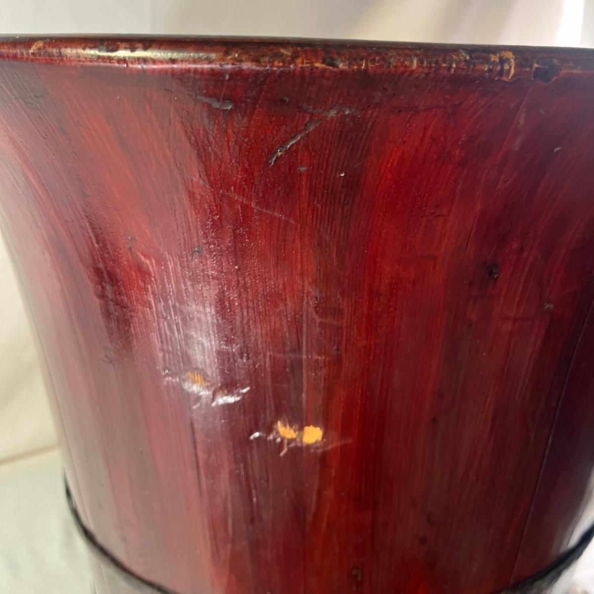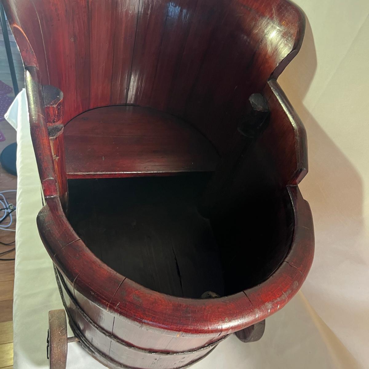 A wooden rolling piece that appears to be a vintage Chinese child's feeding chair. Has wooden wheels with metal axles. Piece measures 19” x 27” x 20”H.