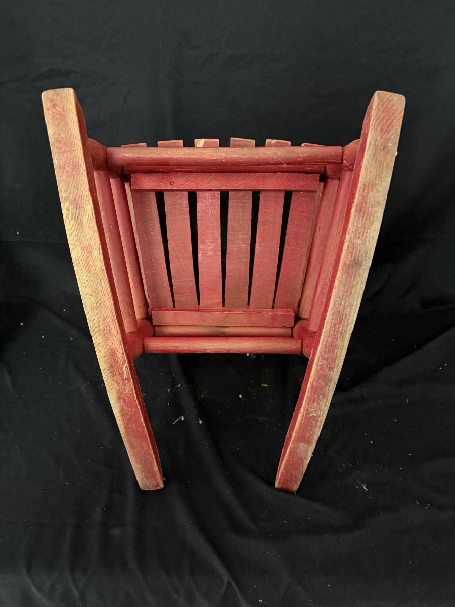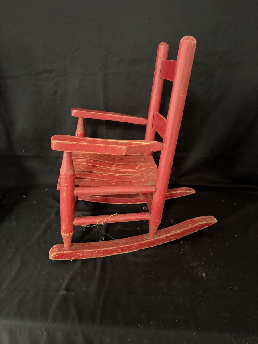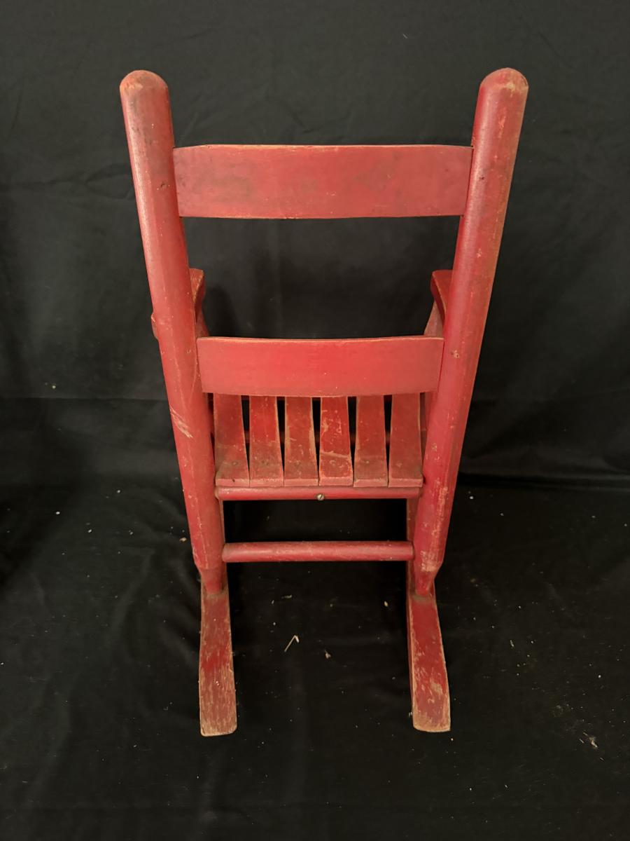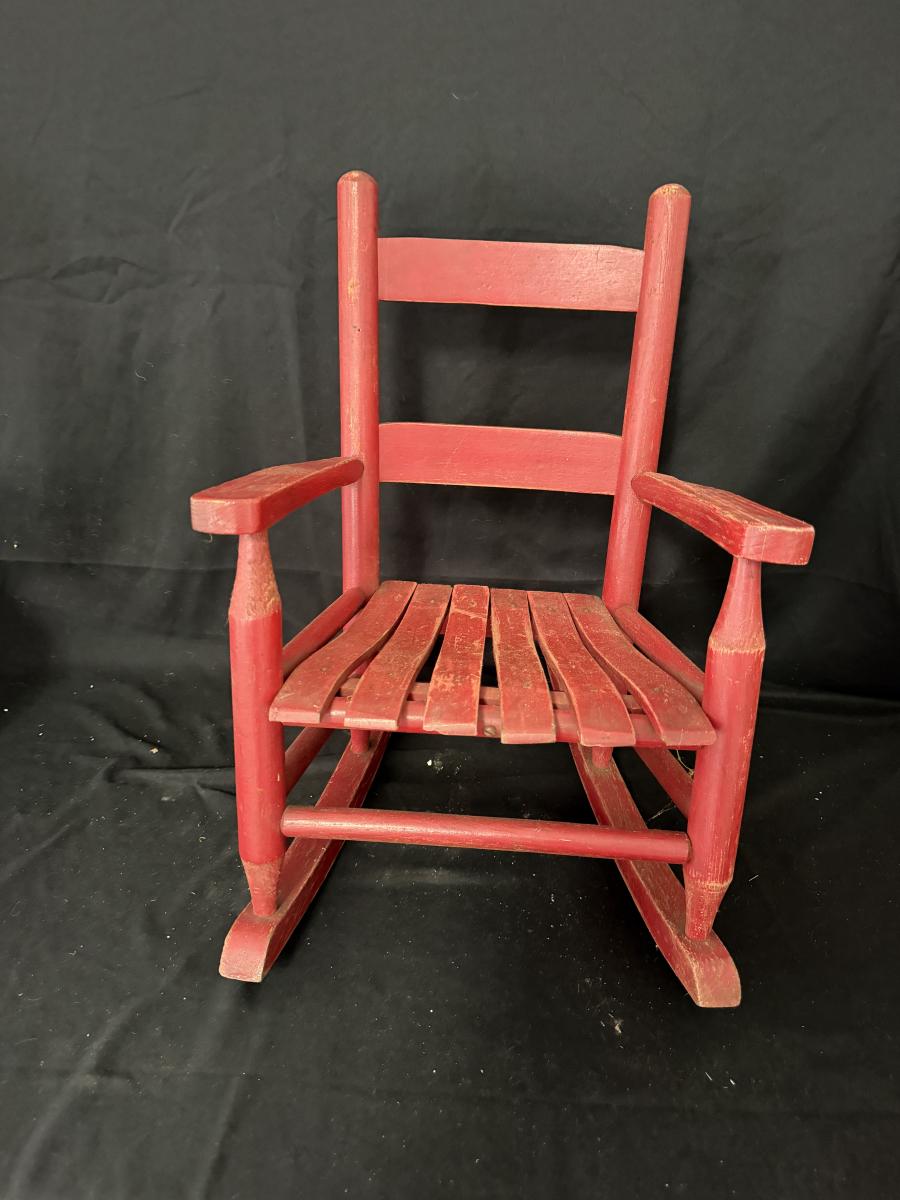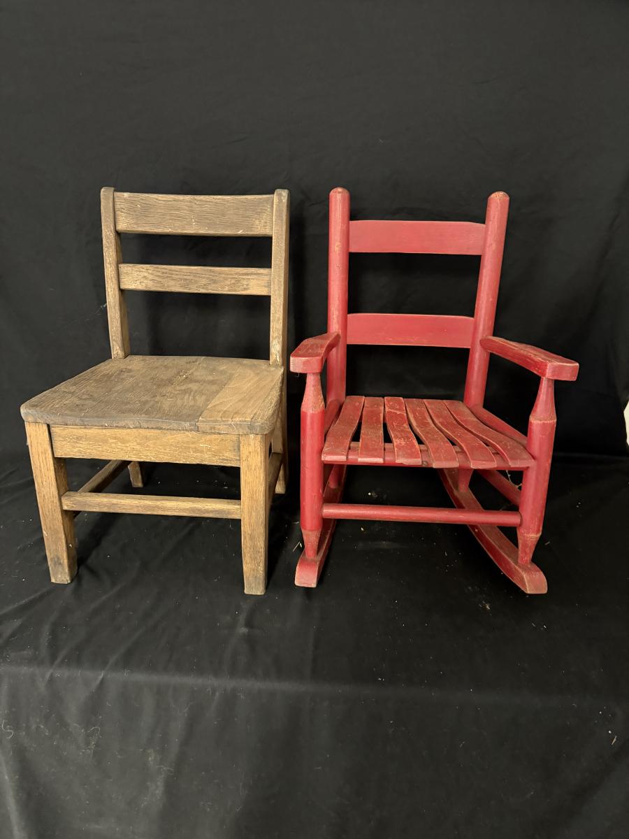 Lot includes a painted red wooden child’s rocker and a wooden child’s chair. Rocker measures 14” x 20” x 22”H with a 9” seat height. Rocker has split armrest and chair has chunk missing on seat, see pictures.