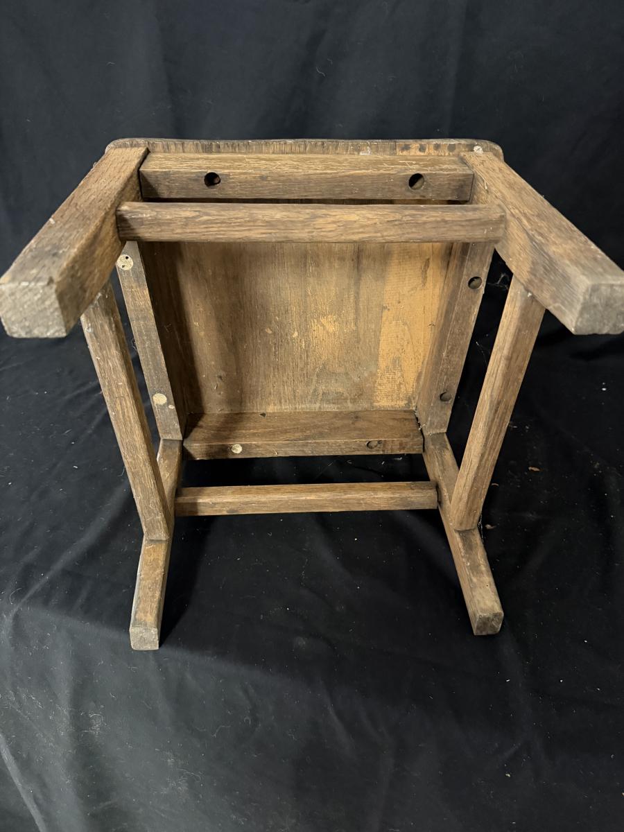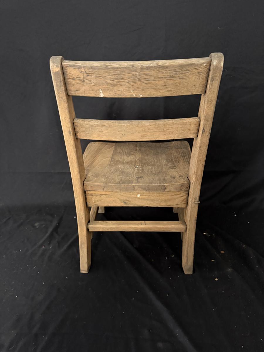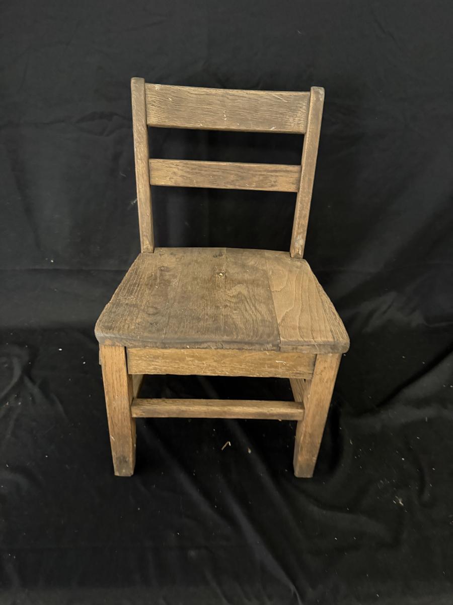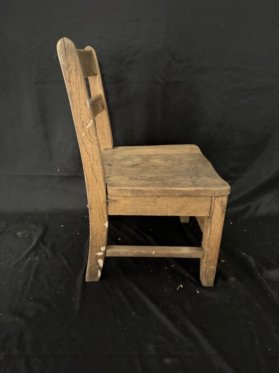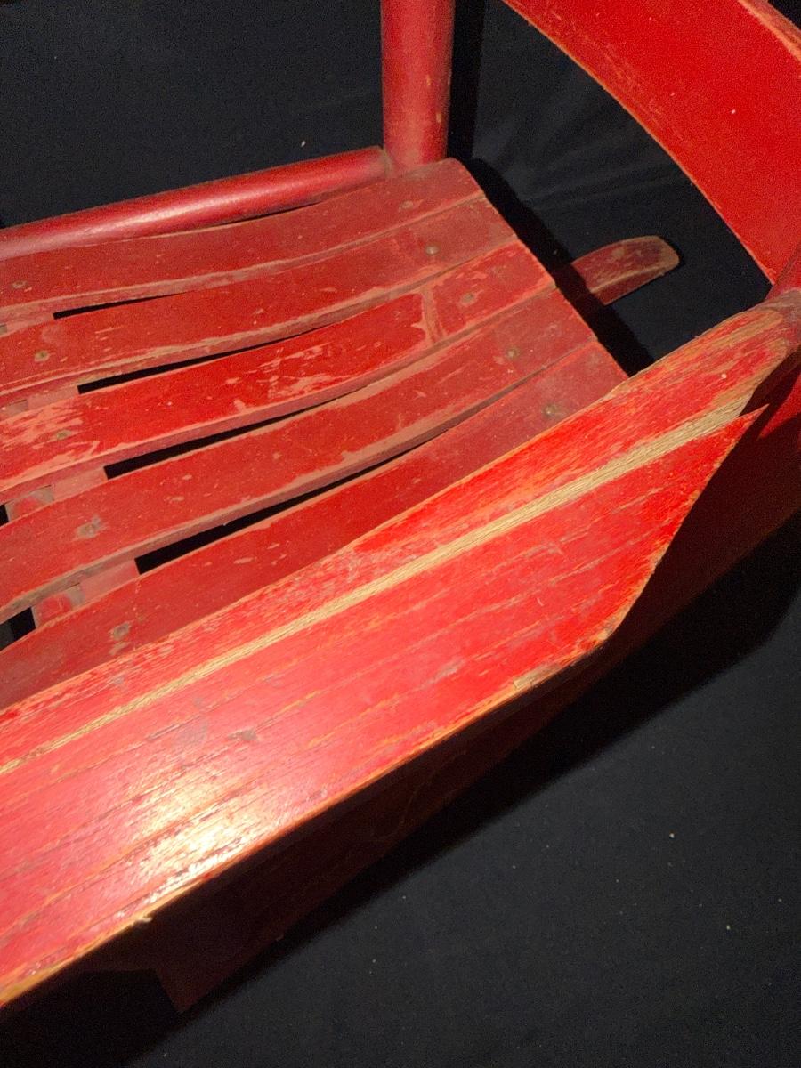 Lot includes a painted red wooden child’s rocker and a wooden child’s chair. Rocker measures 14” x 20” x 22”H with a 9” seat height. Rocker has split armrest and chair has chunk missing on seat, see pictures.
