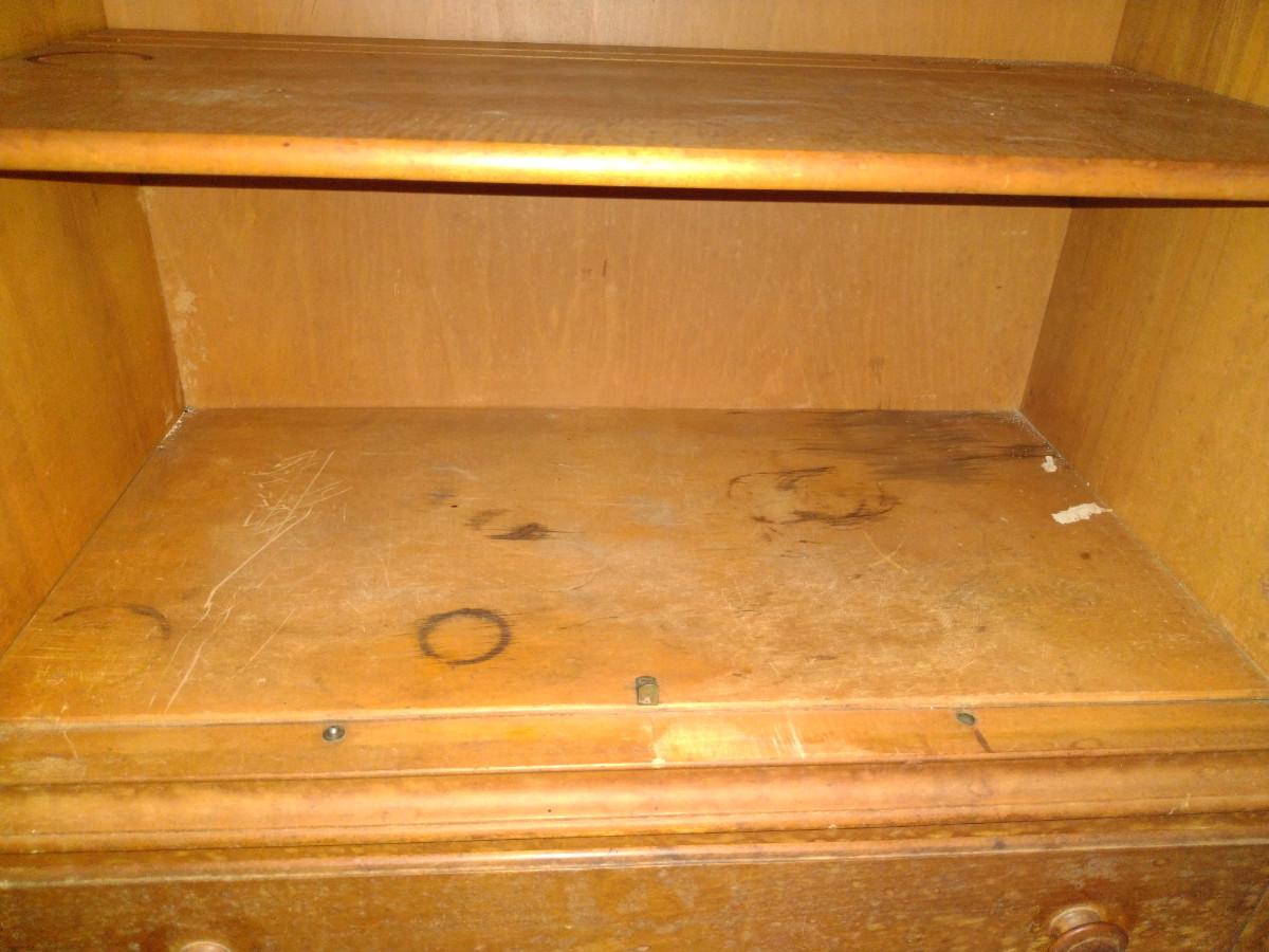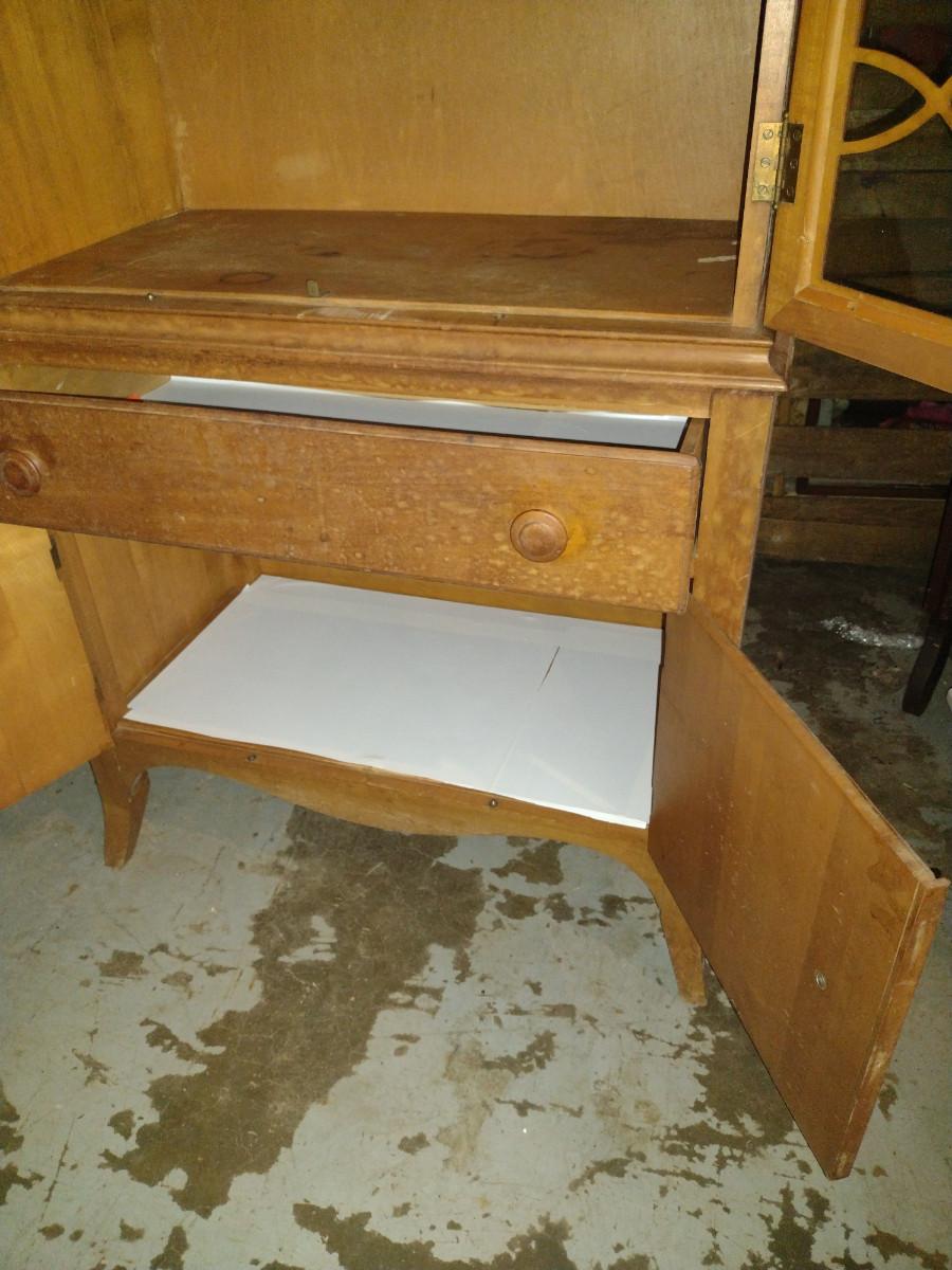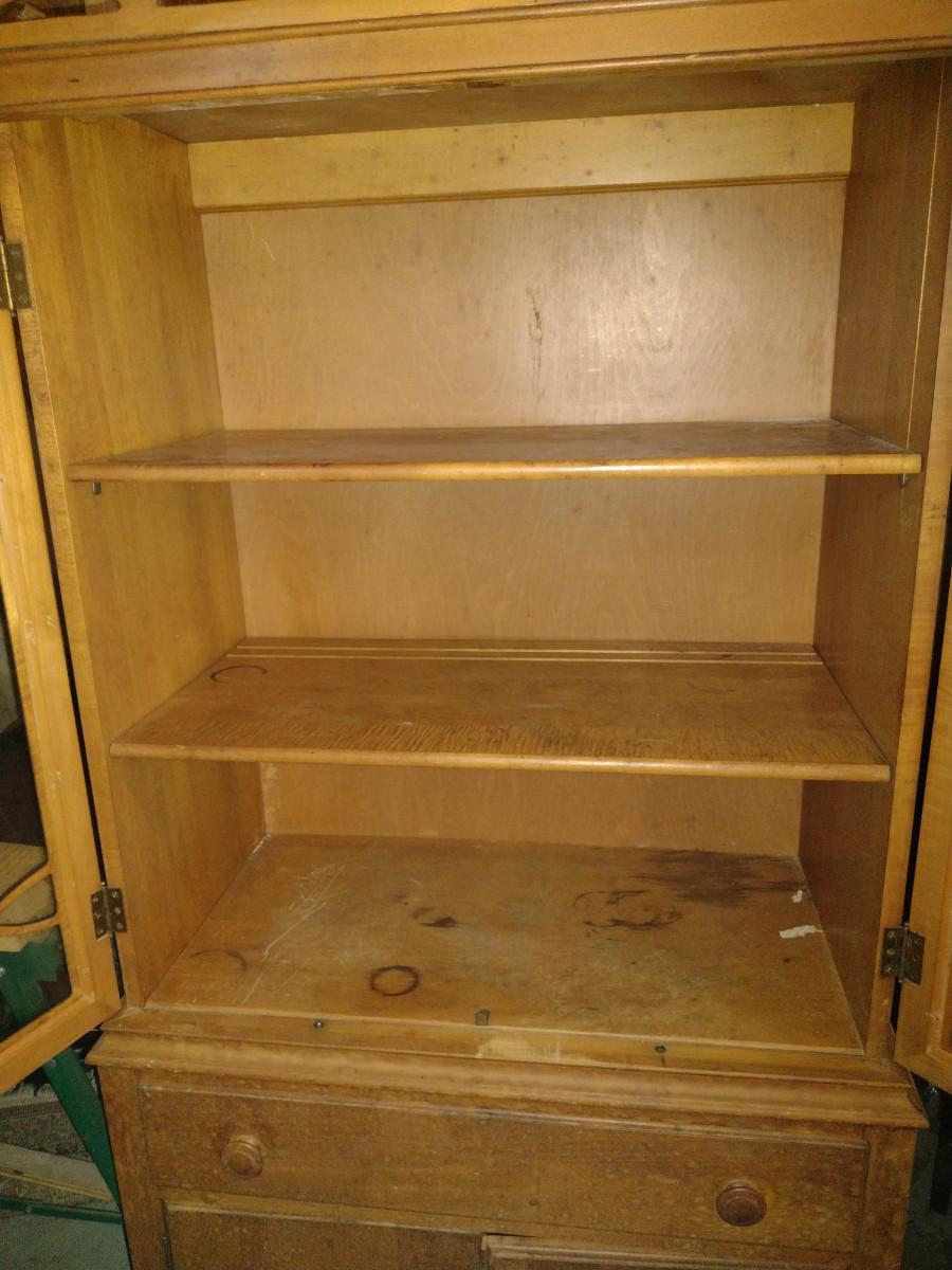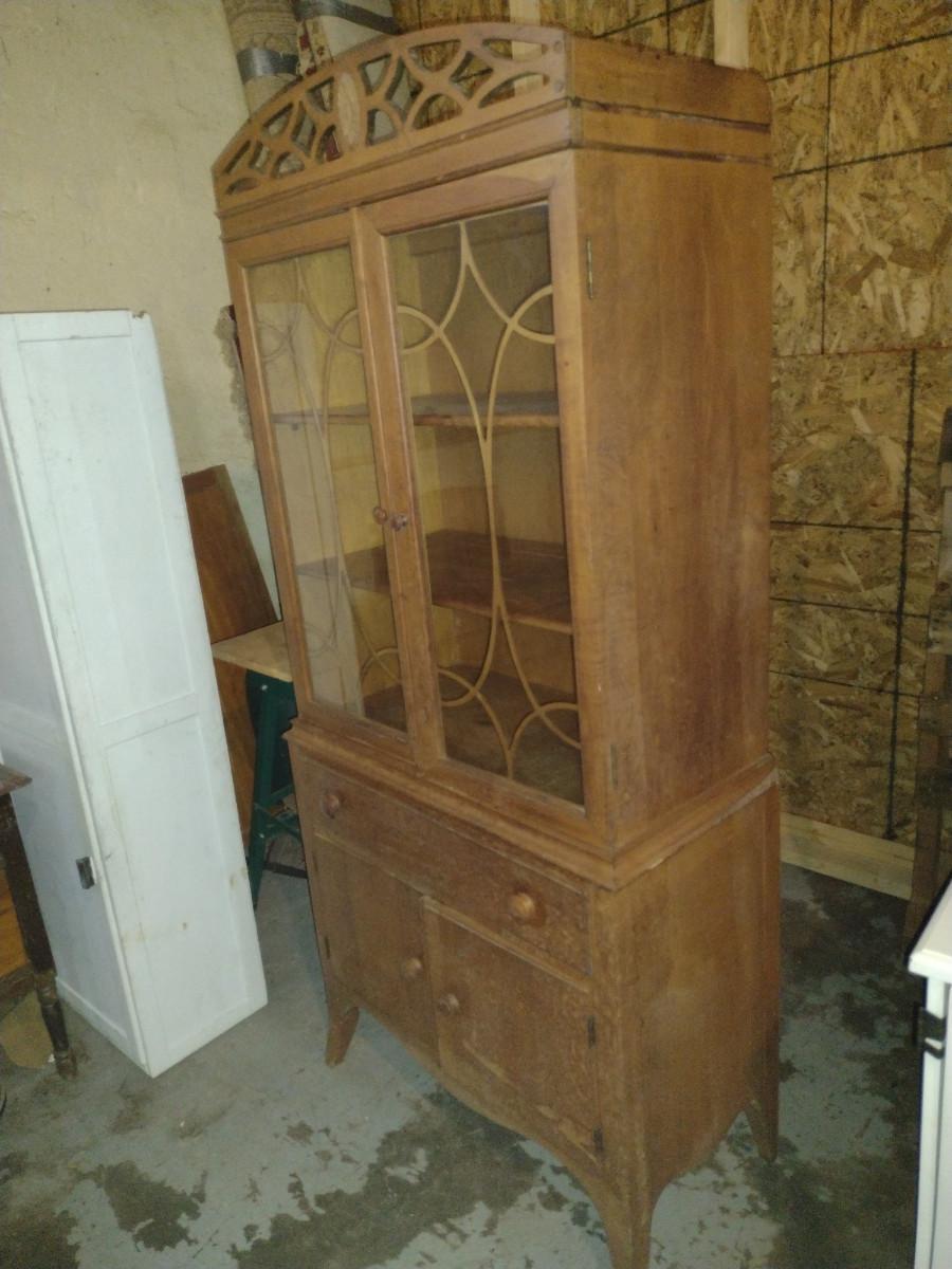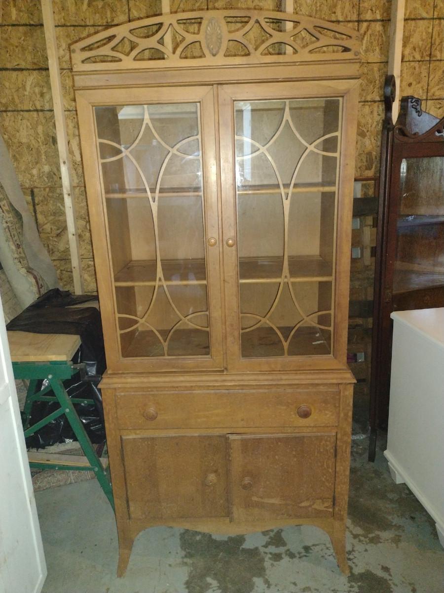 Wooden China Hutch. Measures approx 32" x 18" x 70" tall. Some screw/nail covers on trim are missing- please see all pictures.