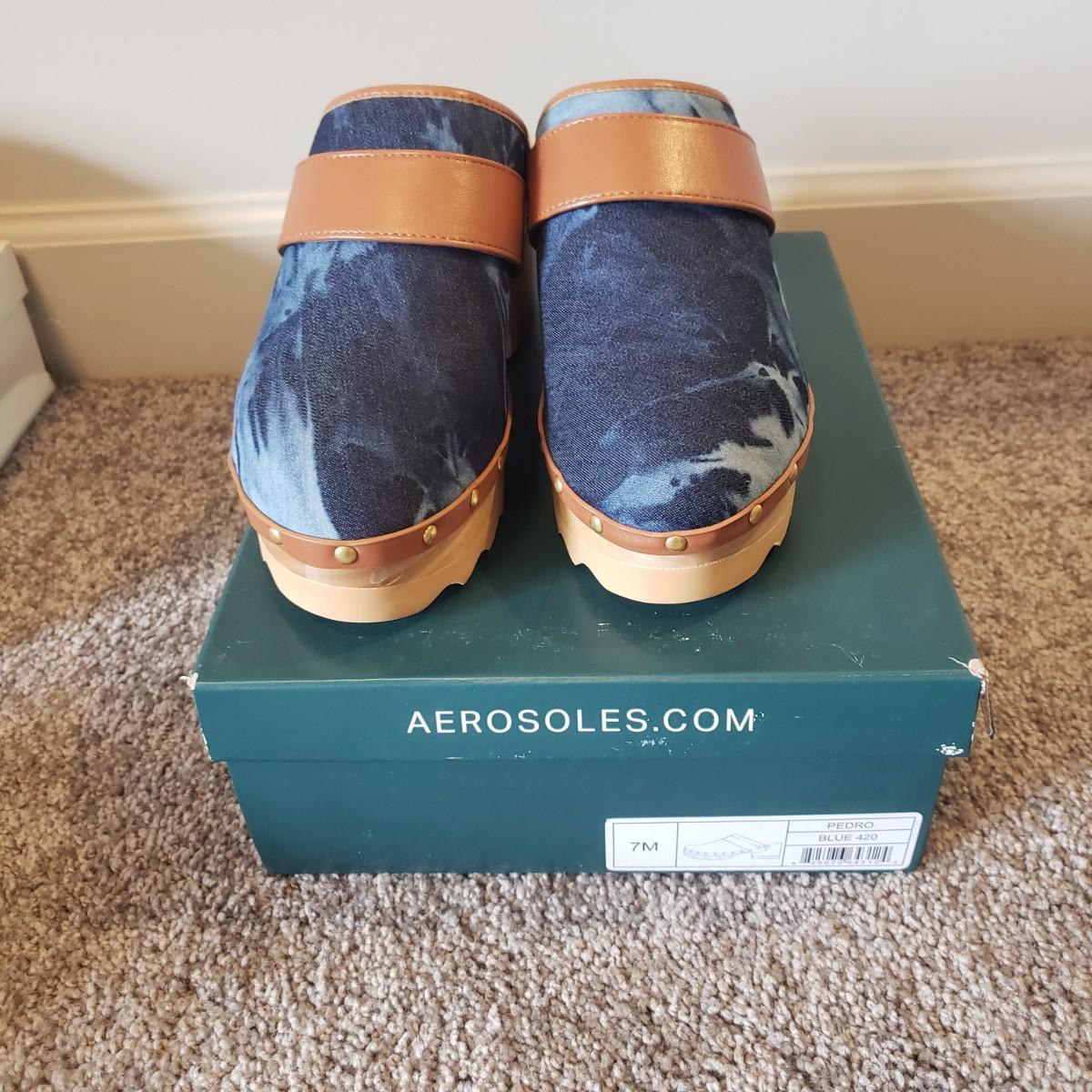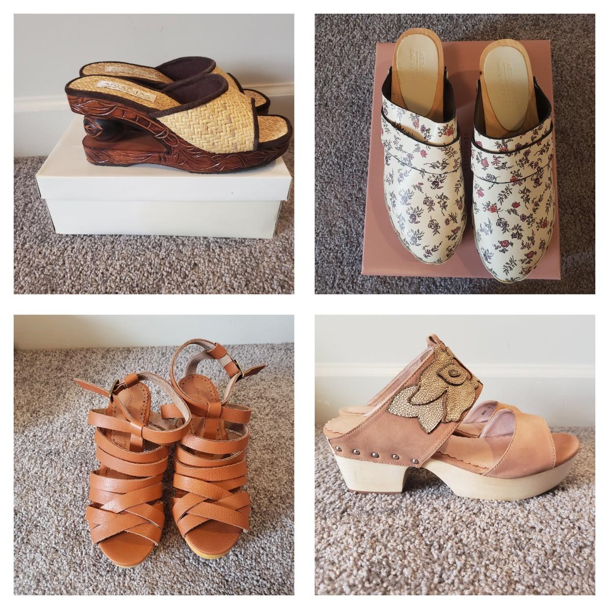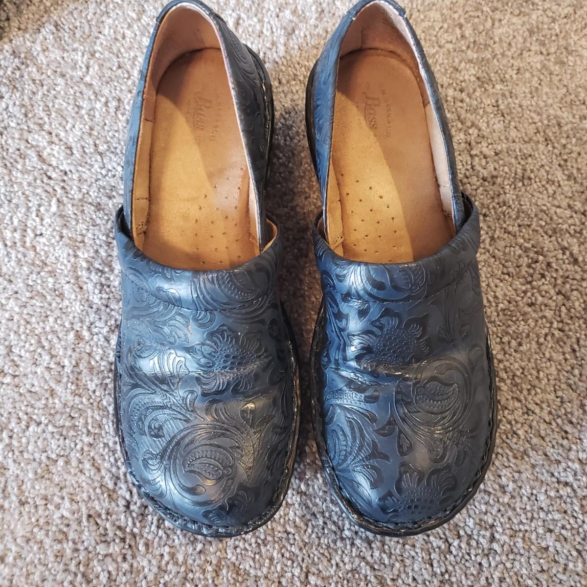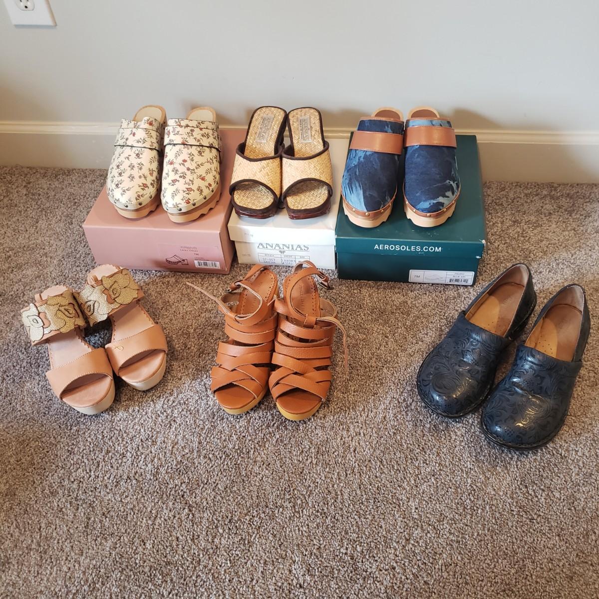 This clog lot has six pairs of shoes. All pairs are size 7, except the blue Bass clogs, which are size 8. See pictures for condition and size for each pair.