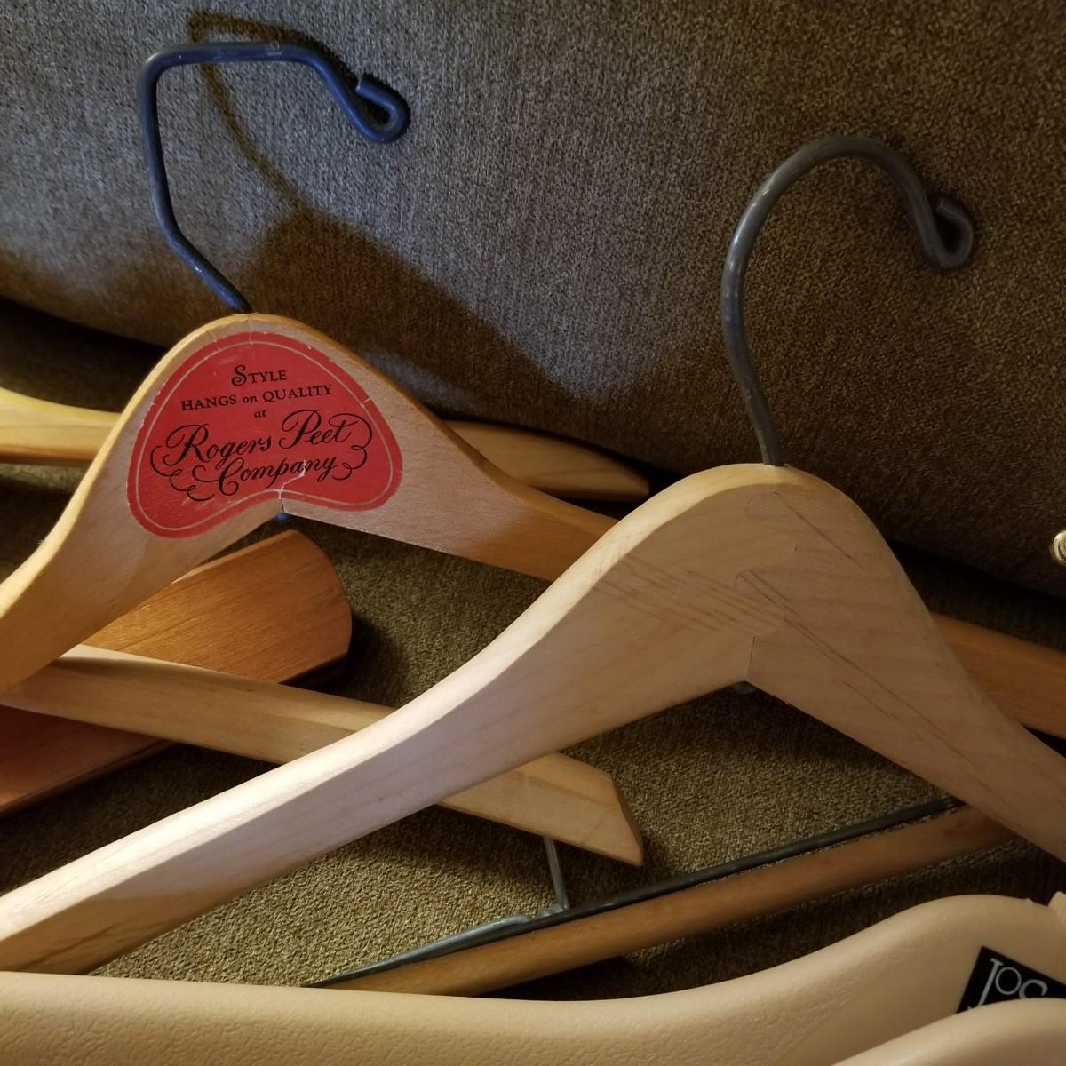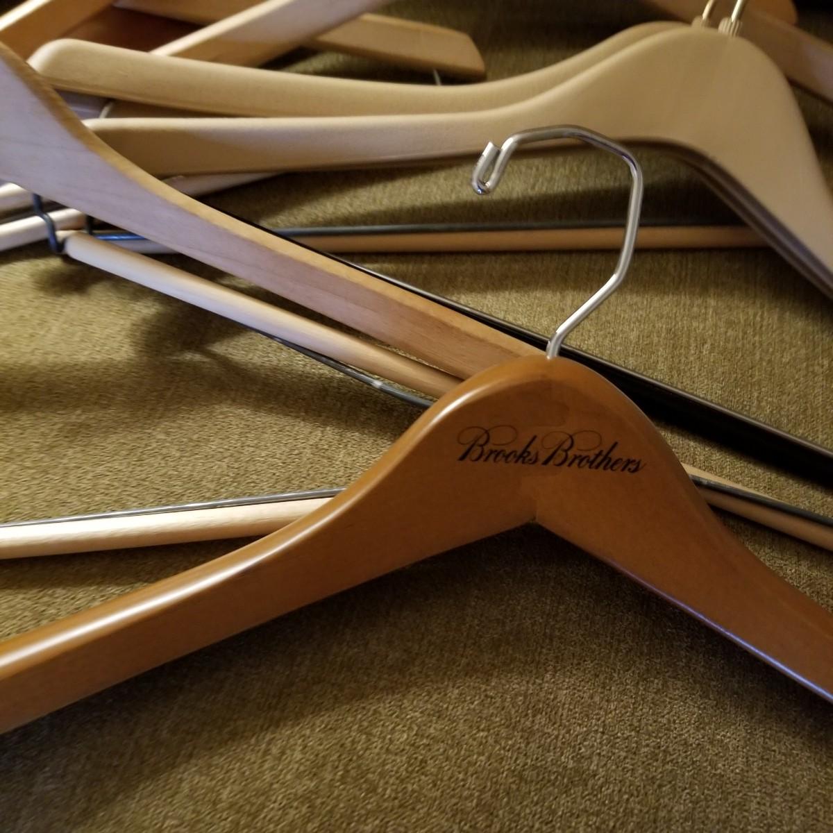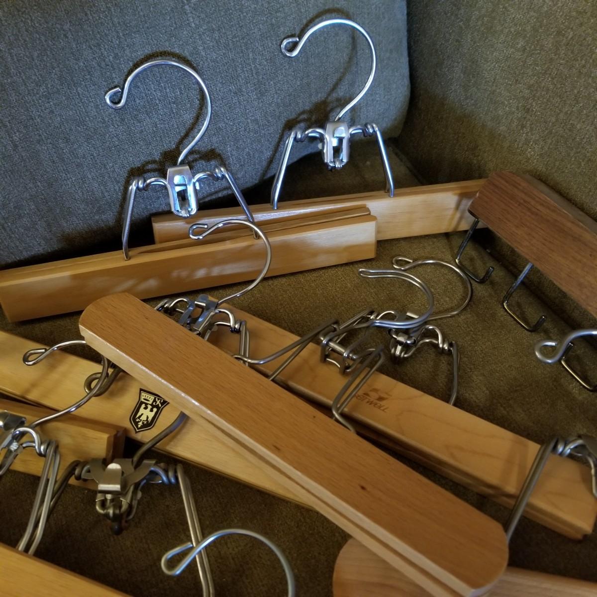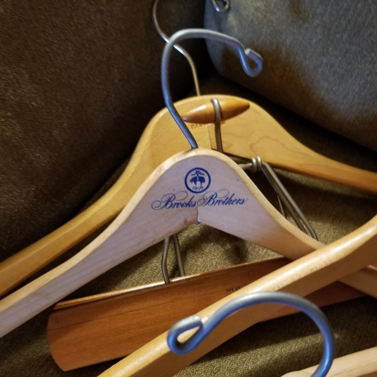 Twenty-one coat/pants hangers, nineteen wood and two plastic. Brooks Brothers, Jos A Banks, Setwell. Thirteen are the clamp style pants hanger for dress slacks, the others are heavy duty for suit coats and more. See photos for details. Shipping available.