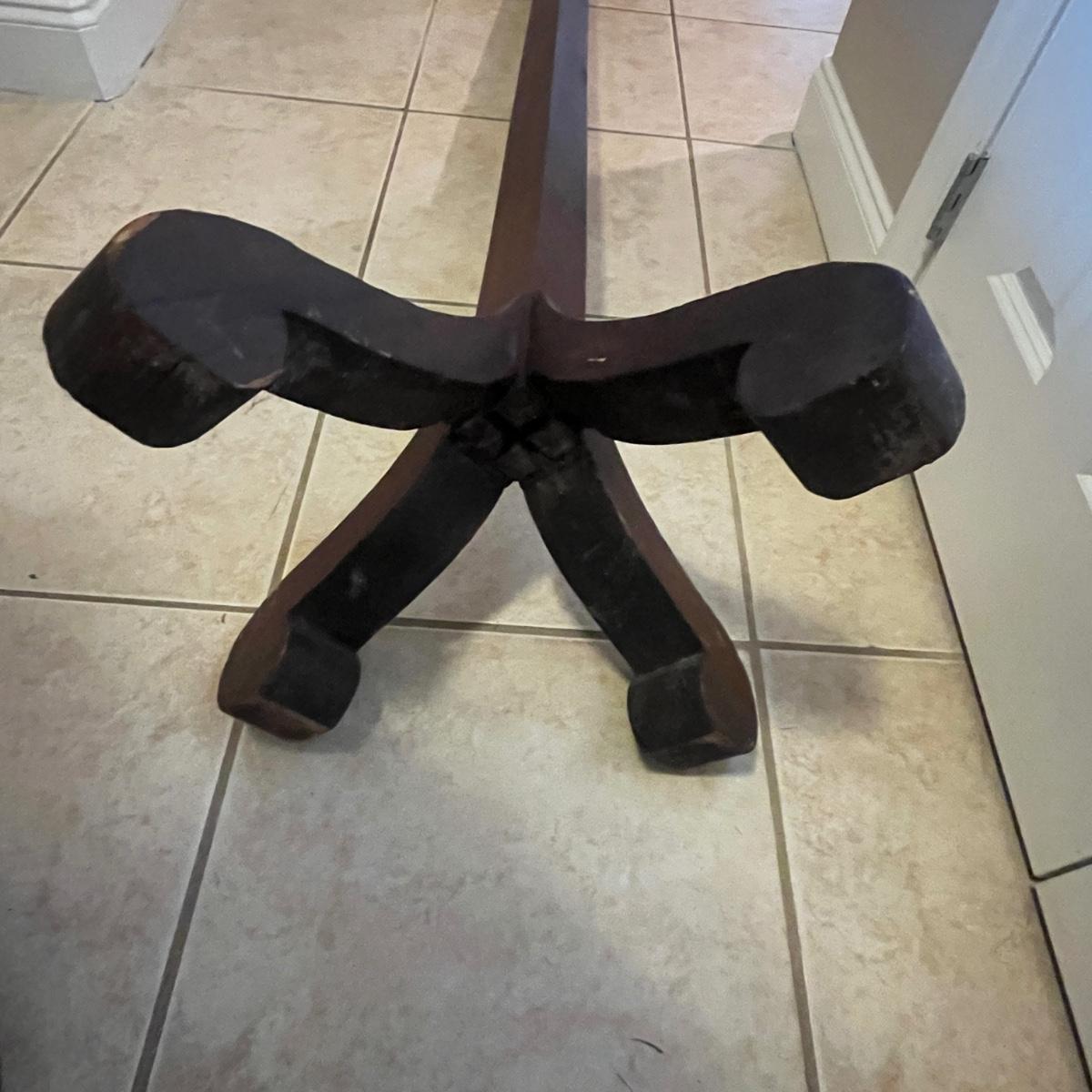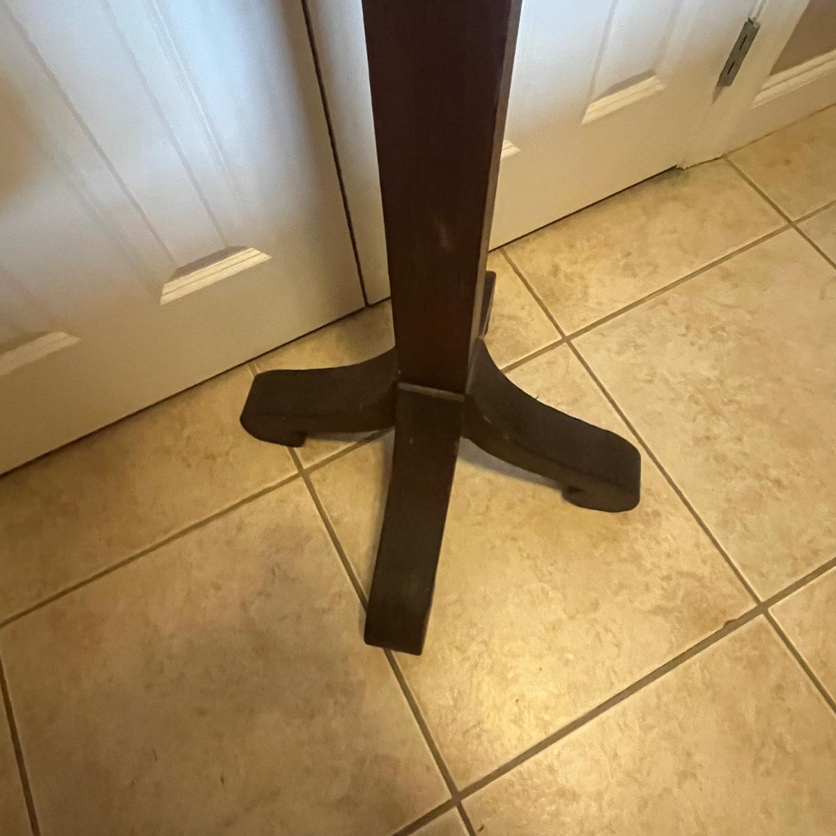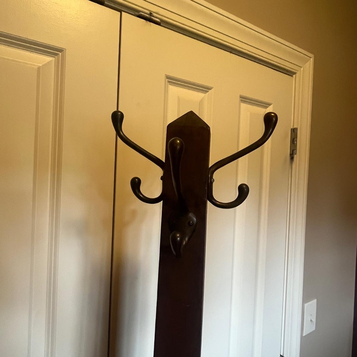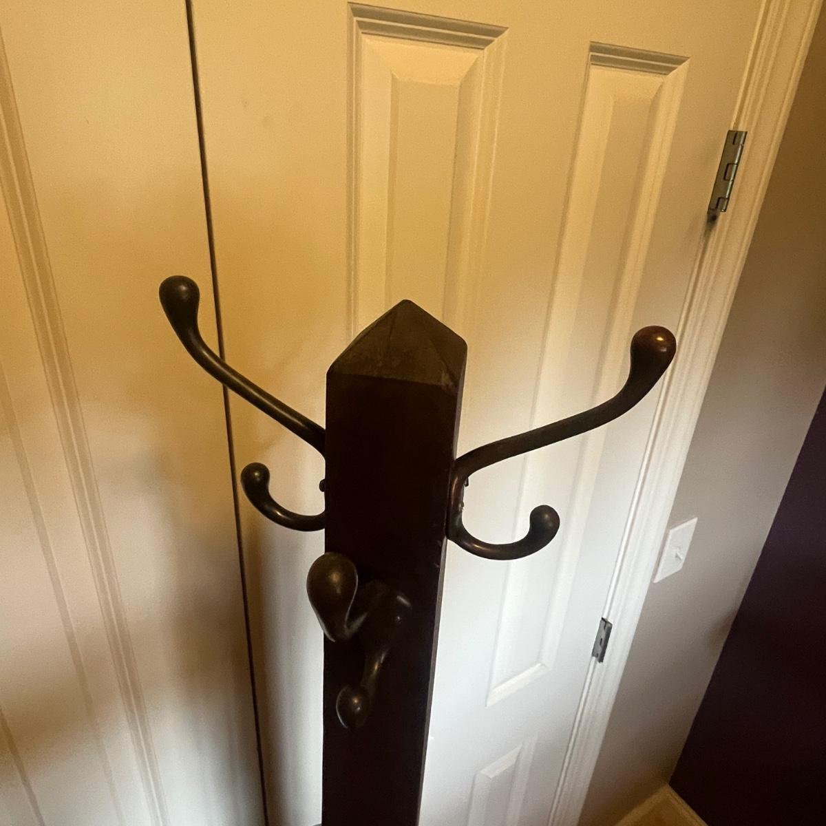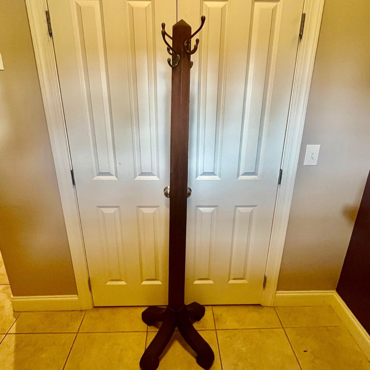 Lot includes a solid wood coat rack with four metal hooks. Rack measures 17.5” x 17.5” x 71”H.