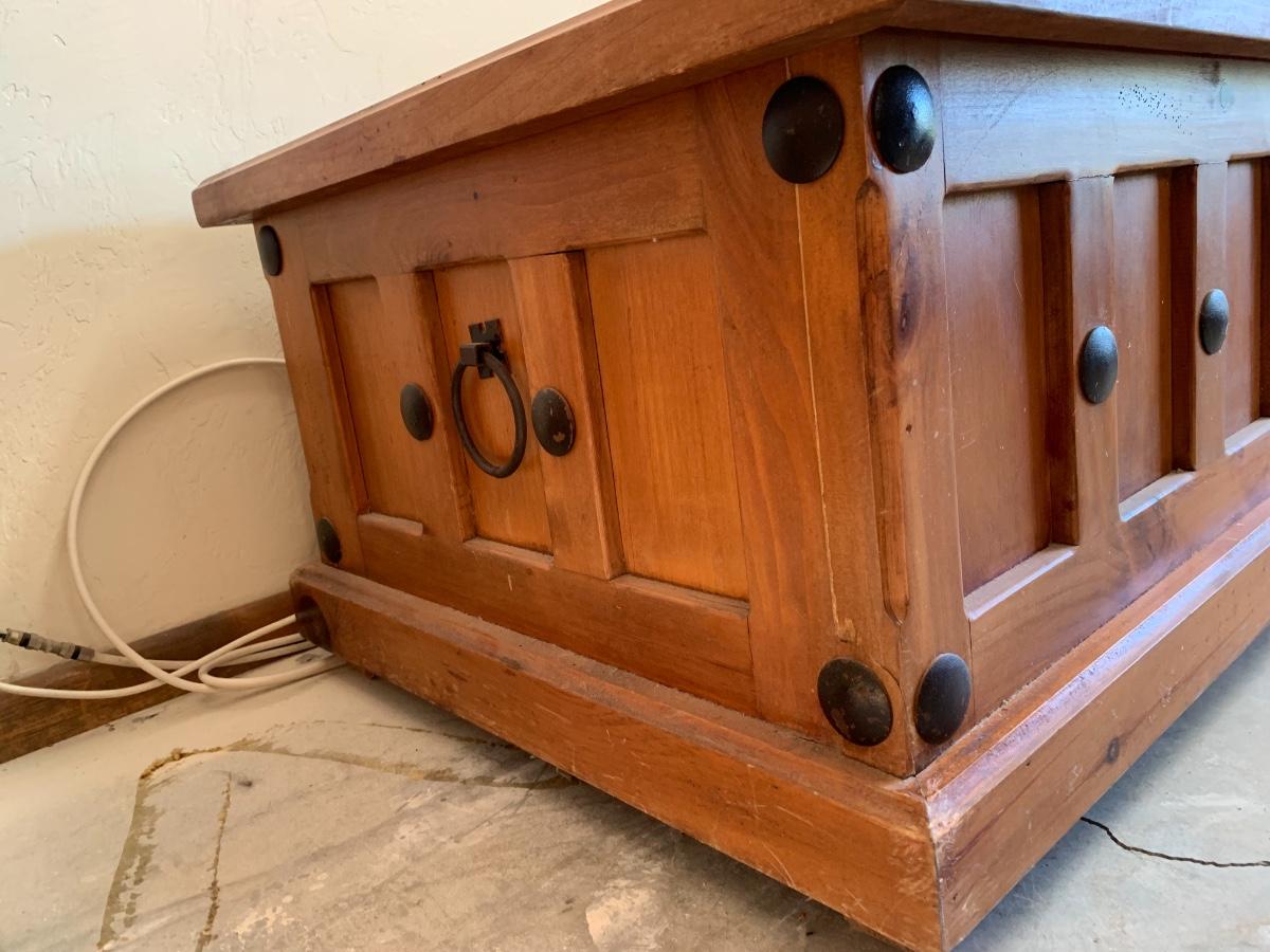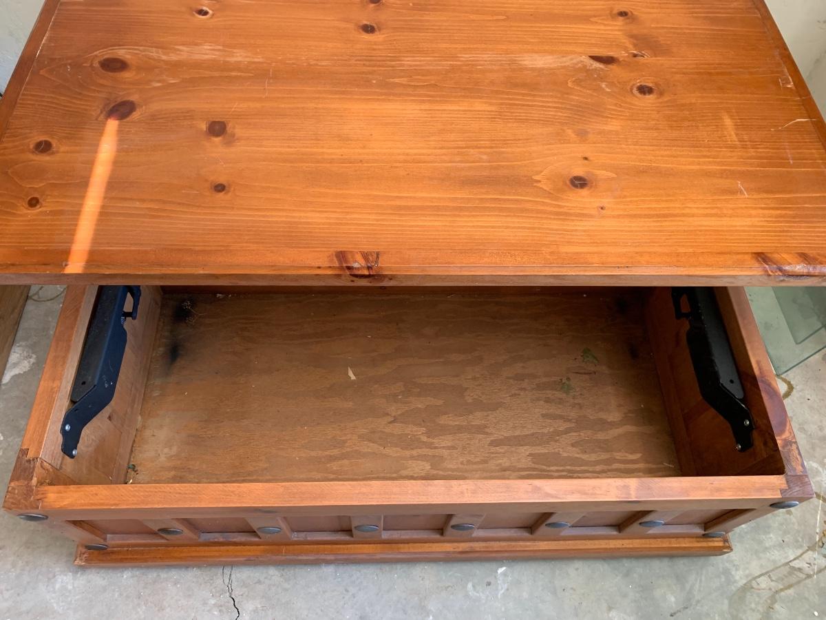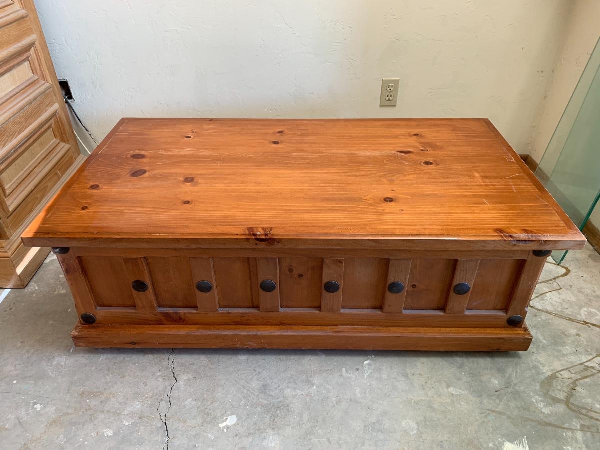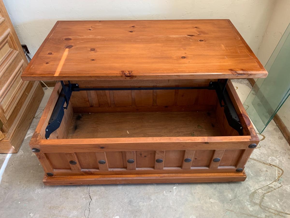 One wood coffee table with blanket storage and lift top with damage to the top and bottom left leg.
