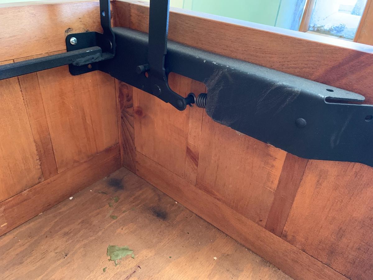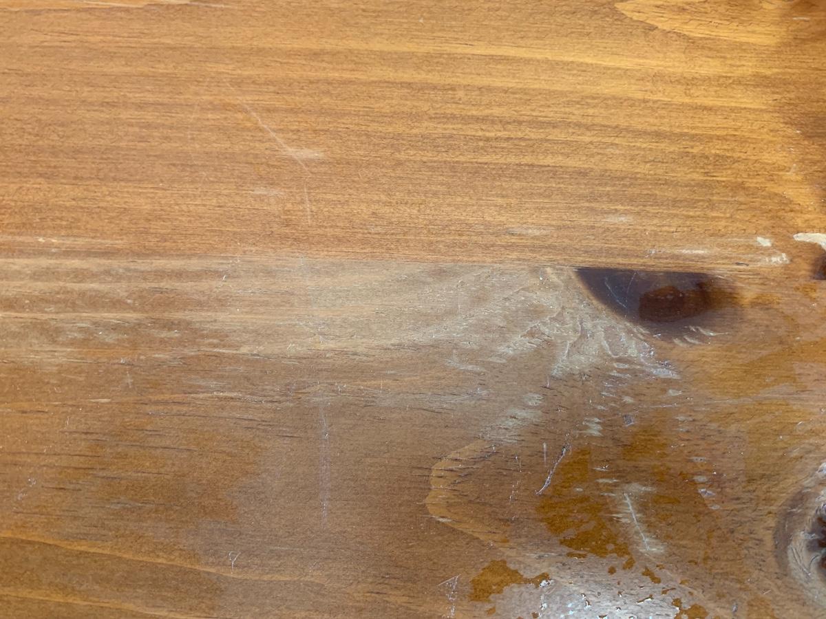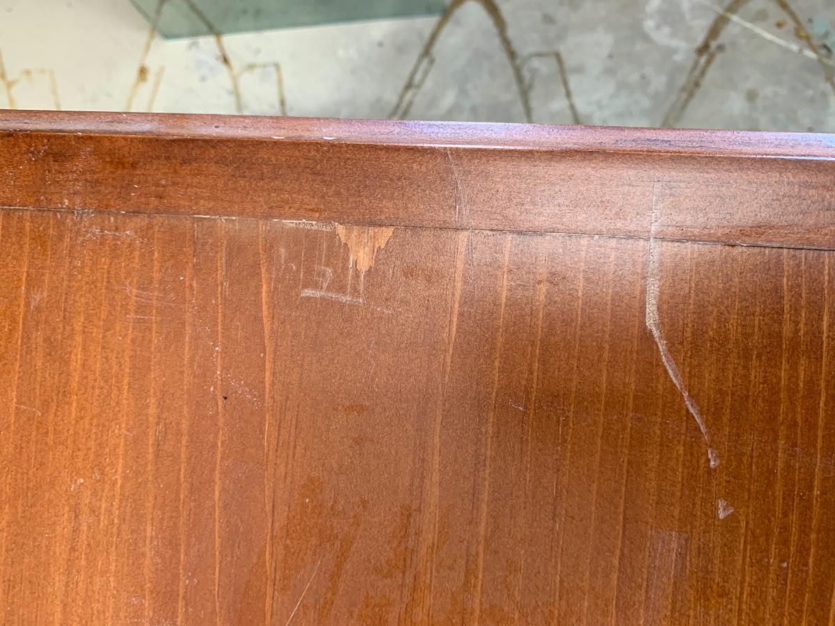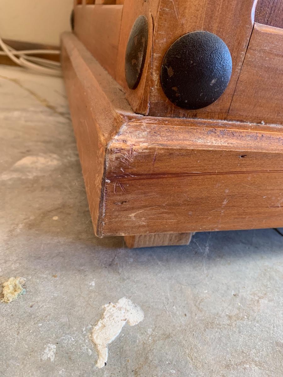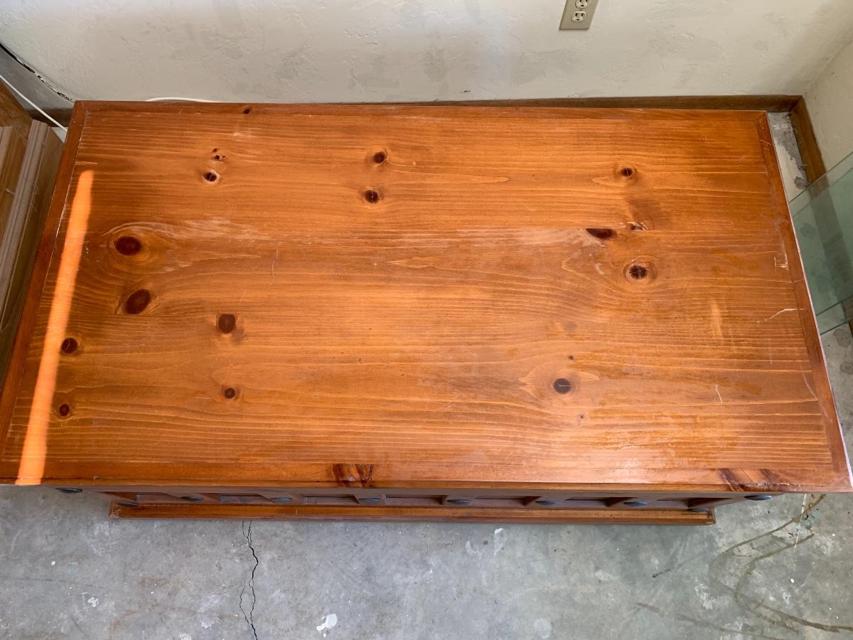 One wood coffee table with blanket storage and lift top with damage to the top and bottom left leg.