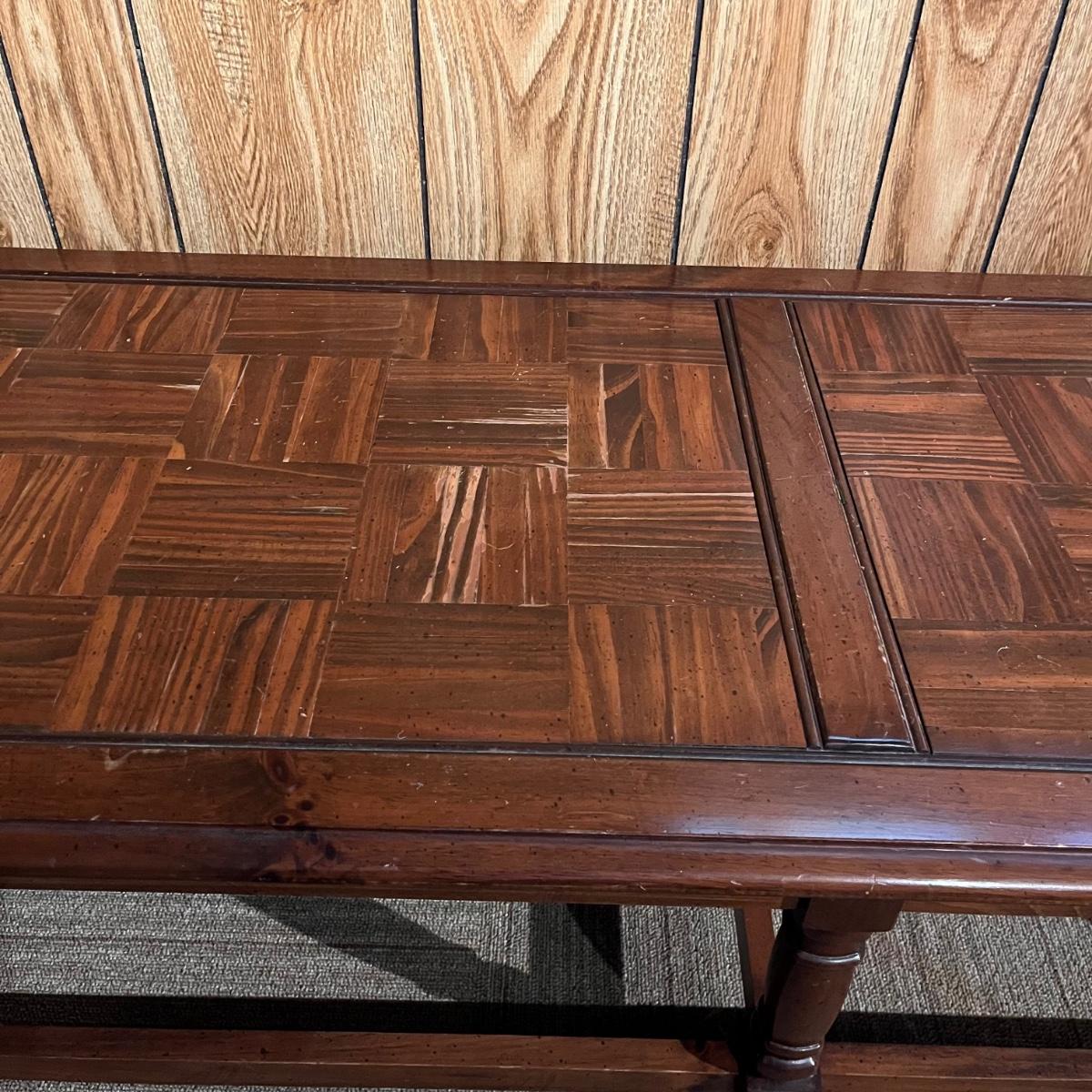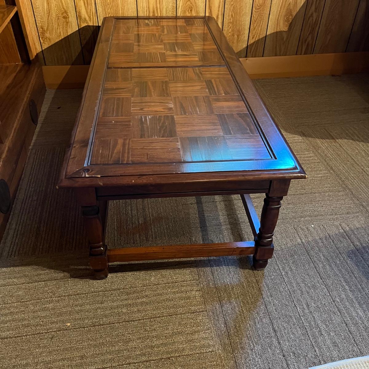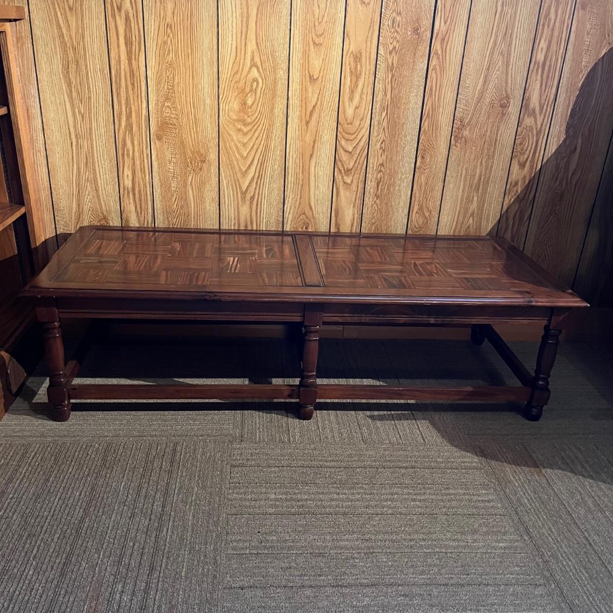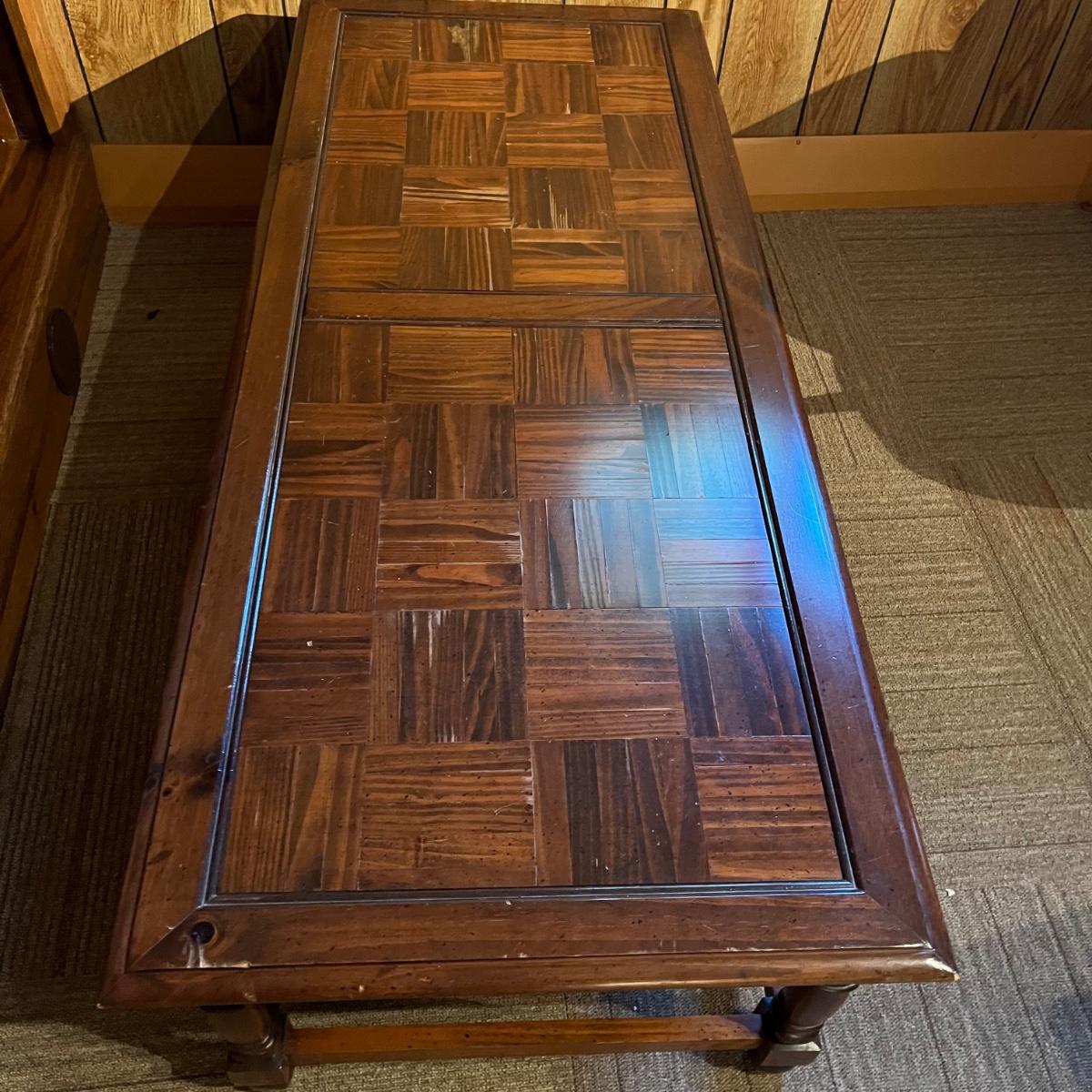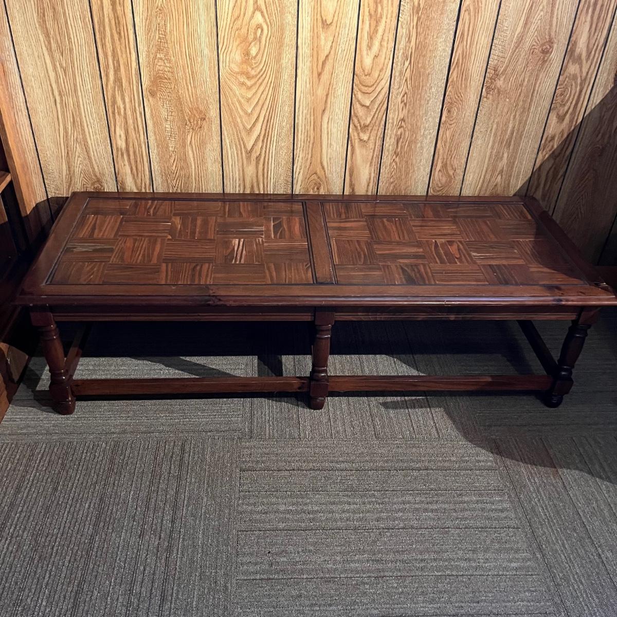 Lot includes a wooden coffee table with a parquet design. Table has some wear on top, see pictures. Table appears to be solid wood with the parquet section being press board with veneer. Table measures 22” x 53.5” x 15”. This matches lot 65.