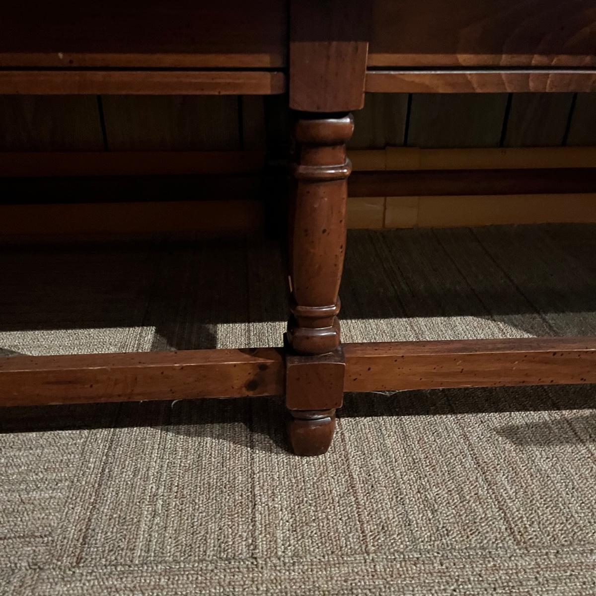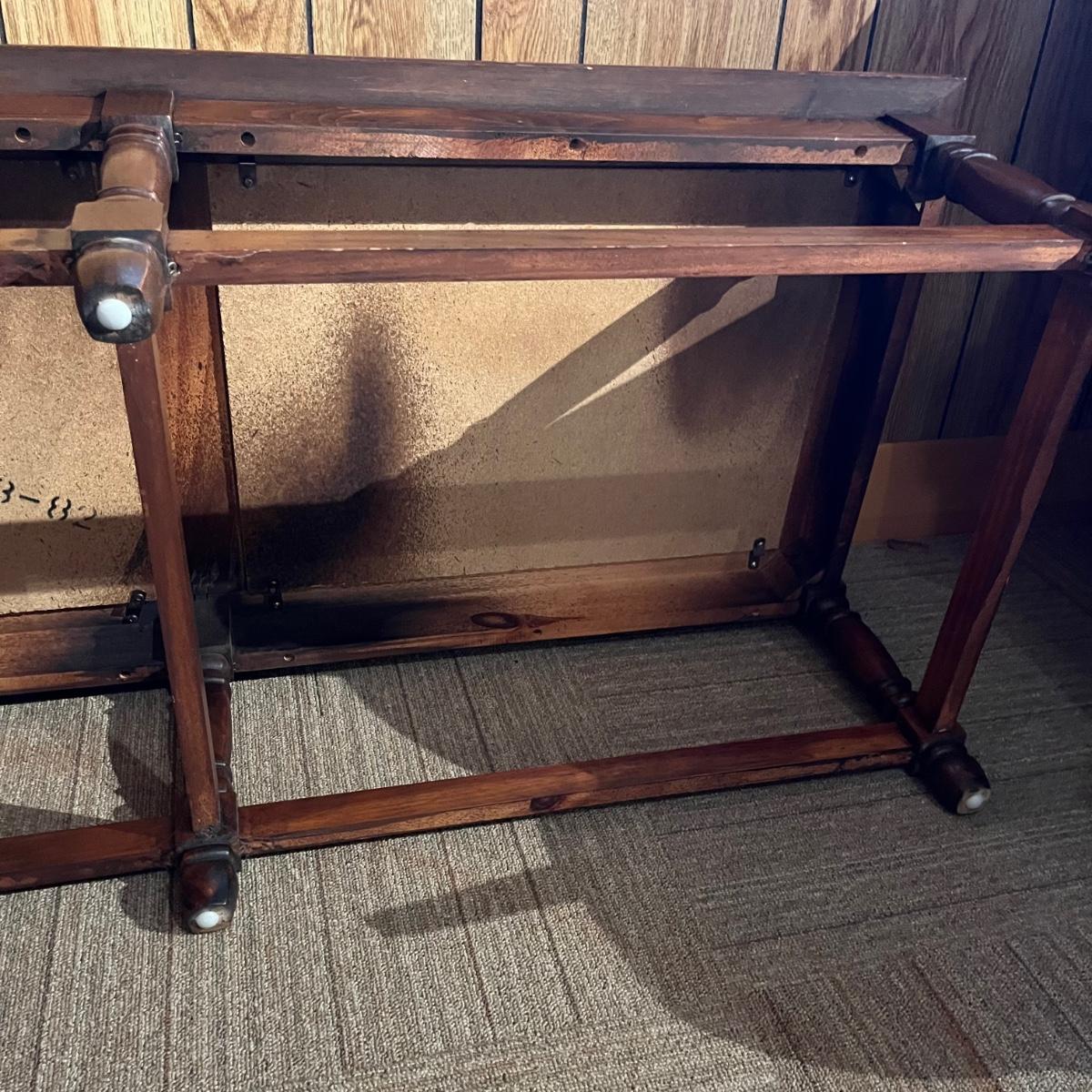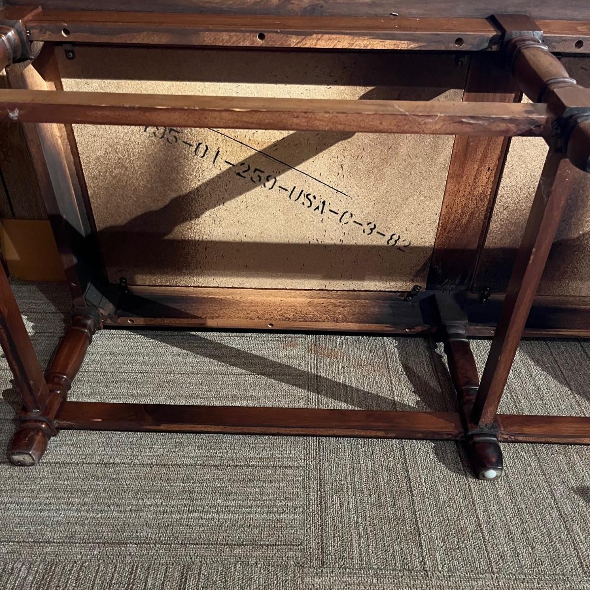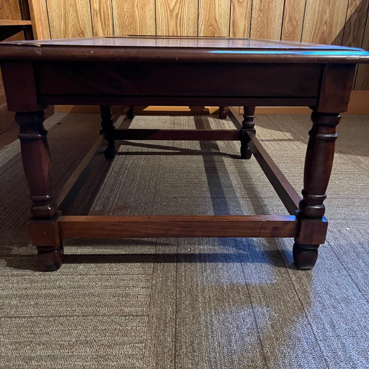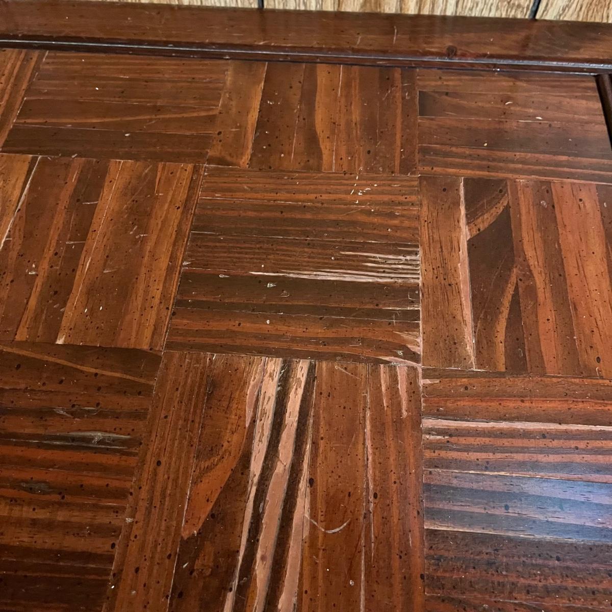 Lot includes a wooden coffee table with a parquet design. Table has some wear on top, see pictures. Table appears to be solid wood with the parquet section being press board with veneer. Table measures 22” x 53.5” x 15”. This matches lot 65.