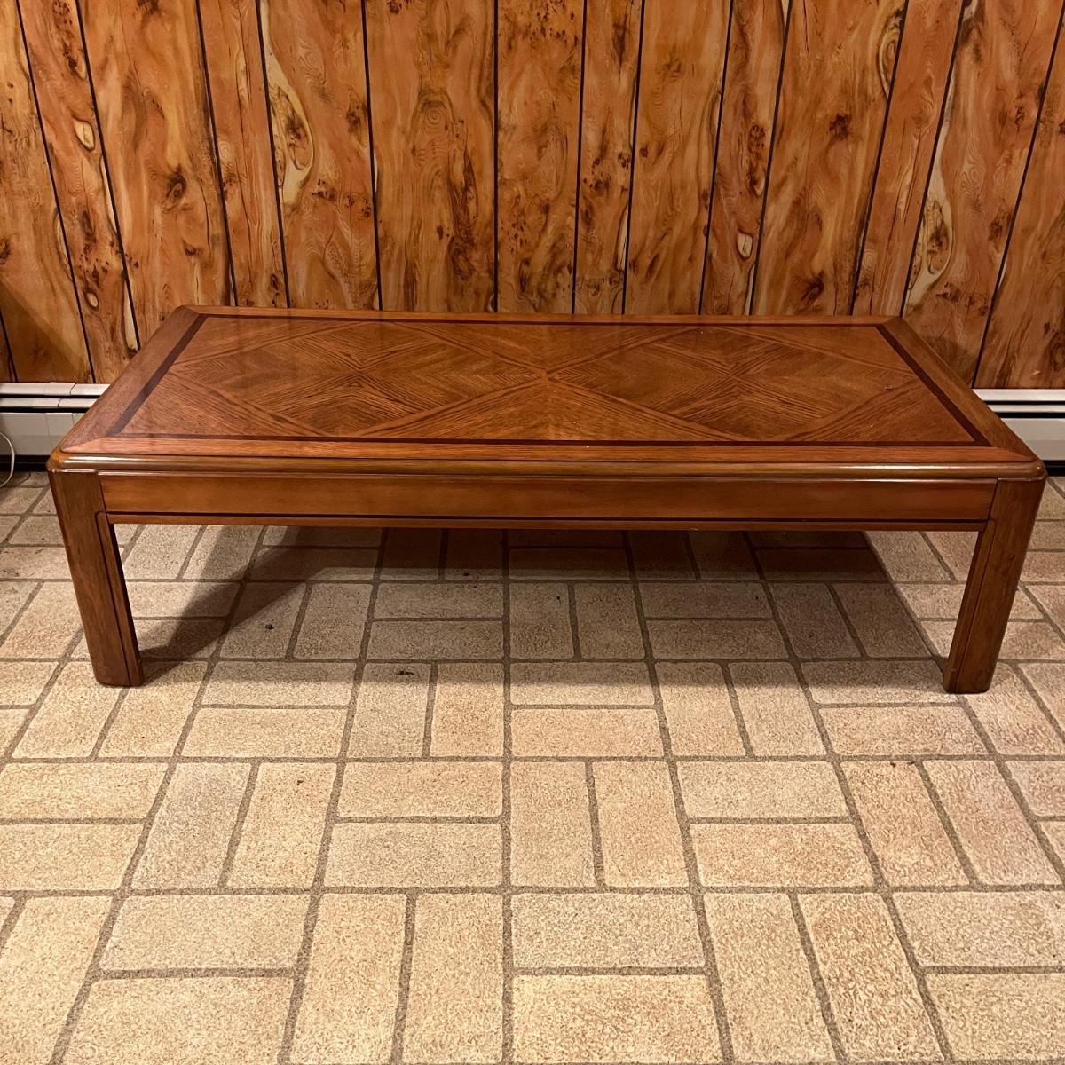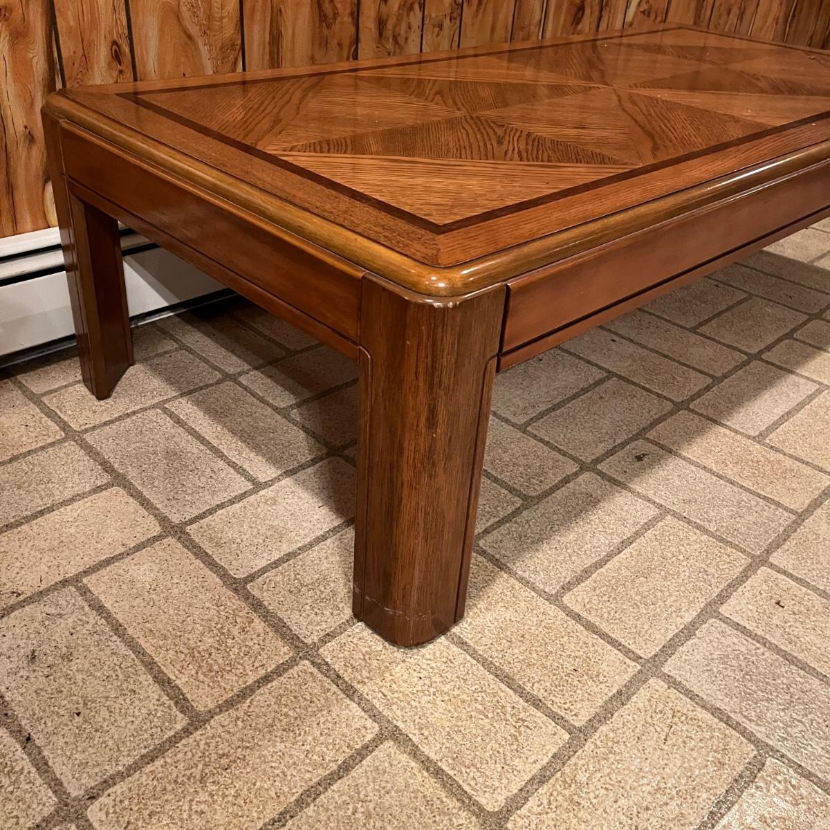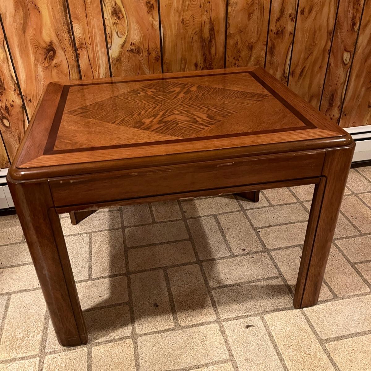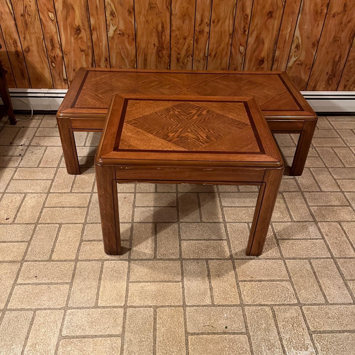 Lot includes a wooden coffee table and matching end table. Both table have solid wood tops with pressed wood sides. Coffee table measures 53” x 26” x 15”H. Tables have some scratches and nicks, see pictures.