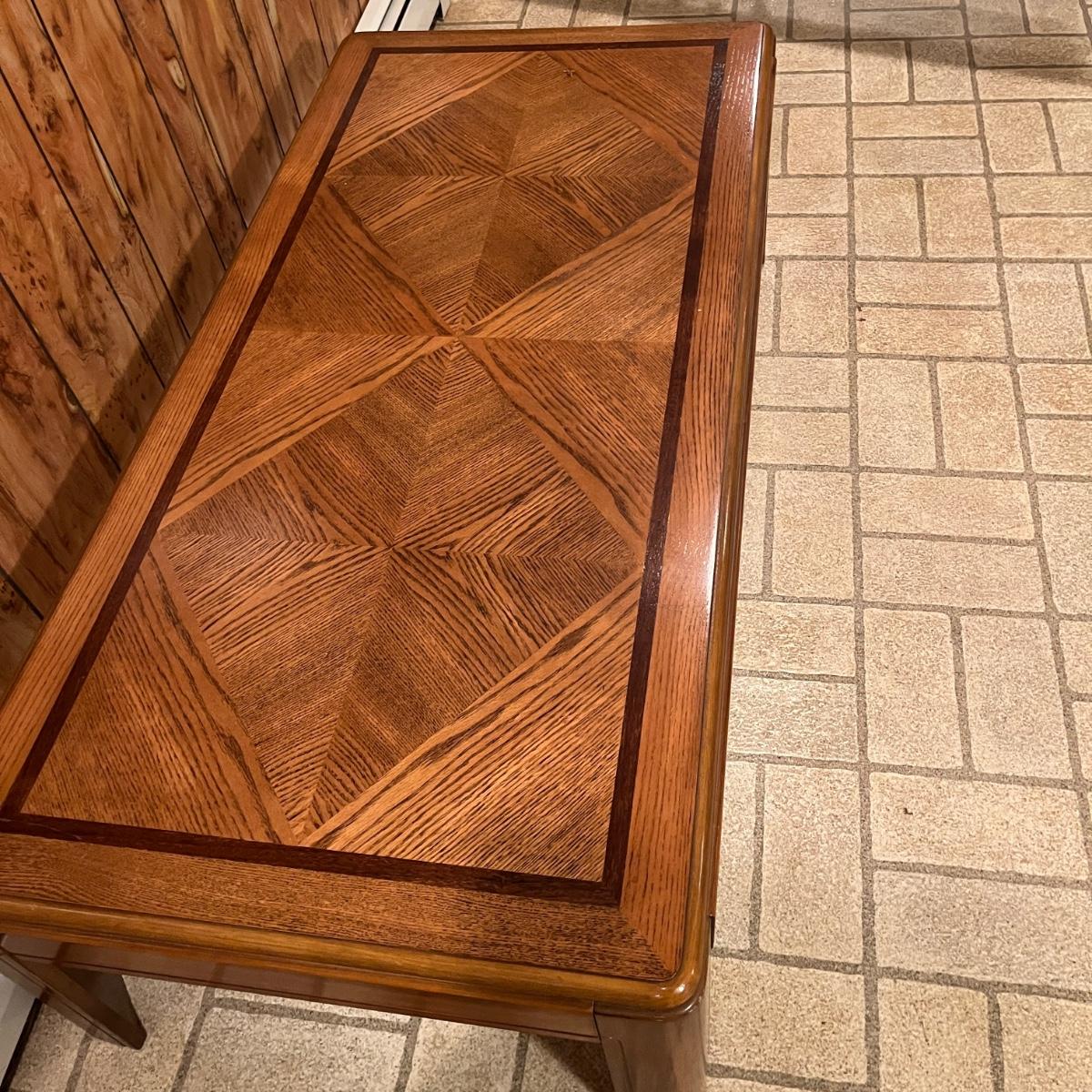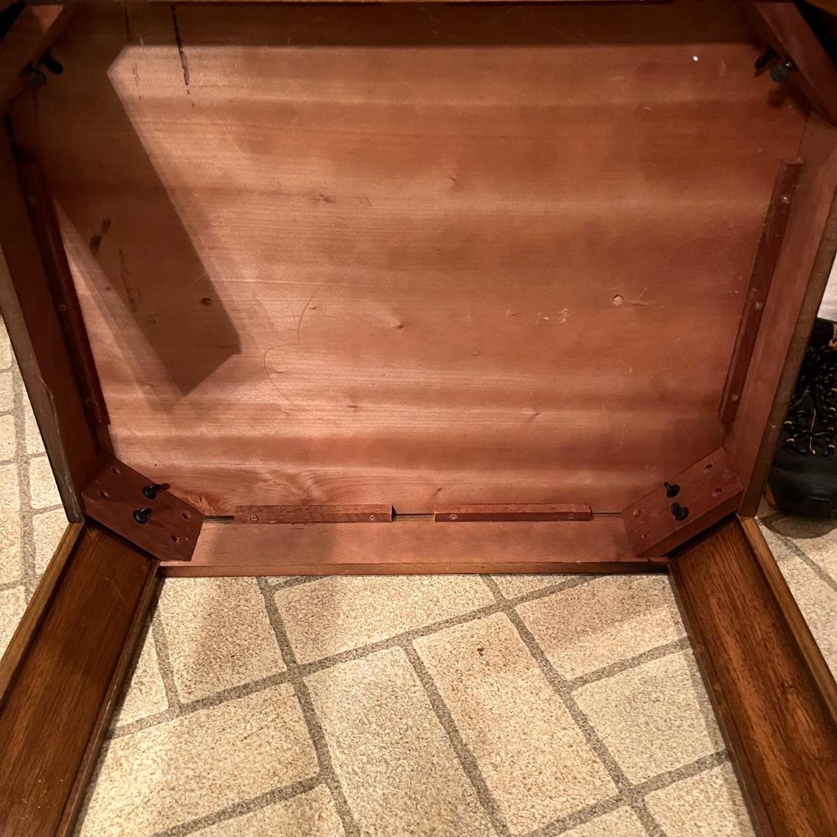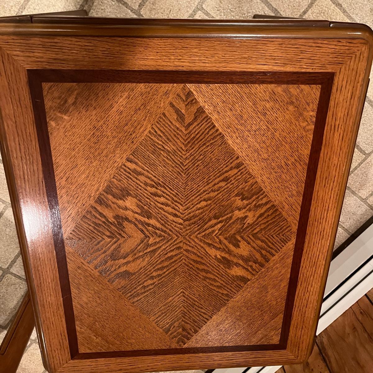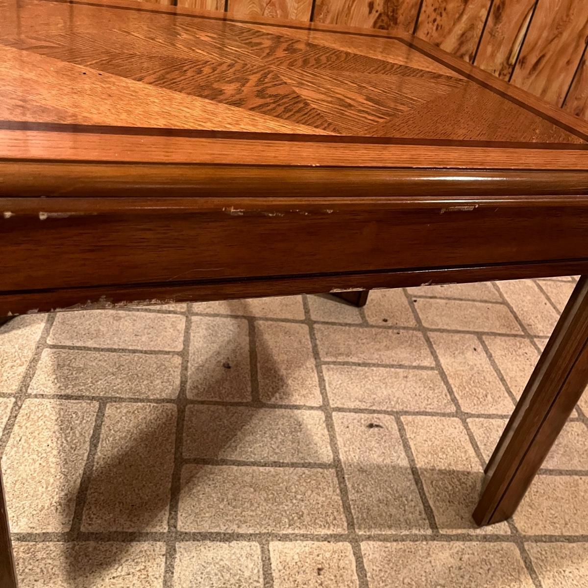 Lot includes a wooden coffee table and matching end table. Both table have solid wood tops with pressed wood sides. Coffee table measures 53” x 26” x 15”H. Tables have some scratches and nicks, see pictures.