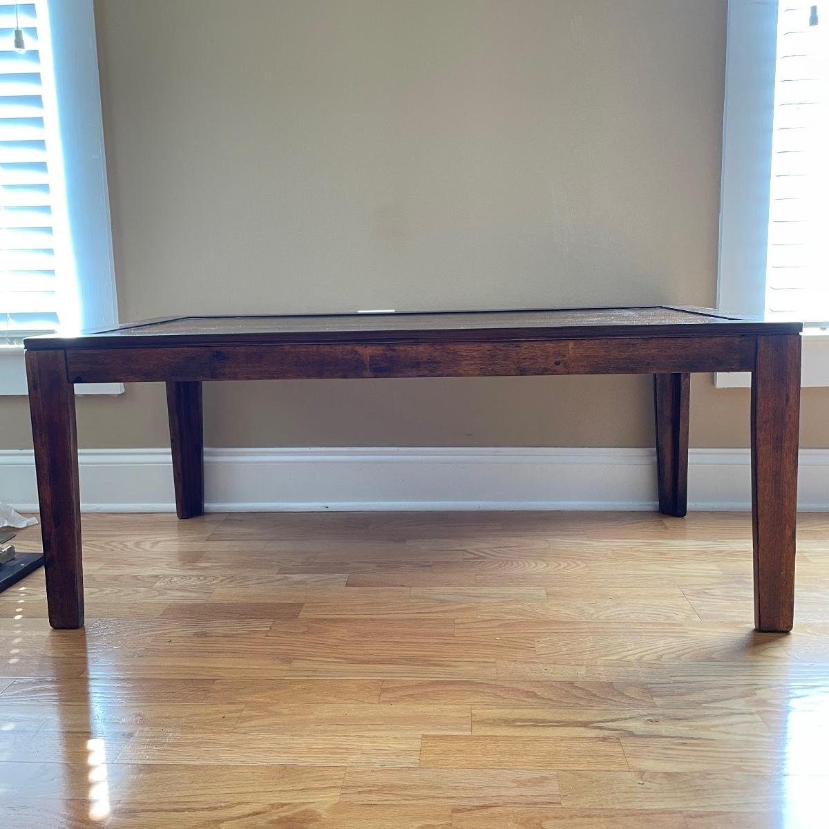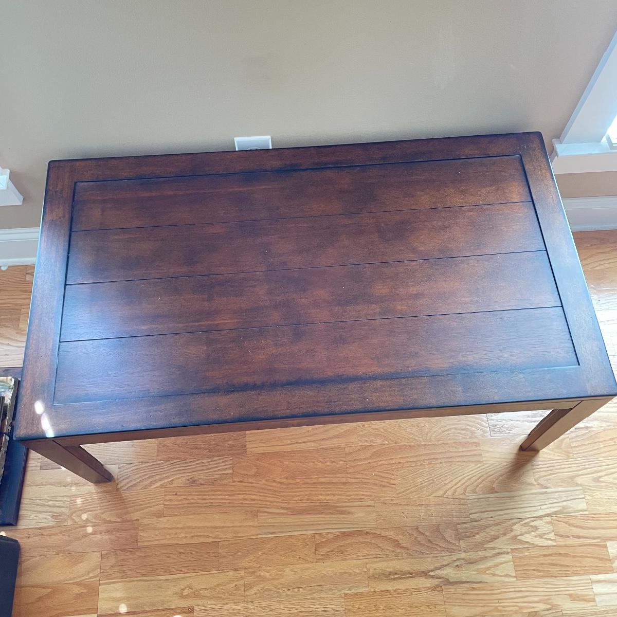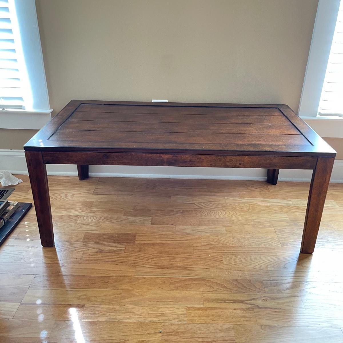 Nice medium/dark brown wooden coffee table. Table measures 42” x 24” x 17”. It has two matching side tables earlier in the sale. Local pick up only.