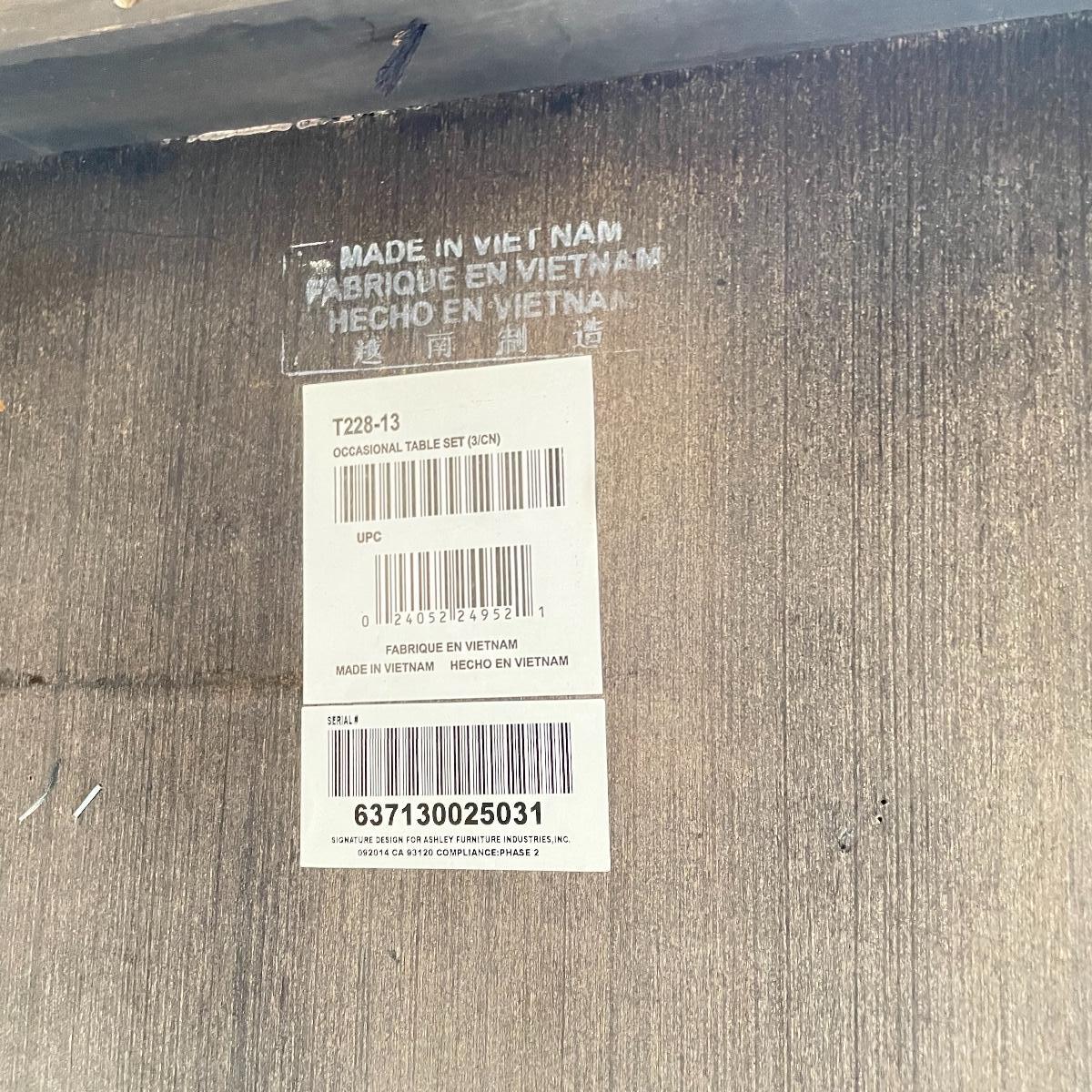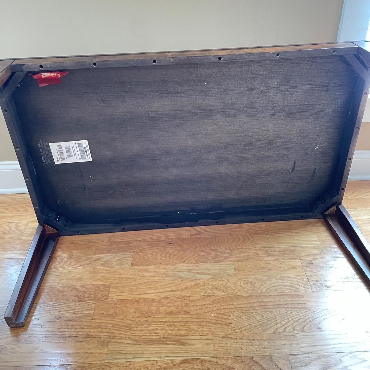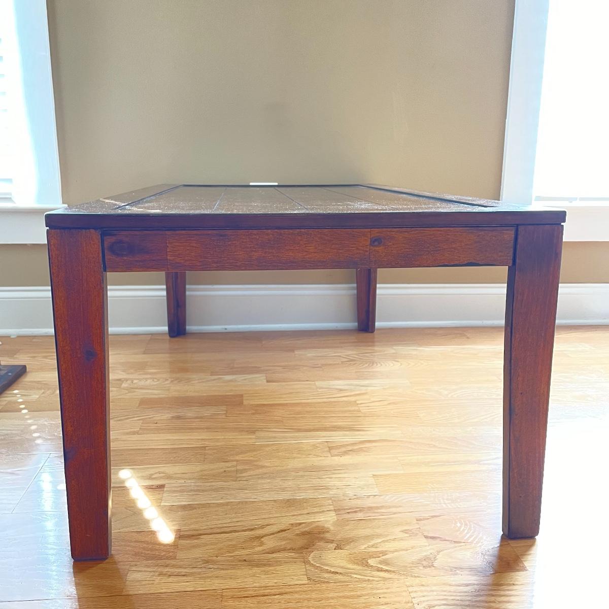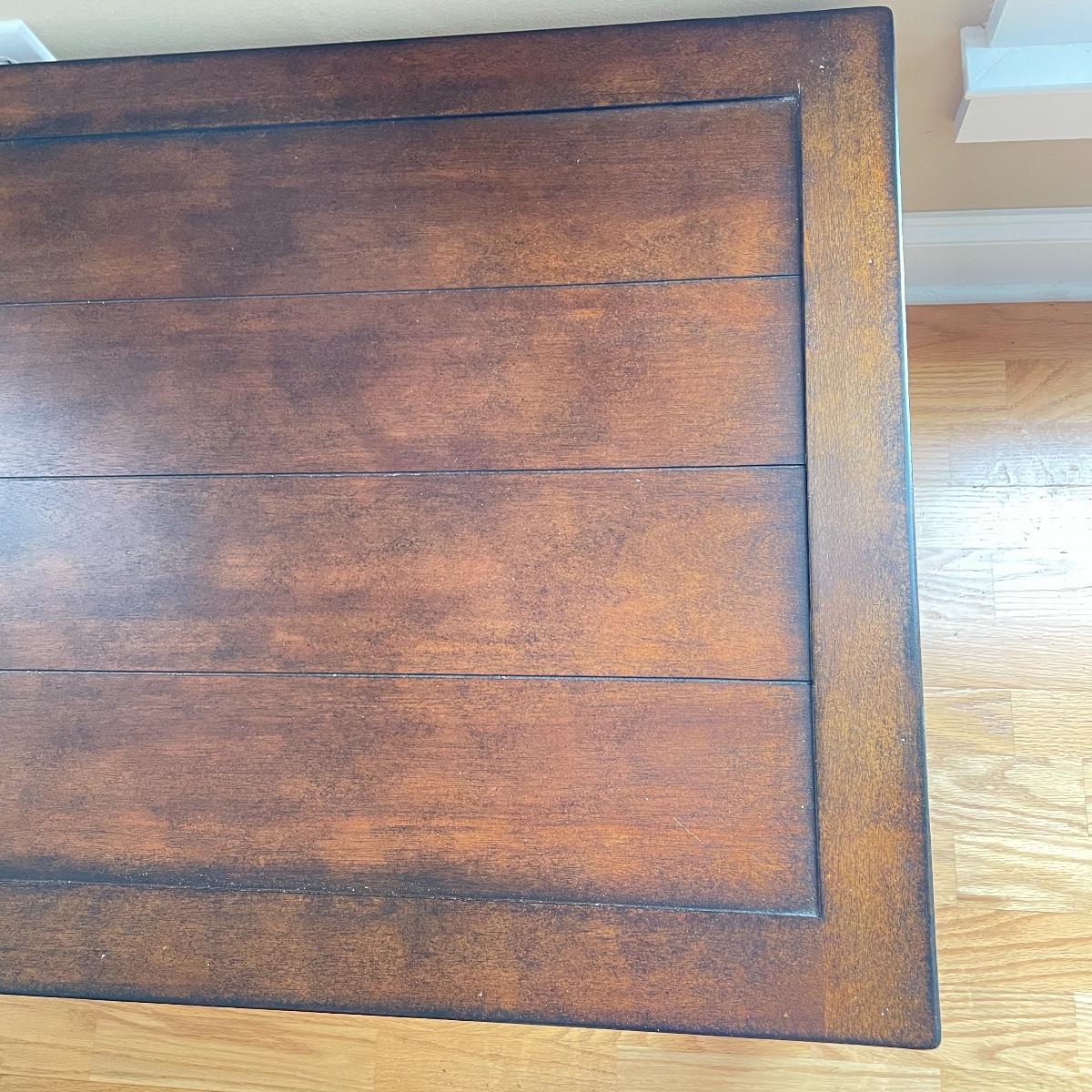 Nice medium/dark brown wooden coffee table. Table measures 42” x 24” x 17”. It has two matching side tables earlier in the sale. Local pick up only.