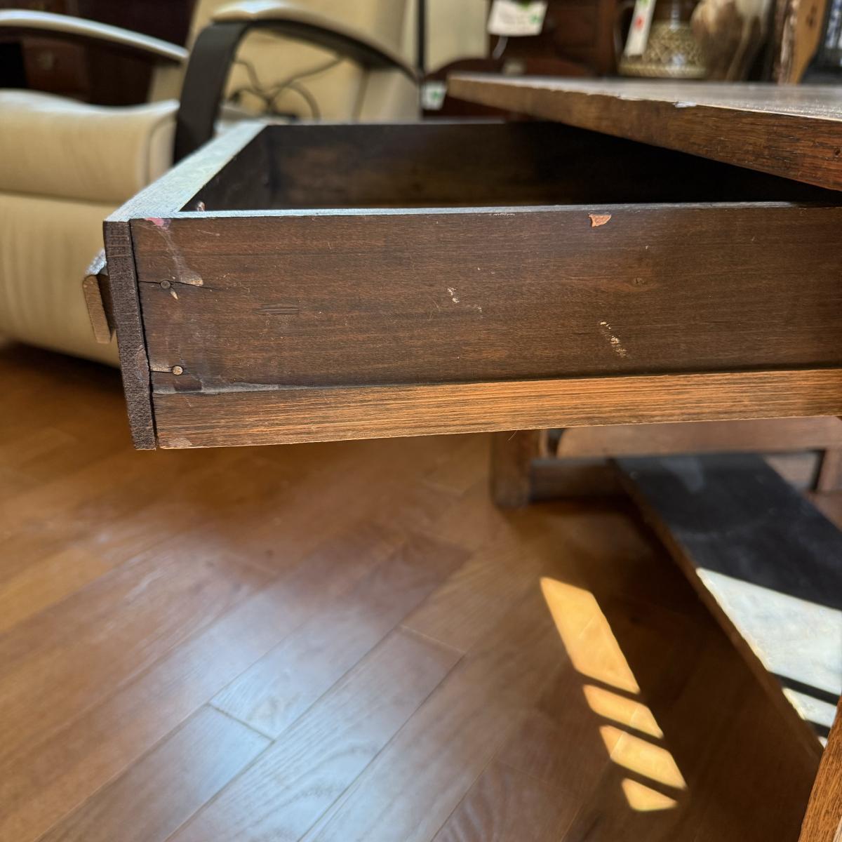 Lot includes one wooden coffee table with one drawer. The coffee table has two pieces that are broken, see pictures included. The table measures 42” x 24.5” x 20.5”H. Local pickup only.