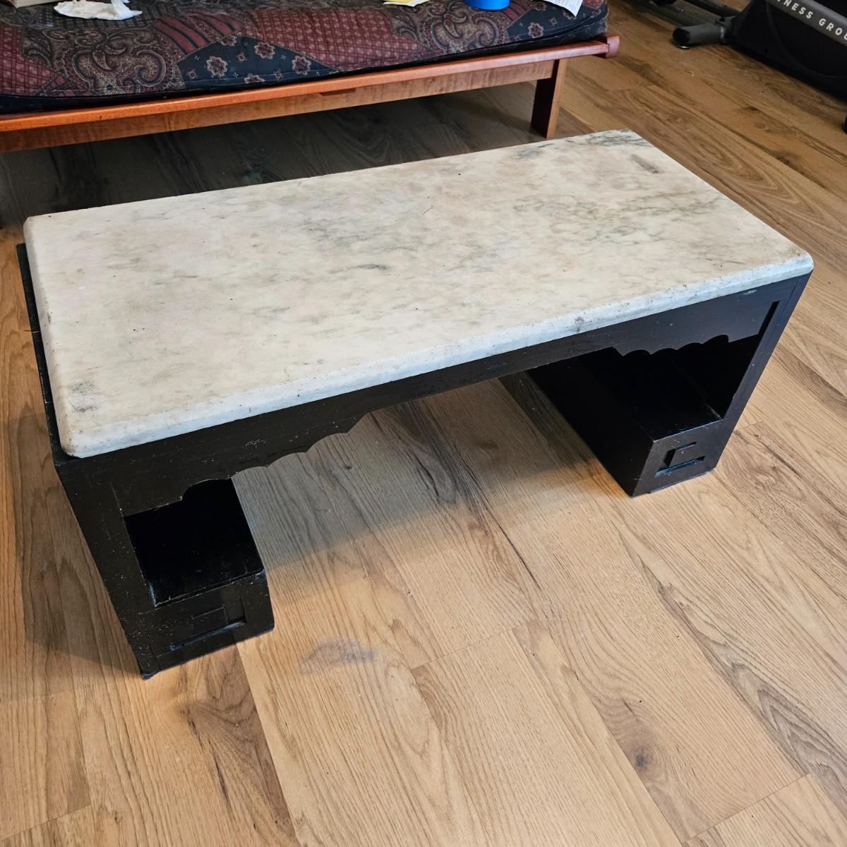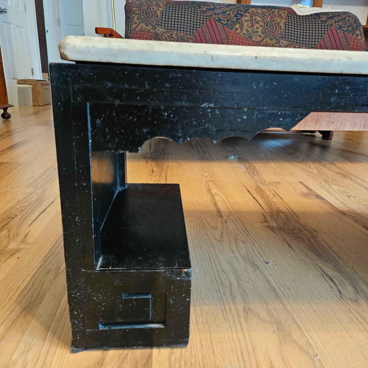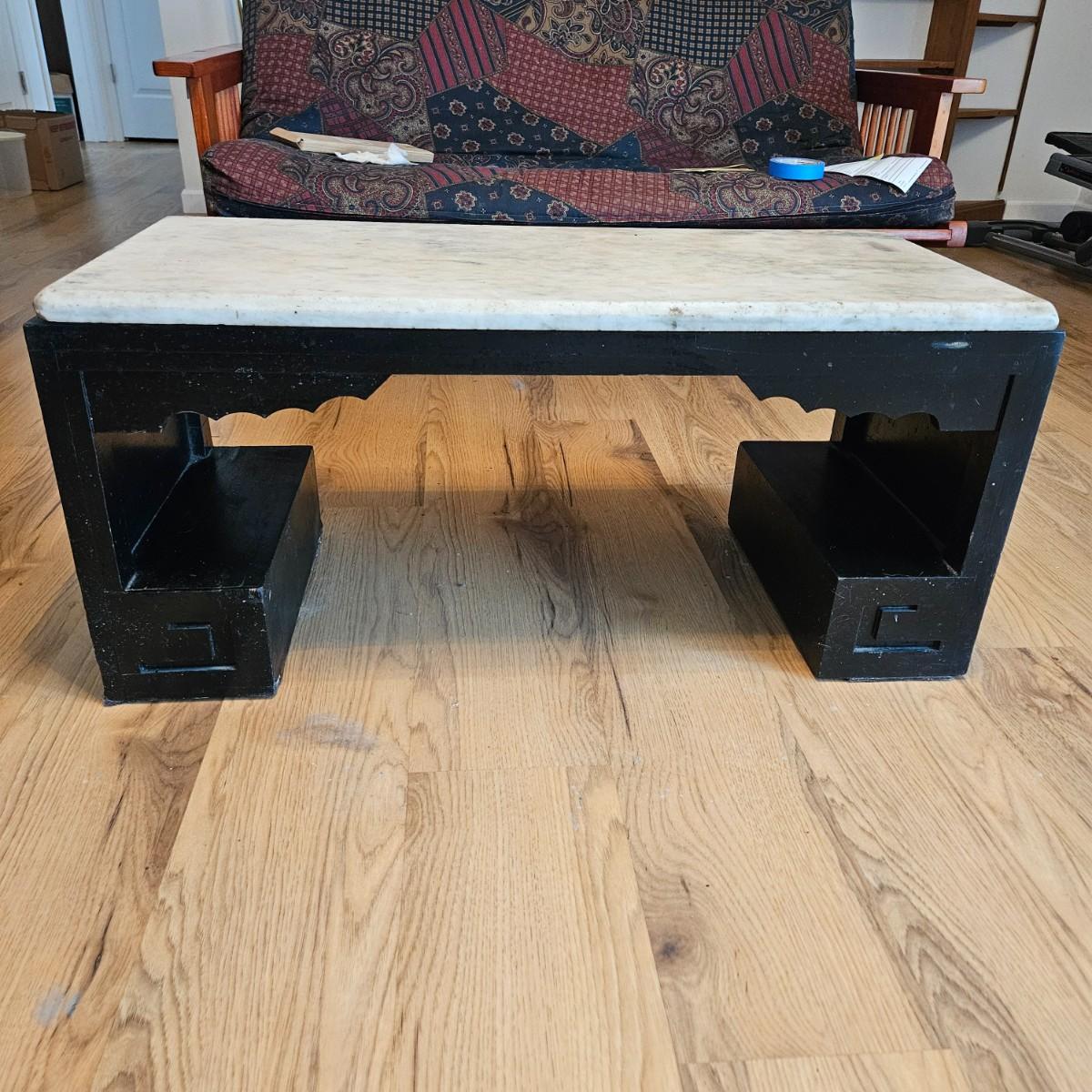 A solid wood coffee table with a unique carved design, that has a detachable marble top. It measures approximately 36" x 16" x 16.5"H. There is some veneer missing on one side of the table, see photos. Local pickup only. Winning bidder must bring assistance to help move and load this item due to its weight and/or size.