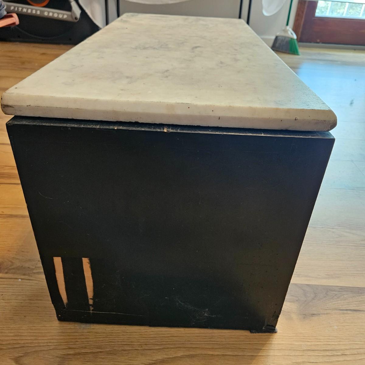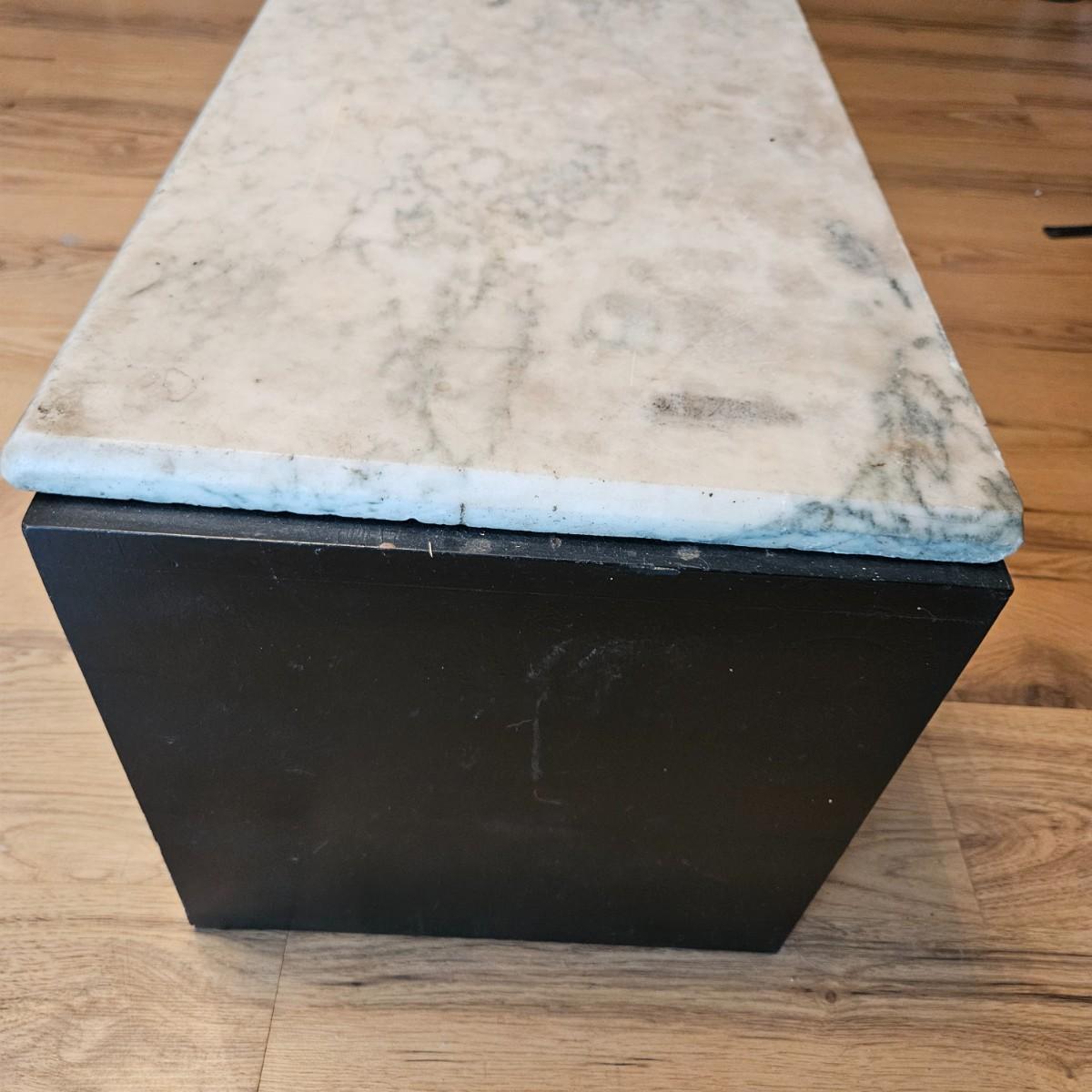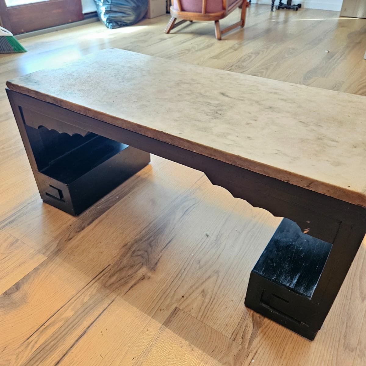 A solid wood coffee table with a unique carved design, that has a detachable marble top. It measures approximately 36" x 16" x 16.5"H. There is some veneer missing on one side of the table, see photos. Local pickup only. Winning bidder must bring assistance to help move and load this item due to its weight and/or size.