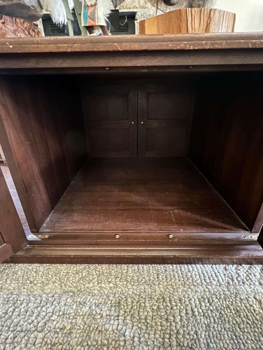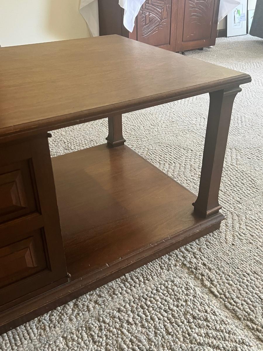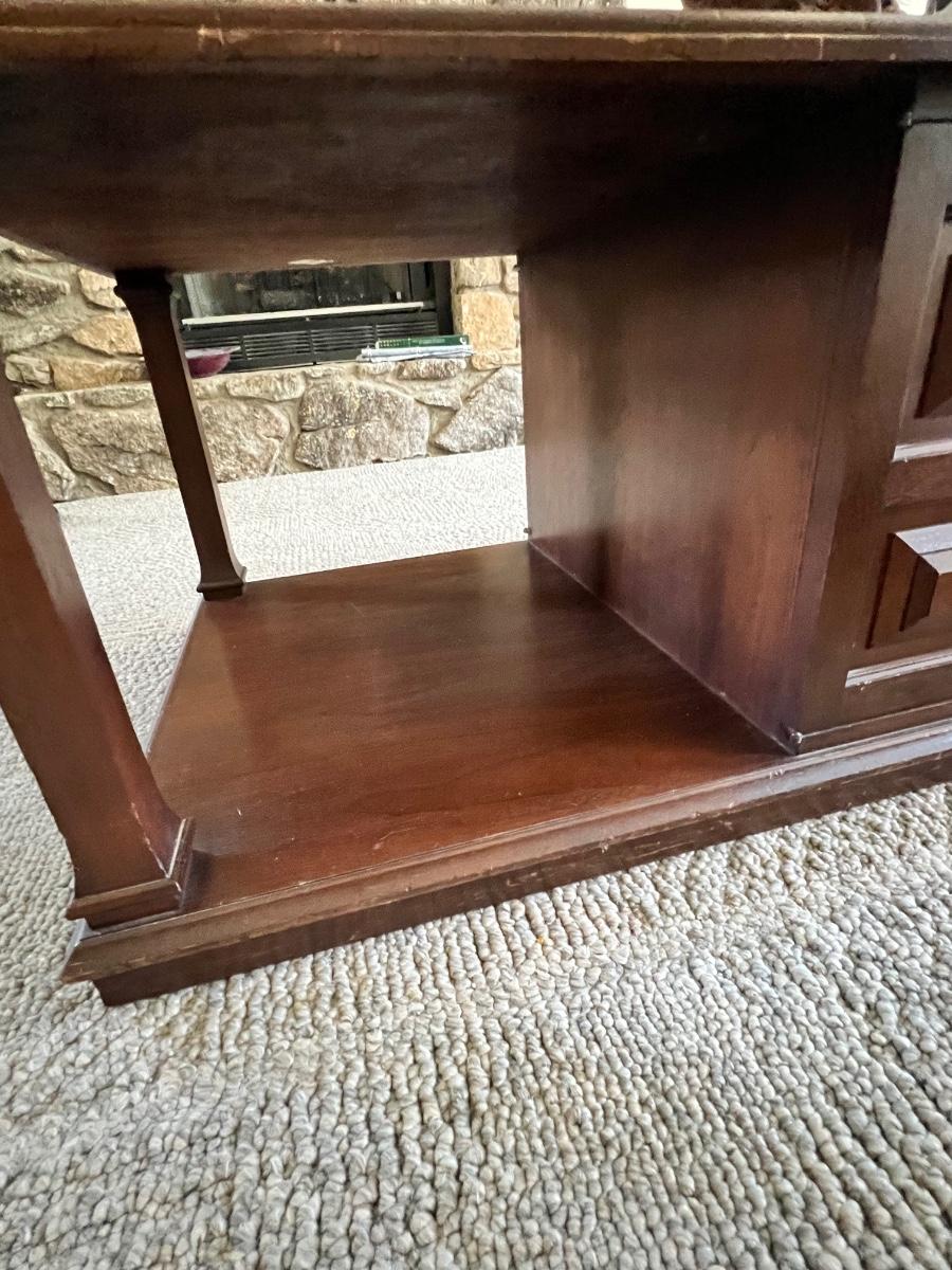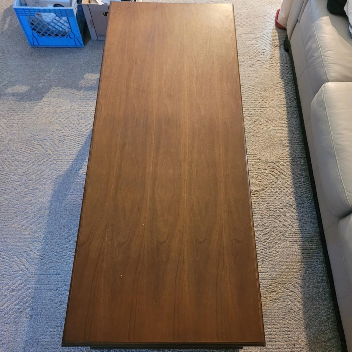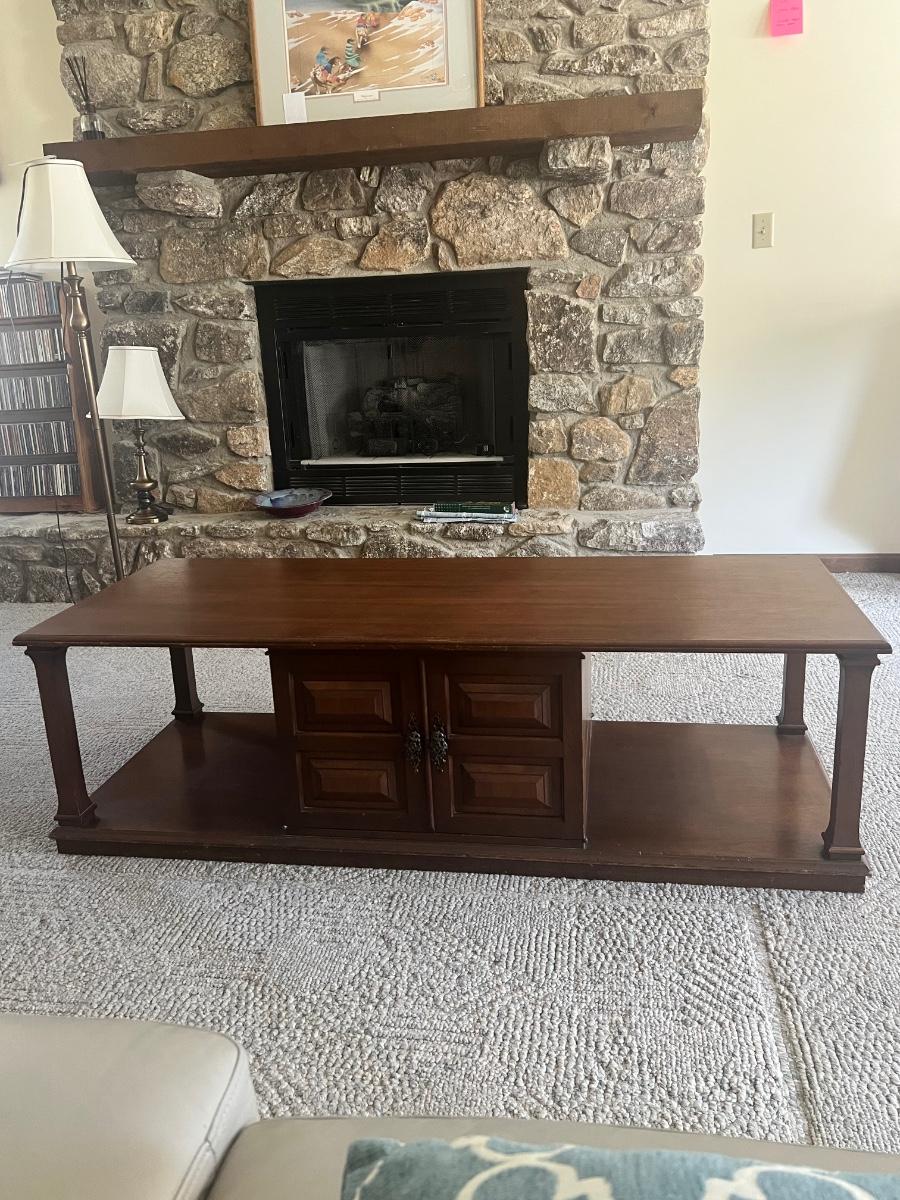 Large solid wood coffee table has a middle cabinet flanked by two open shelf areas. Has a few minor scuff marks and scratches shown in photos.