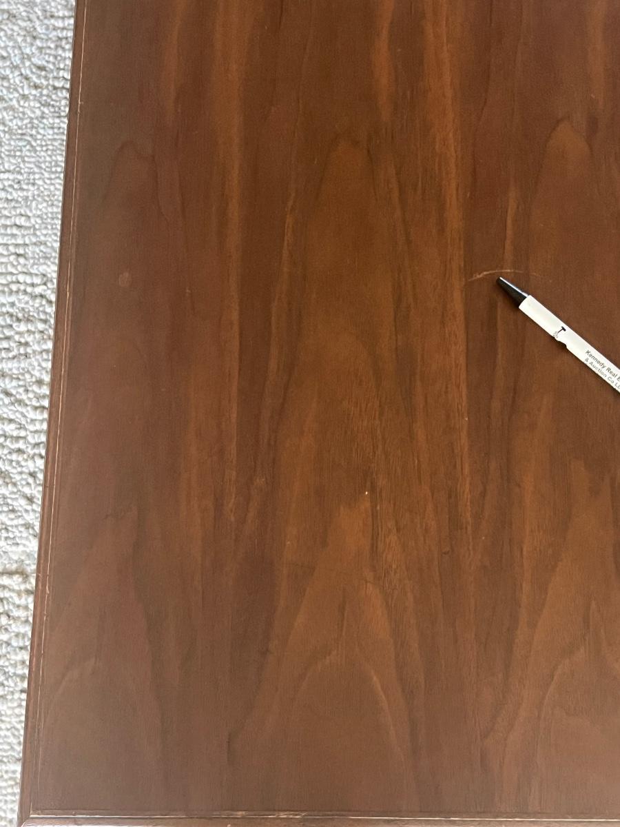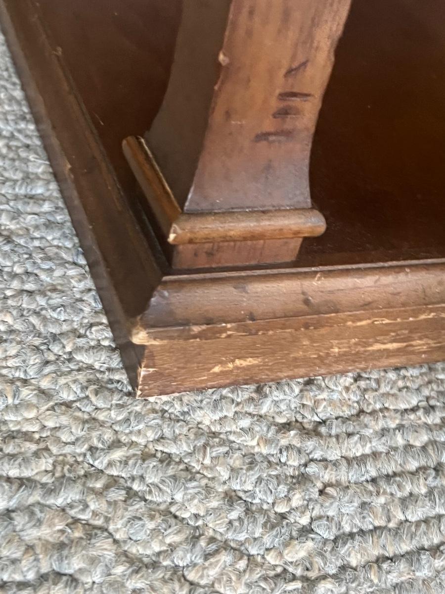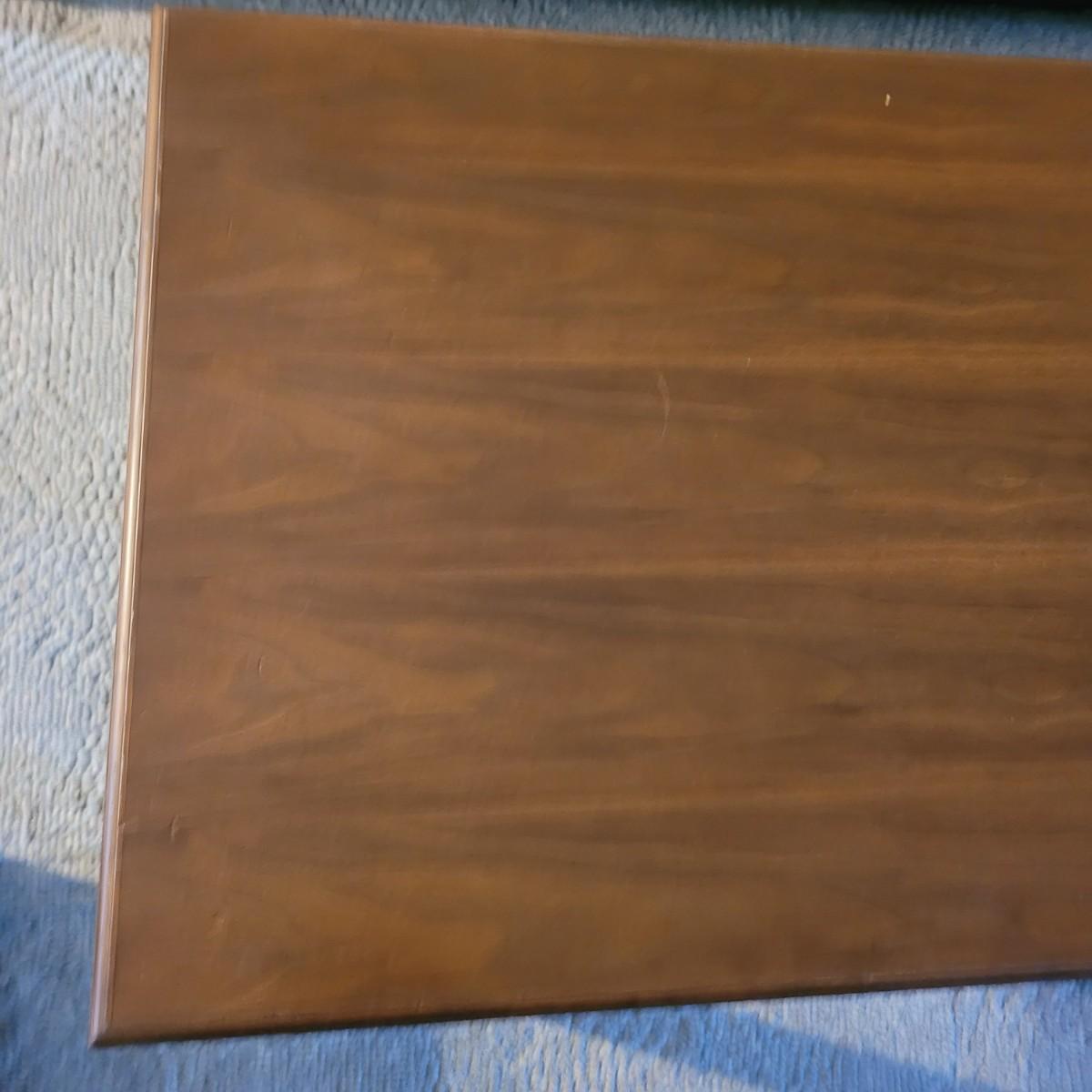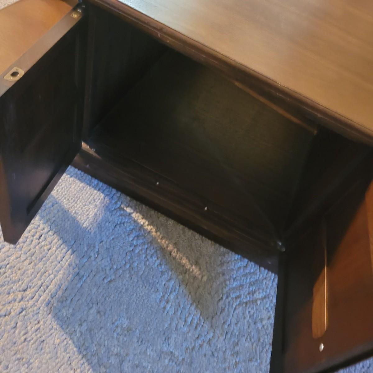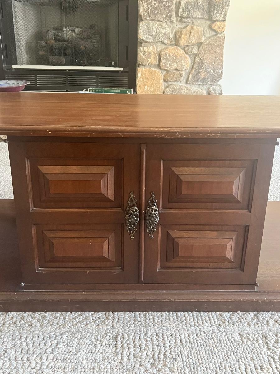 Large solid wood coffee table has a middle cabinet flanked by two open shelf areas. Has a few minor scuff marks and scratches shown in photos.