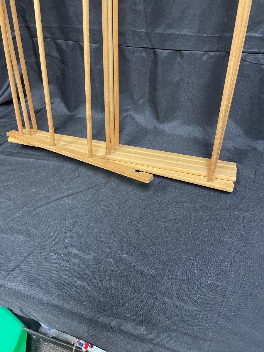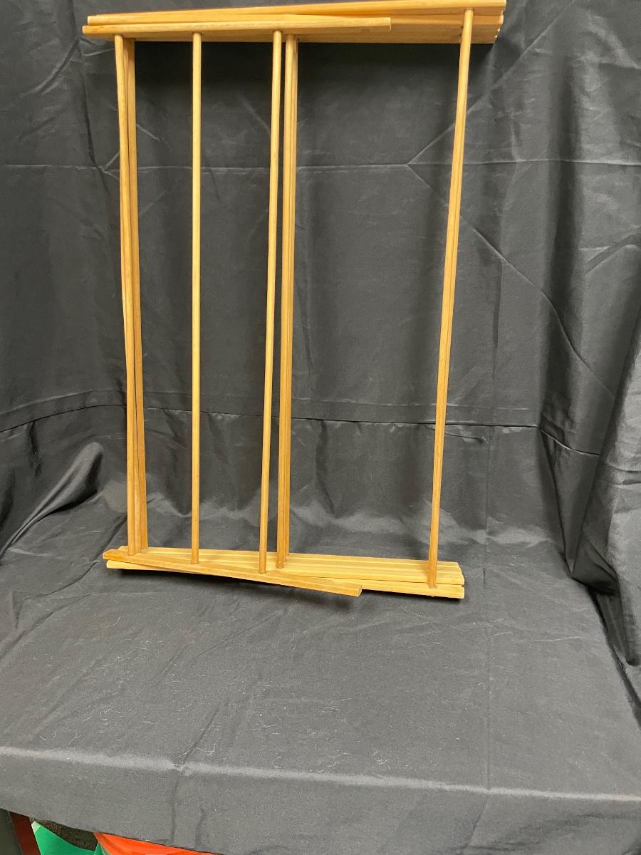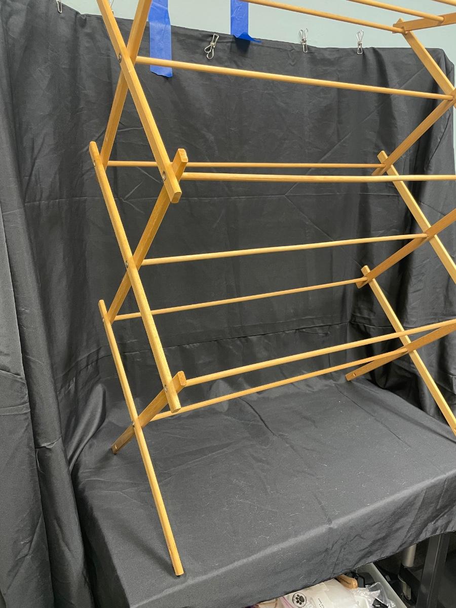 Wooden Collapsible Clothes Drying Rack. Measures 29" tall, 26" across, and 16" deep. Good used condition.
