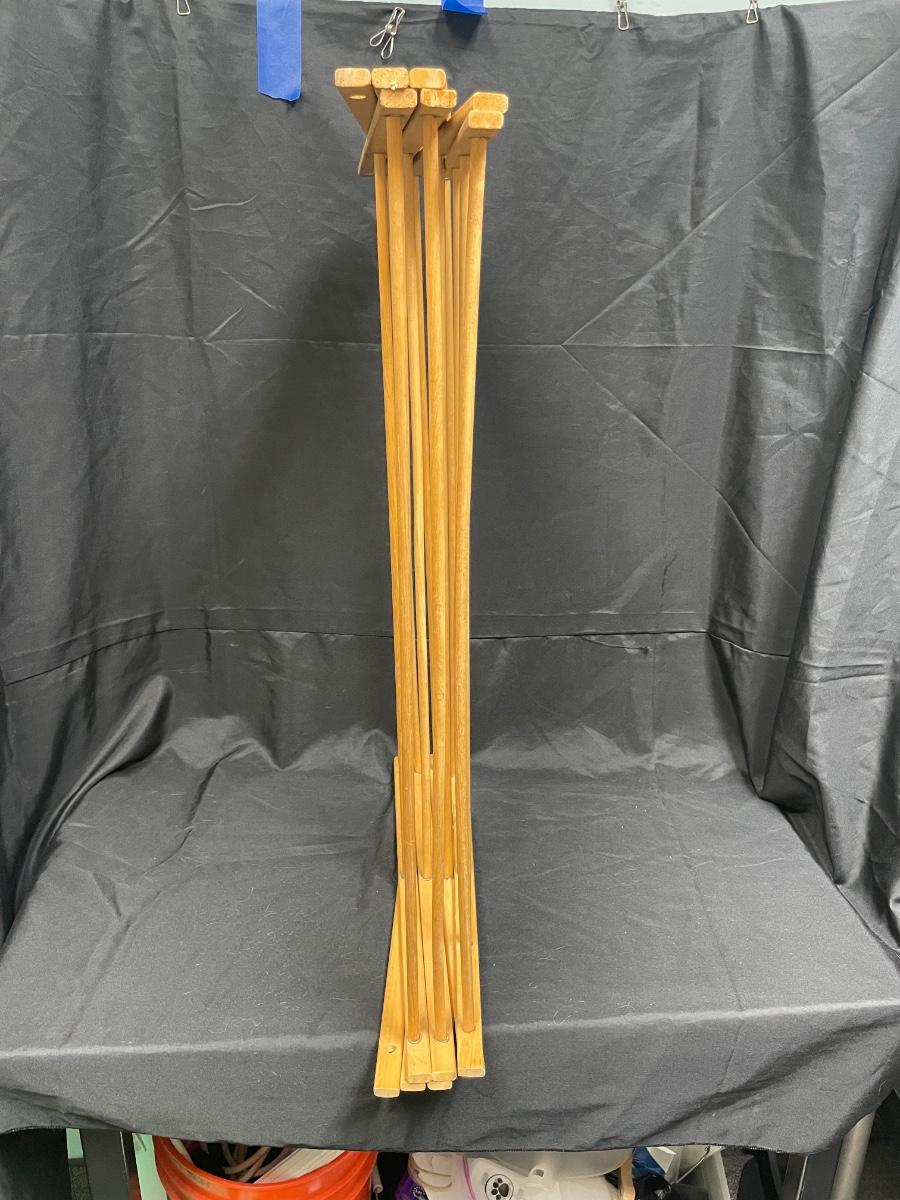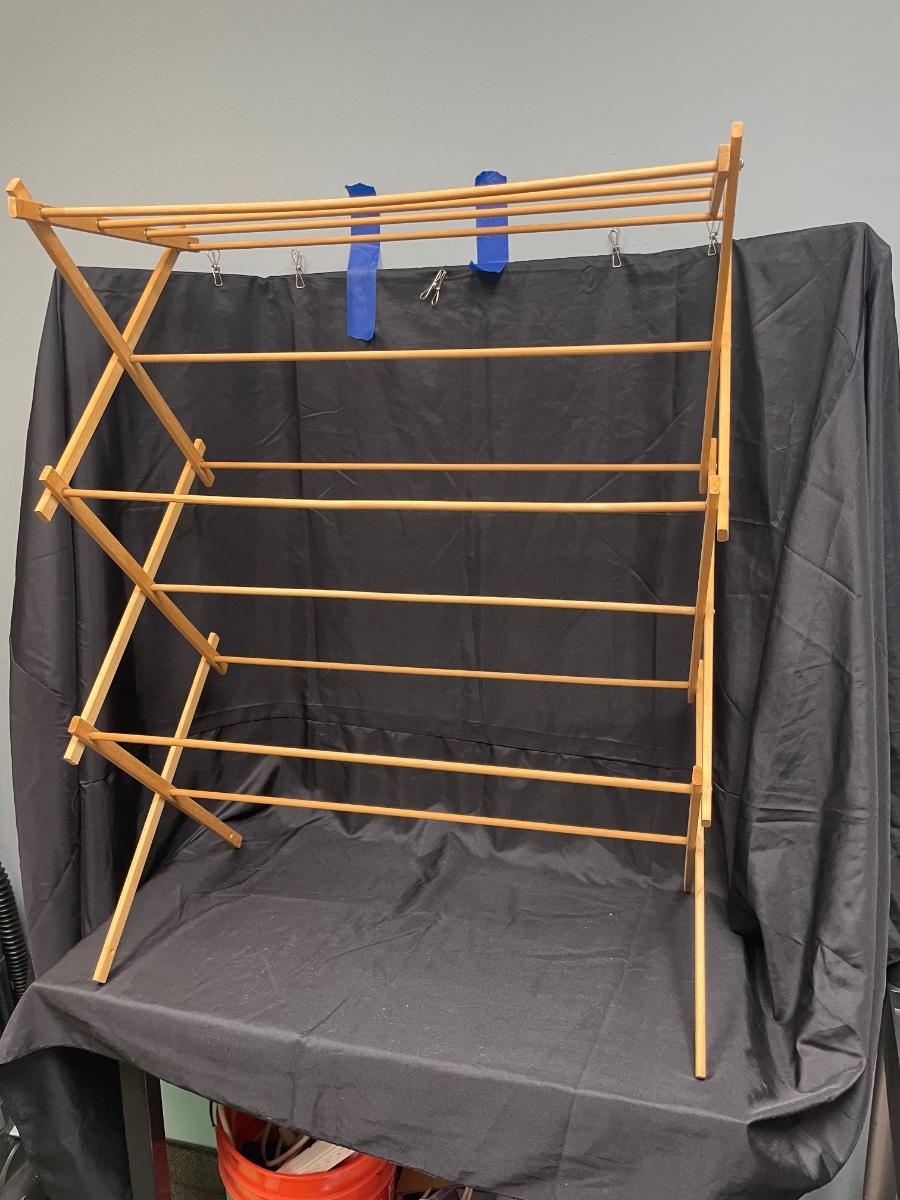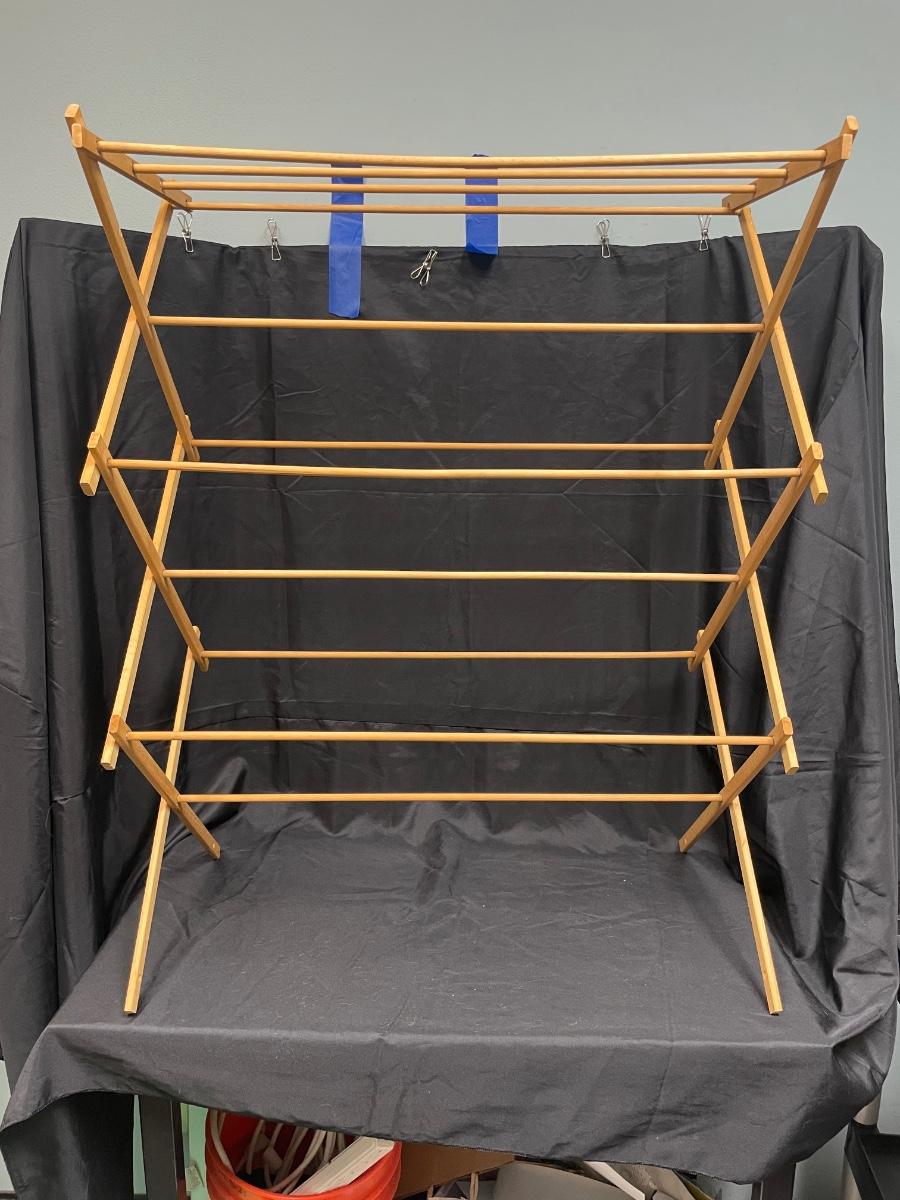 Wooden Collapsible Clothes Drying Rack. Measures 29" tall, 26" across, and 16" deep. Good used condition.