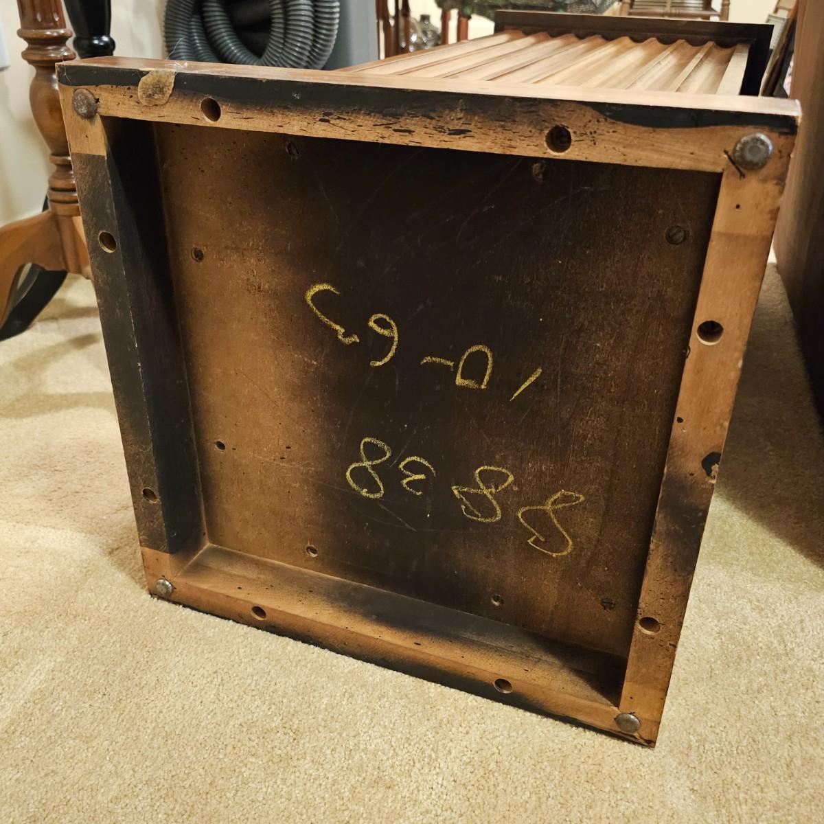 Tall wooden column pedestal with wide fluted dedign on all four sides. Flat top, single door opens to reveal inside for storage, no shelves. Item measures 15.5" x 15.5" x 36"H. Some blemishes on sides of column. See photos for details. Local pickup only.