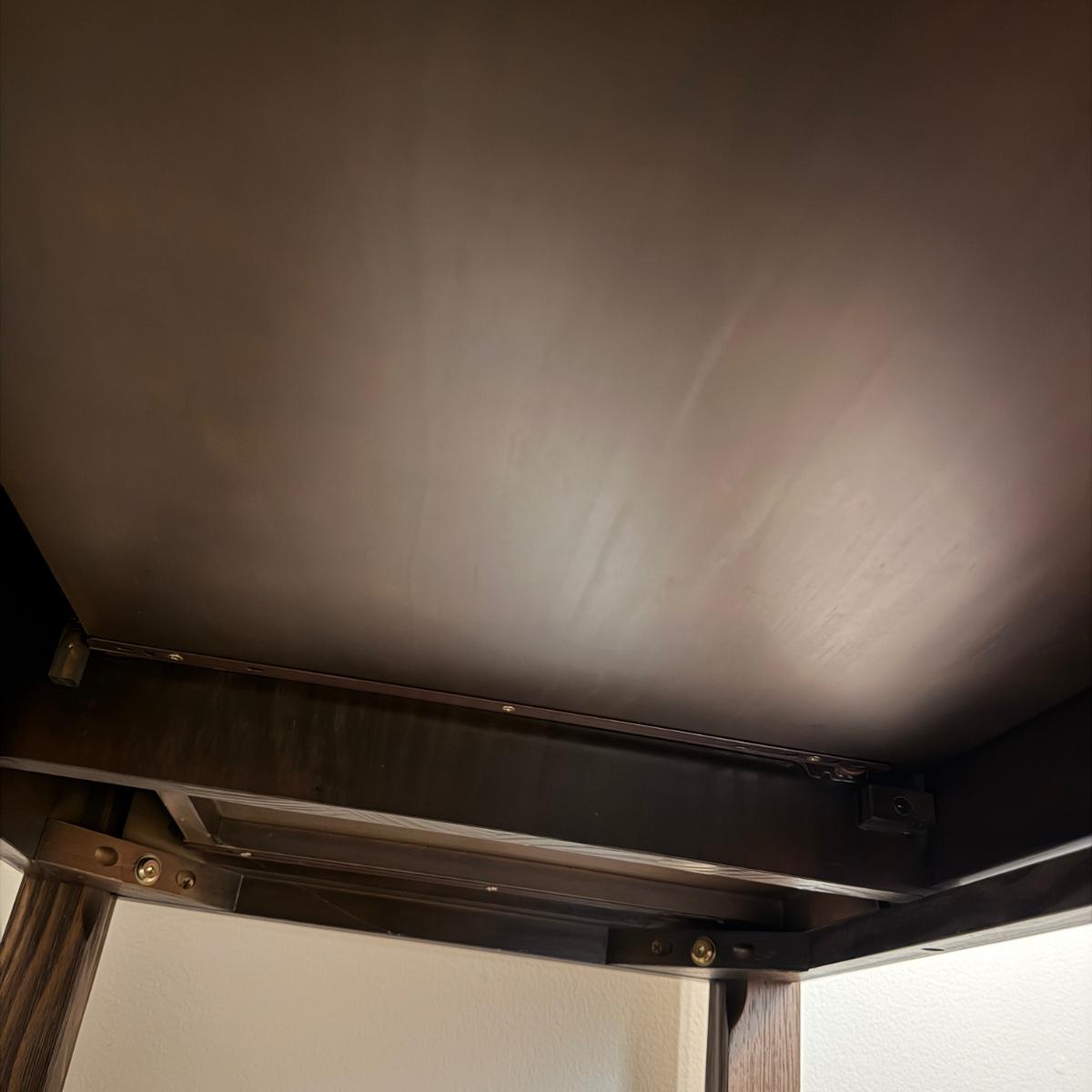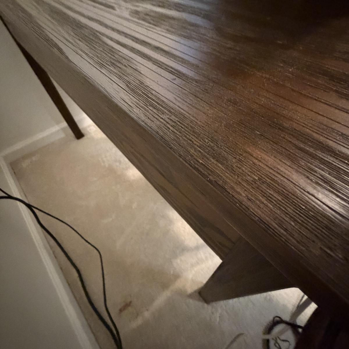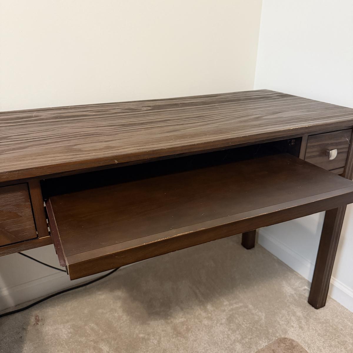 This wooden computer desk appears to be solid wood with a keyboard drawer and two small drawers. Desk measures 47” x 20” x 29”H. Desk has scratches and nicks on the top, see pictures.
