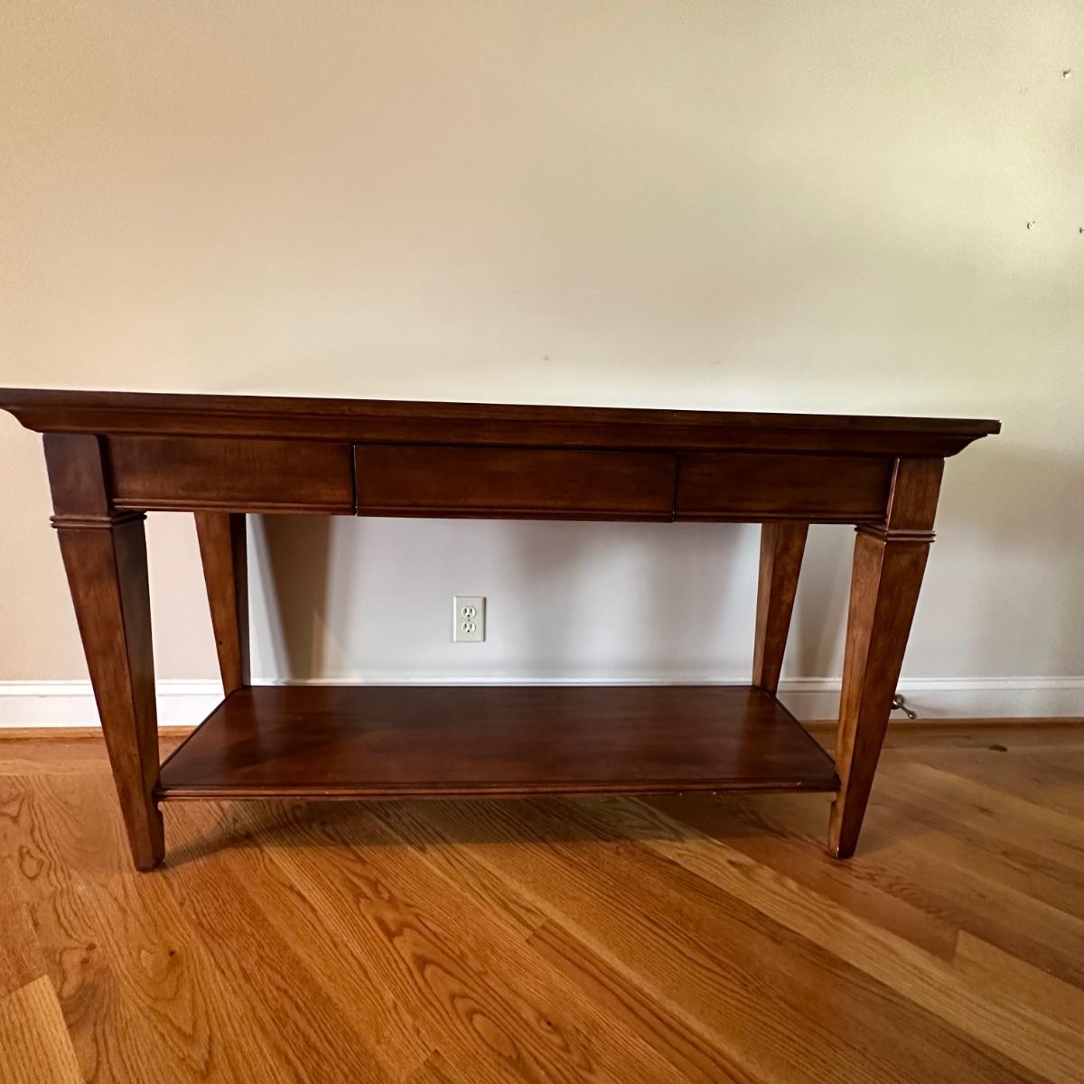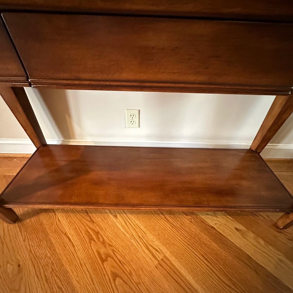 Wooden console table with 1” beveled glass top and one center front drawer. Measures 54” x 20” x 31”H.