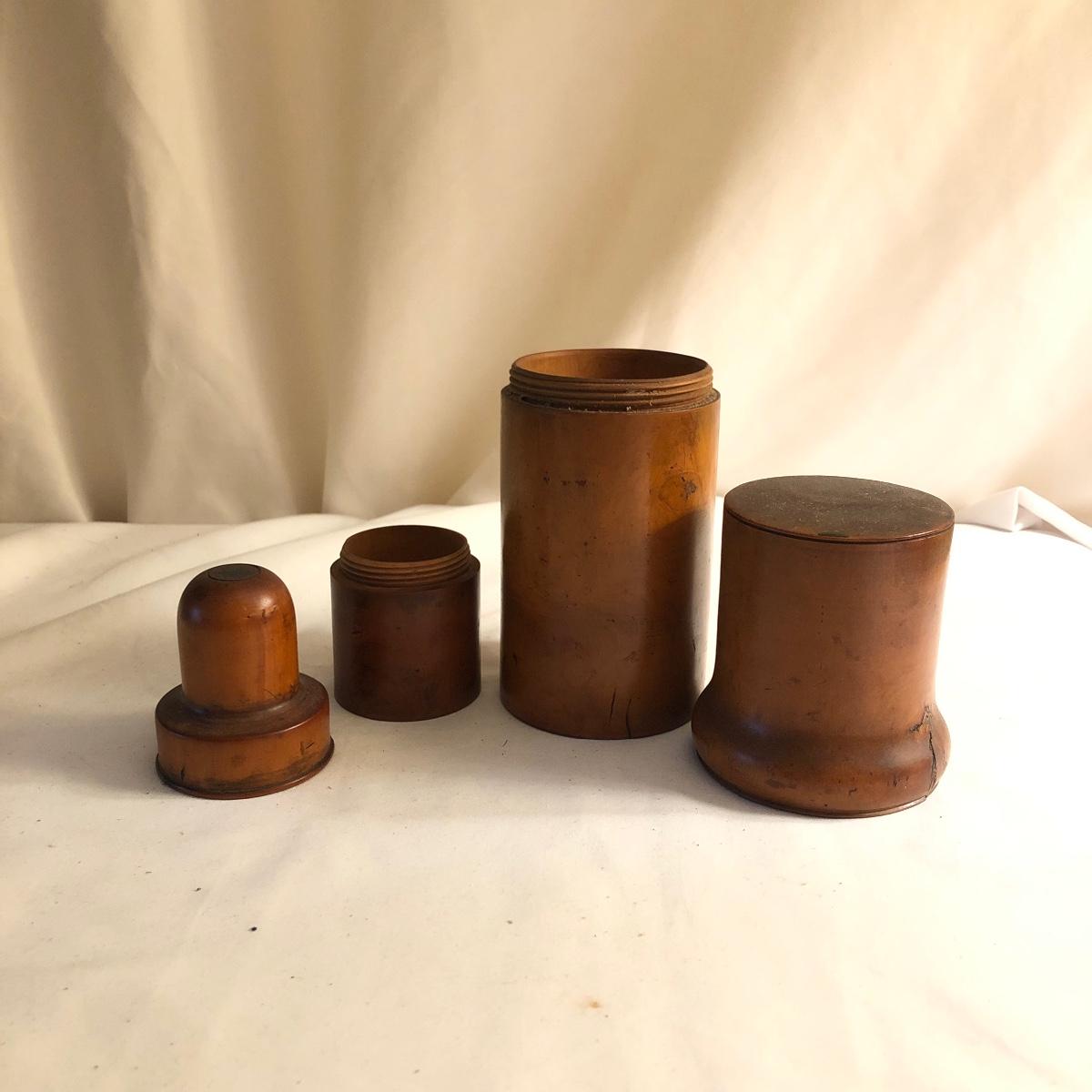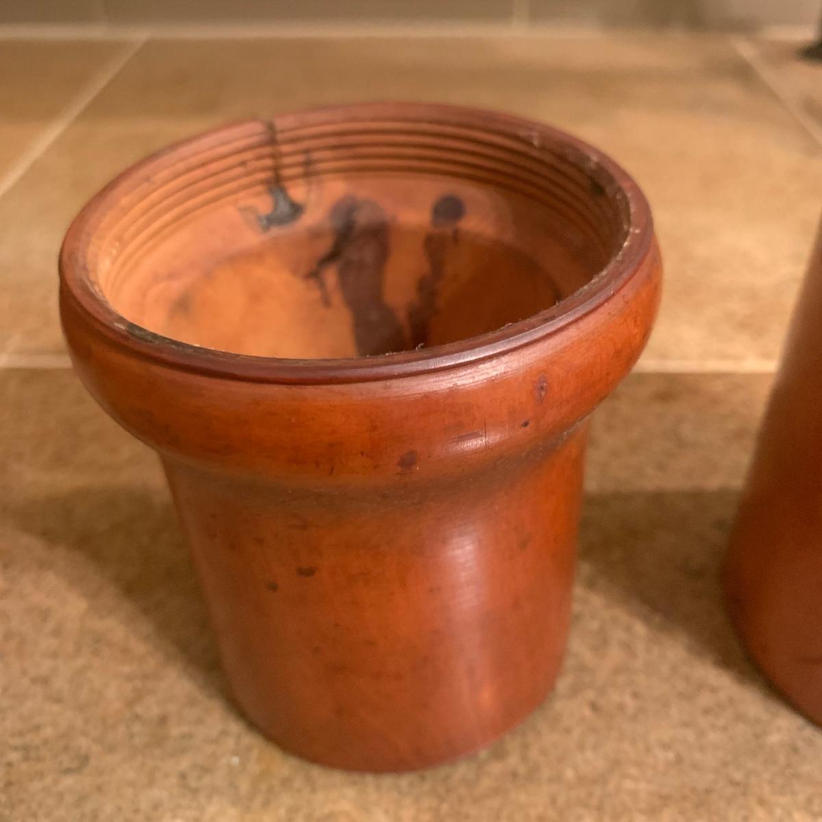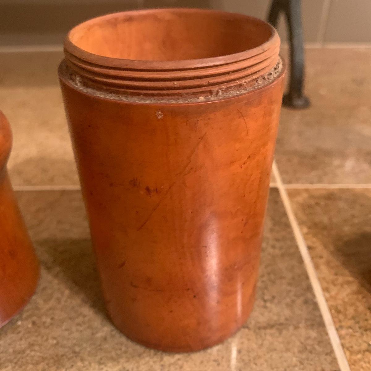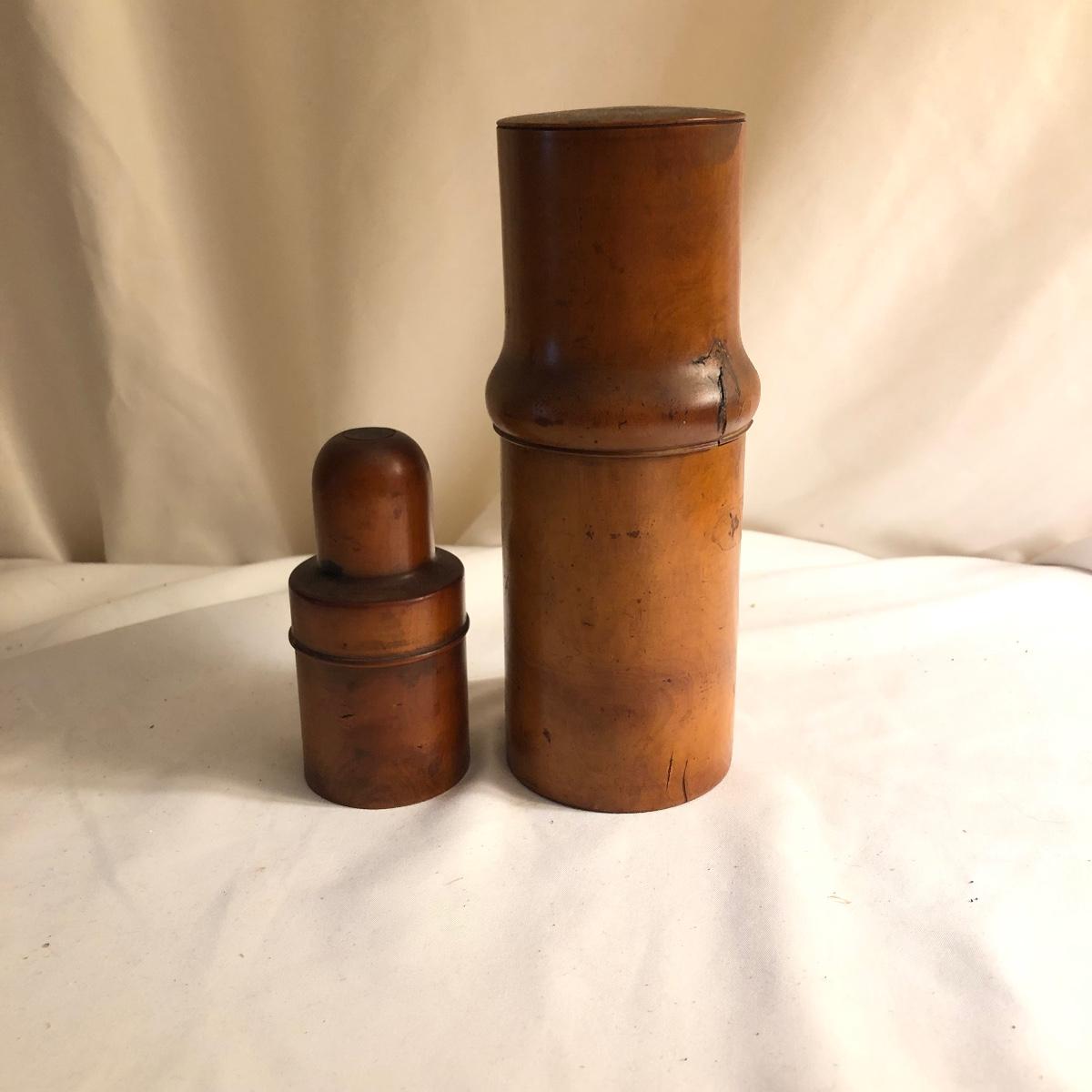 This pair of wooden screw top containers are in good condition. One measures 8” tall, and the other measures 4” tall.
